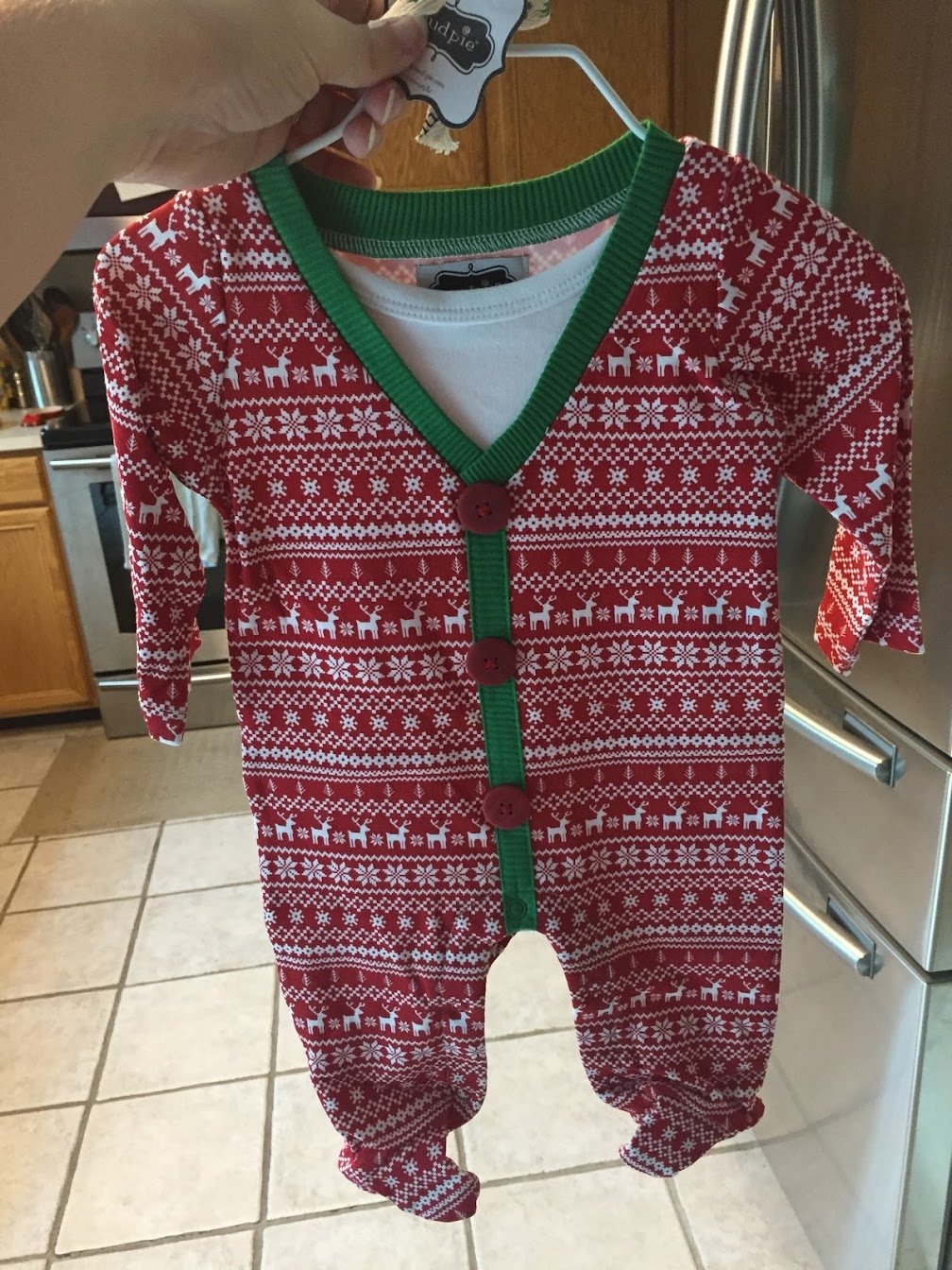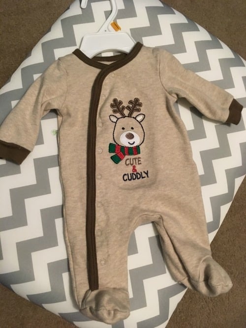 I don't have a coming home outfit yet, but this is his Christmas outfit, honestly I'll probably buy like 3 more - I love Christmas baby clothes! We're doing a super casual Christmas at home.