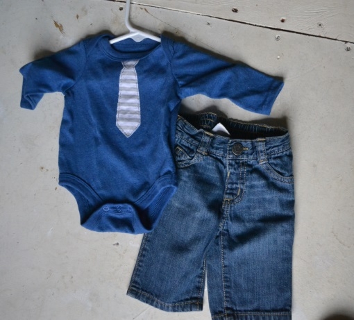 I also really love this onesie with a tie + tiny jeans we found at a thrift store: