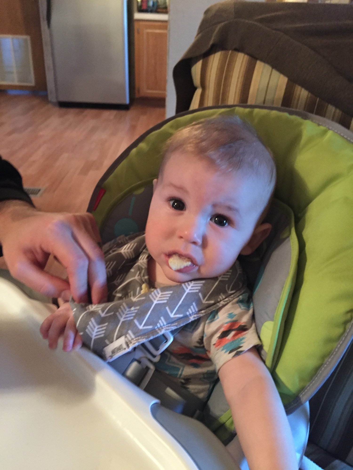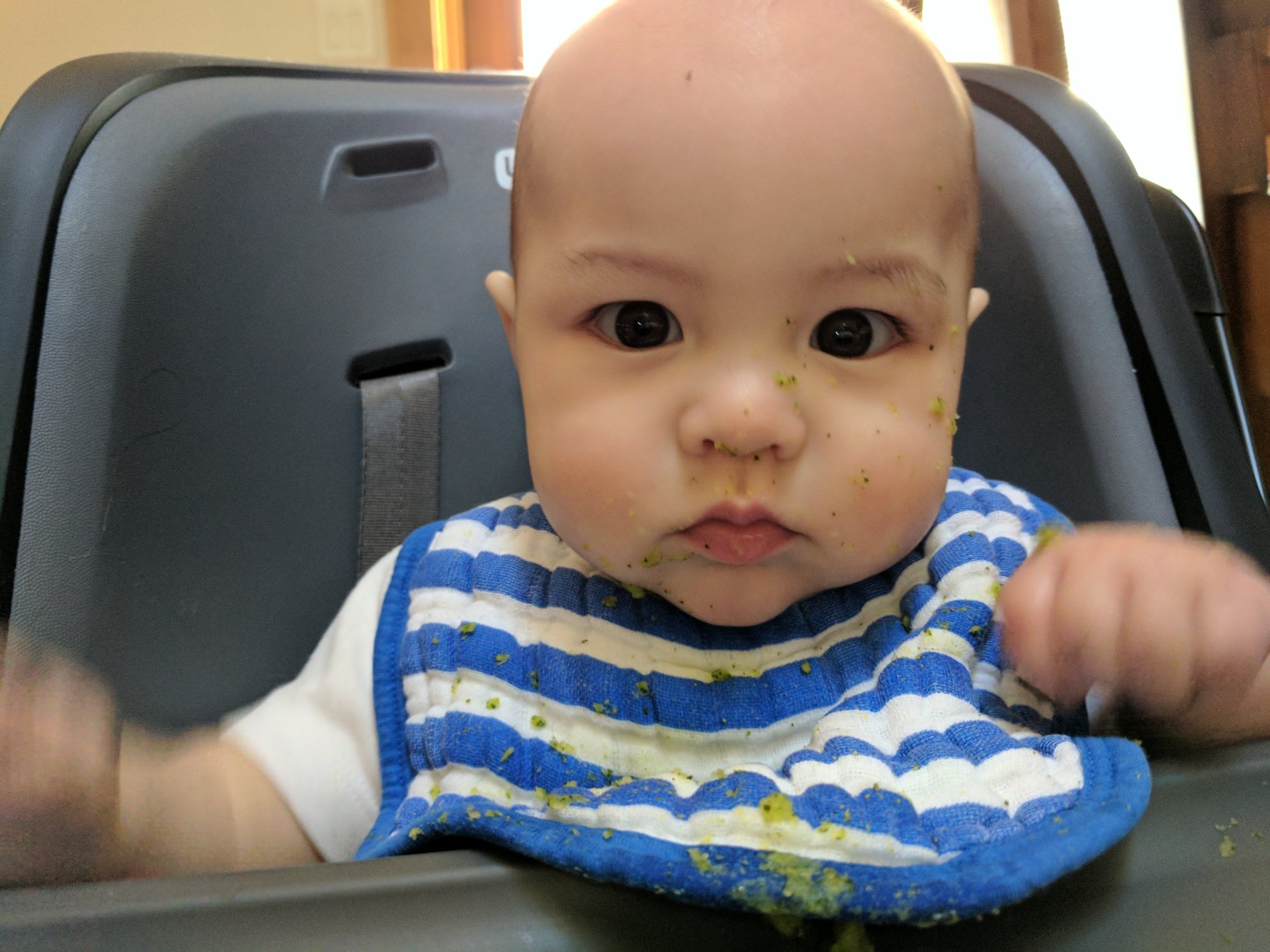Tristan trying zucchini for the first time. Some food actually made it in if you can believe it.