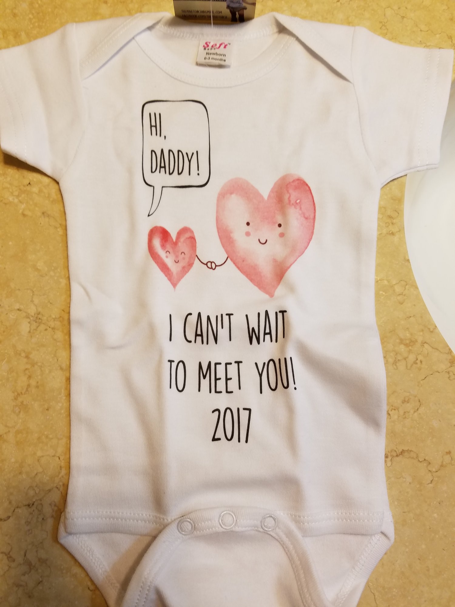 @Colleen0516 I'm going to wait until he comes home from work for lunch, or when he gets off work tonight. We're constantly getting stuff in the mail from Amazon so I'm going to put this onesie in a small package and have him open it. I bought it on Etsy a while back, in hopes this day would come!