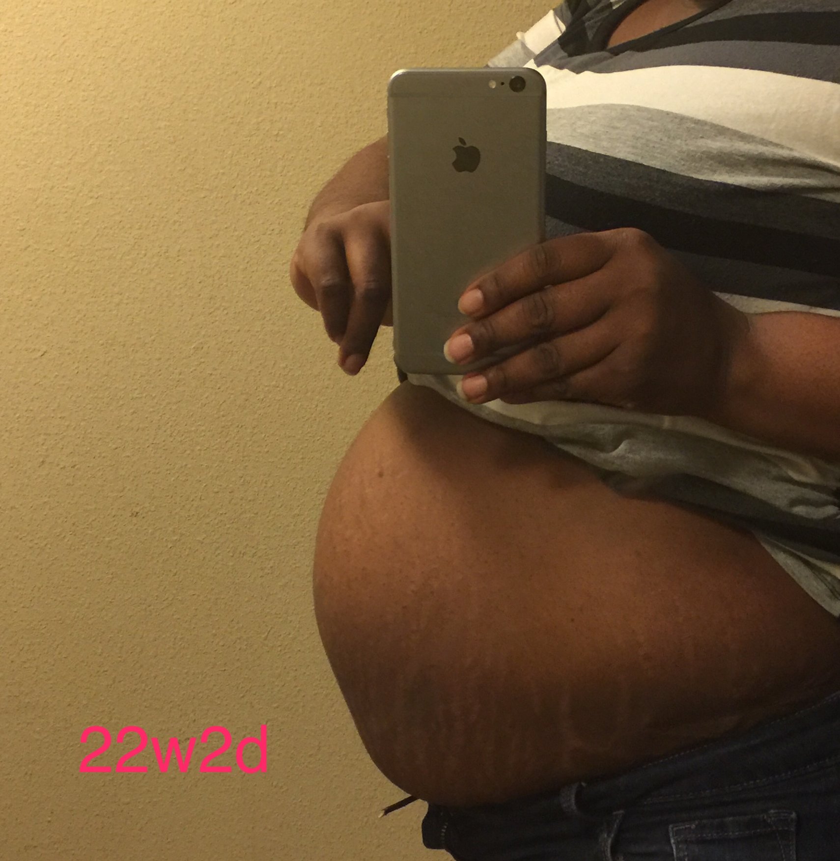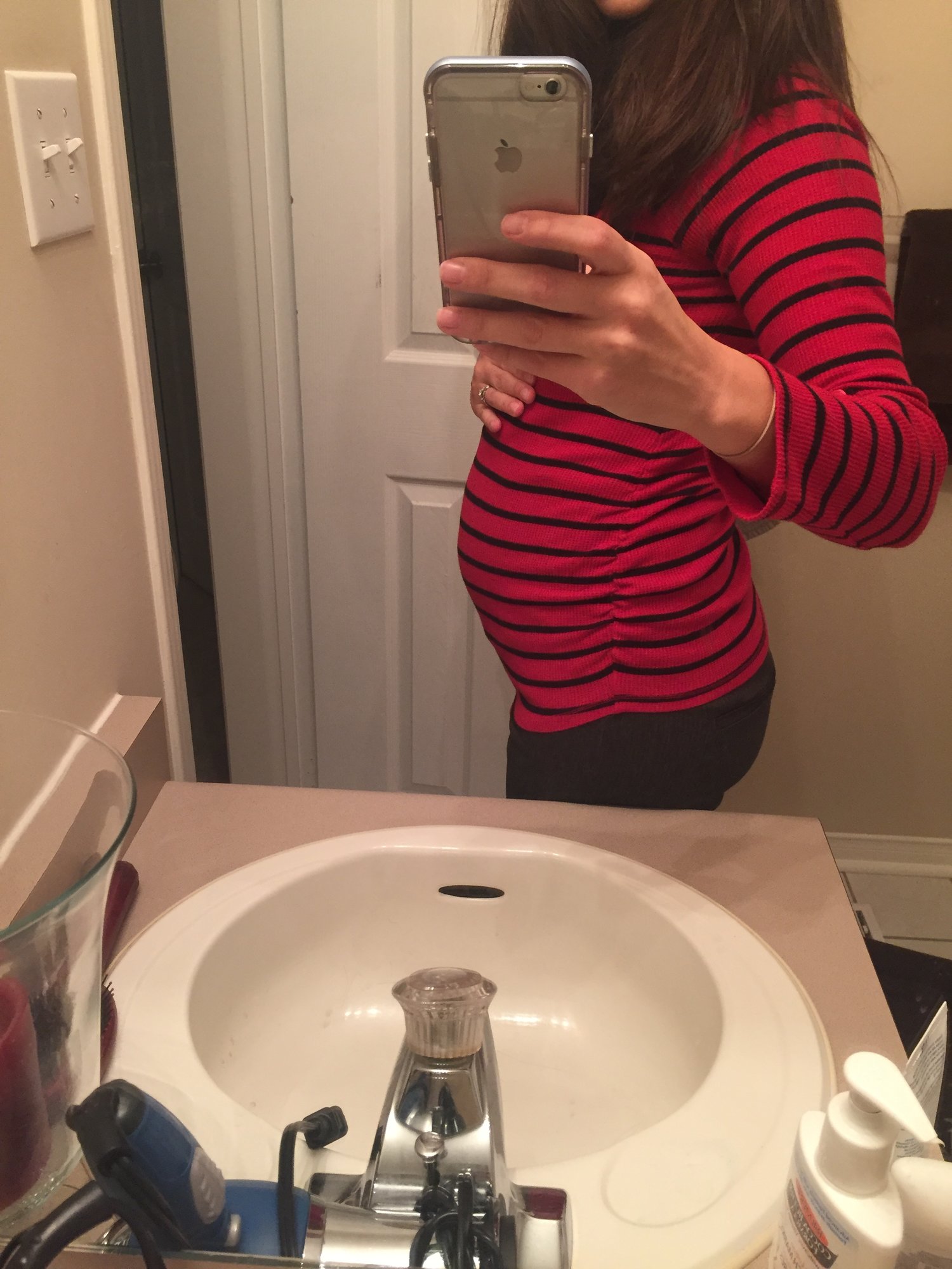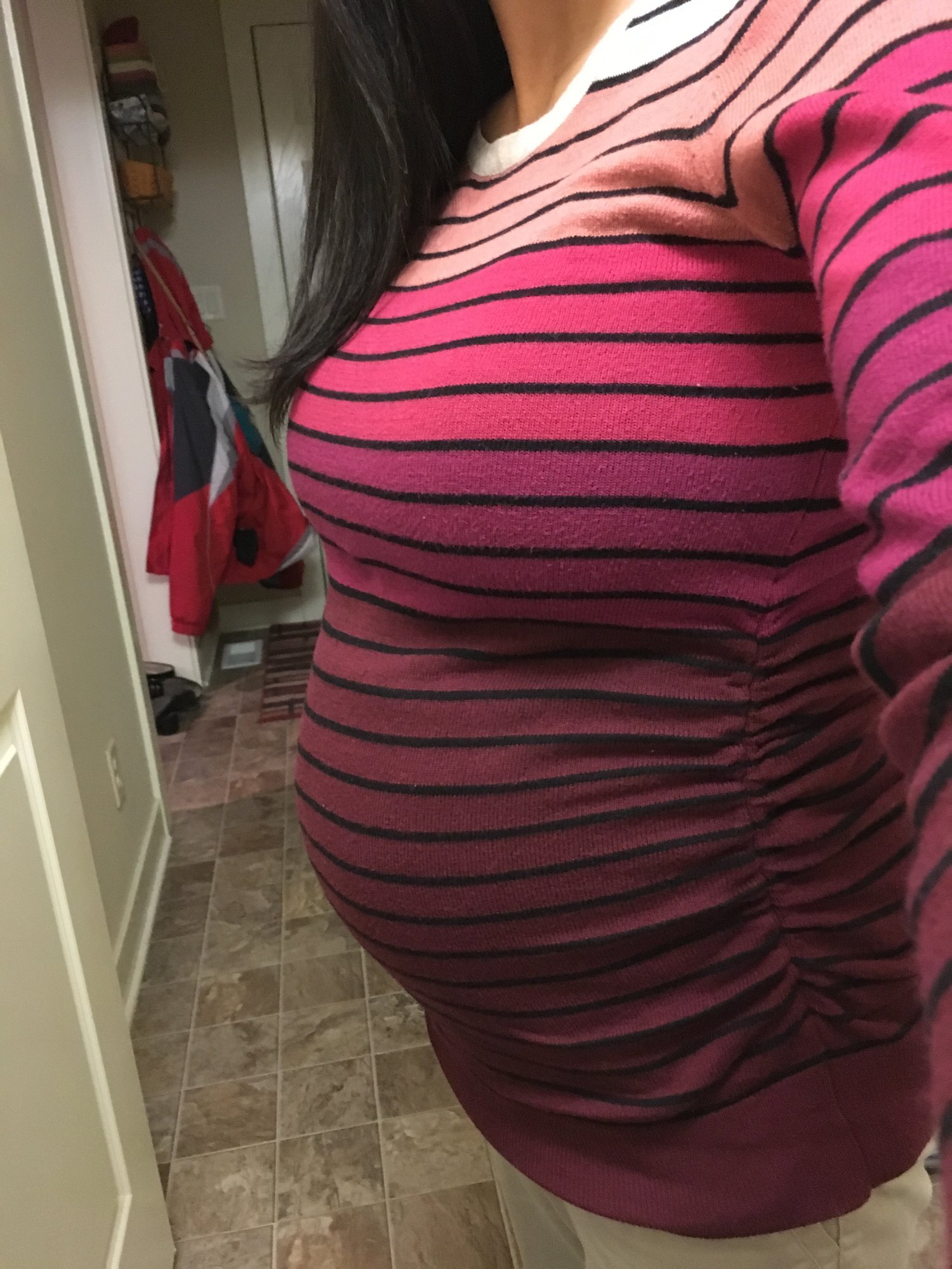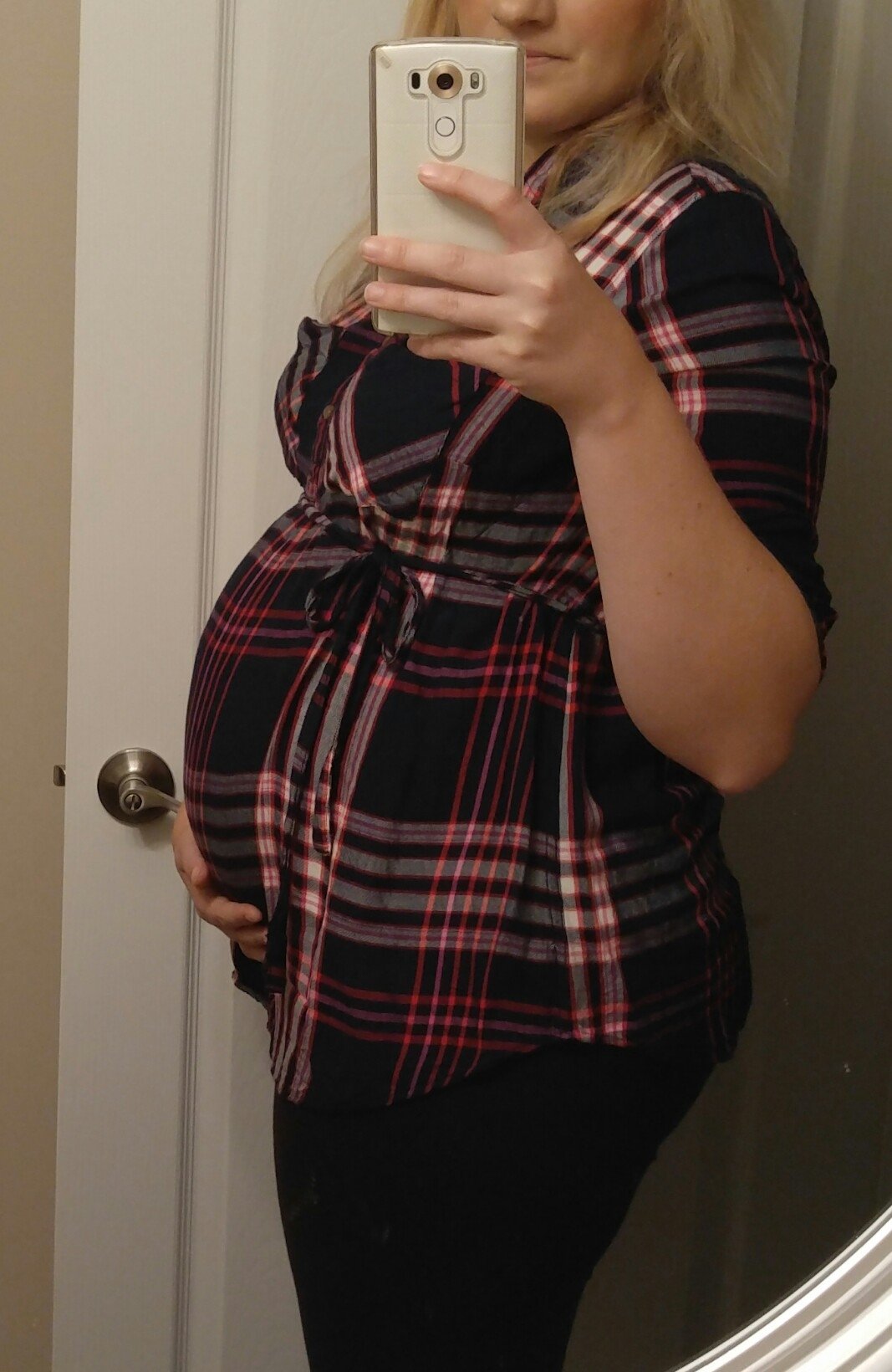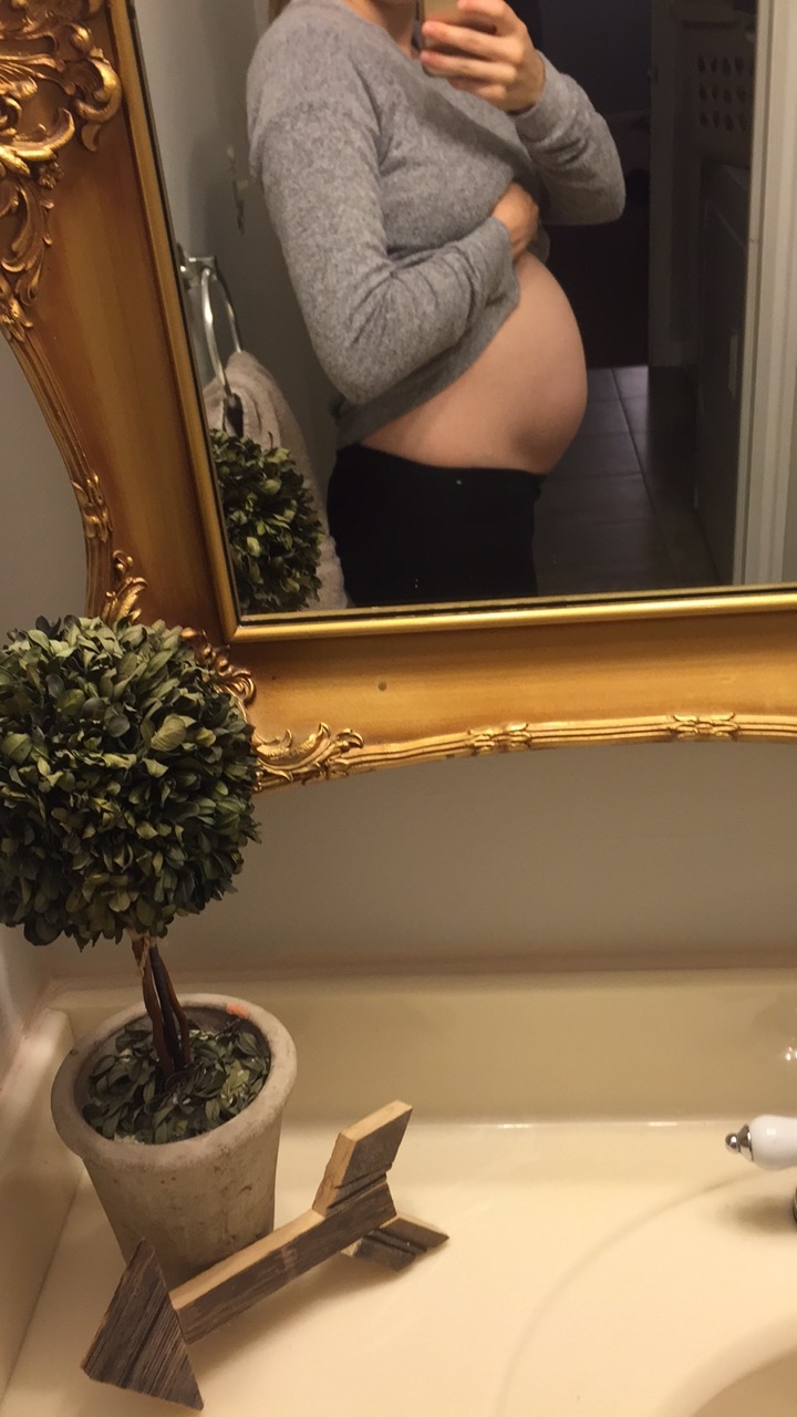 Third Time Mom , 26 weeks on Friday! The sweater made me look twice the size so y'all get bare belly and can you tell my boobs are almost as big as my belly?! Goodness me, they can stop growing any day now. *edit to explain bare belly