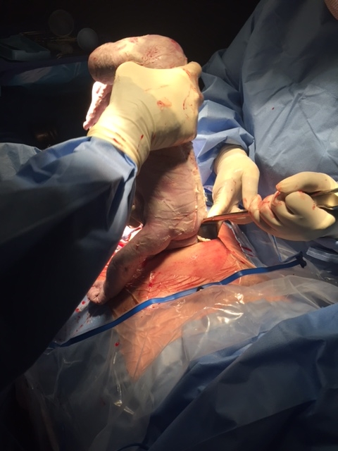 I think our OB's practice did an amazing job with the c-section. Of course, there are the fun dehumanizing aspects, like me being splayed out naked in front of the whole team while they were prepping my anesthesia and getting things draped. But at this point, who HASN'T seen my cooch, right? So they pull up the curtain and DH comes in to sit next to my head. I was surprised I could feel the pressure of the procedure and kind of figure out what they were doing. Like I knew when they used spacers to keep my stomach open. And I could feel them rooting around - kind of like ferrets digging in my belly. Finally the OB gave us a 2 minute warning to pull out a camera if desired, and they dropped the drape. I got to see DD2 be pulled from my belly, which was incredible. With my first, I was so tired and pained that I was just out of it when DD1 came out and was put on my chest. This time, I got to see it up close and watch her slowly get worked out of my belly. She was so covered in vernix and blood, that she looked a little zombie-like. And when the provider's tool would touch the vernix, it would scrape it off - at first I thought it was her skin and got freaked out. It was really awesome to see her emerge like that (see photo), and they handed her over to me very quickly. The whole thing was just very patient-centered. Despite my frustrations with our birth plan being pushed off course, this was a very good compromise.