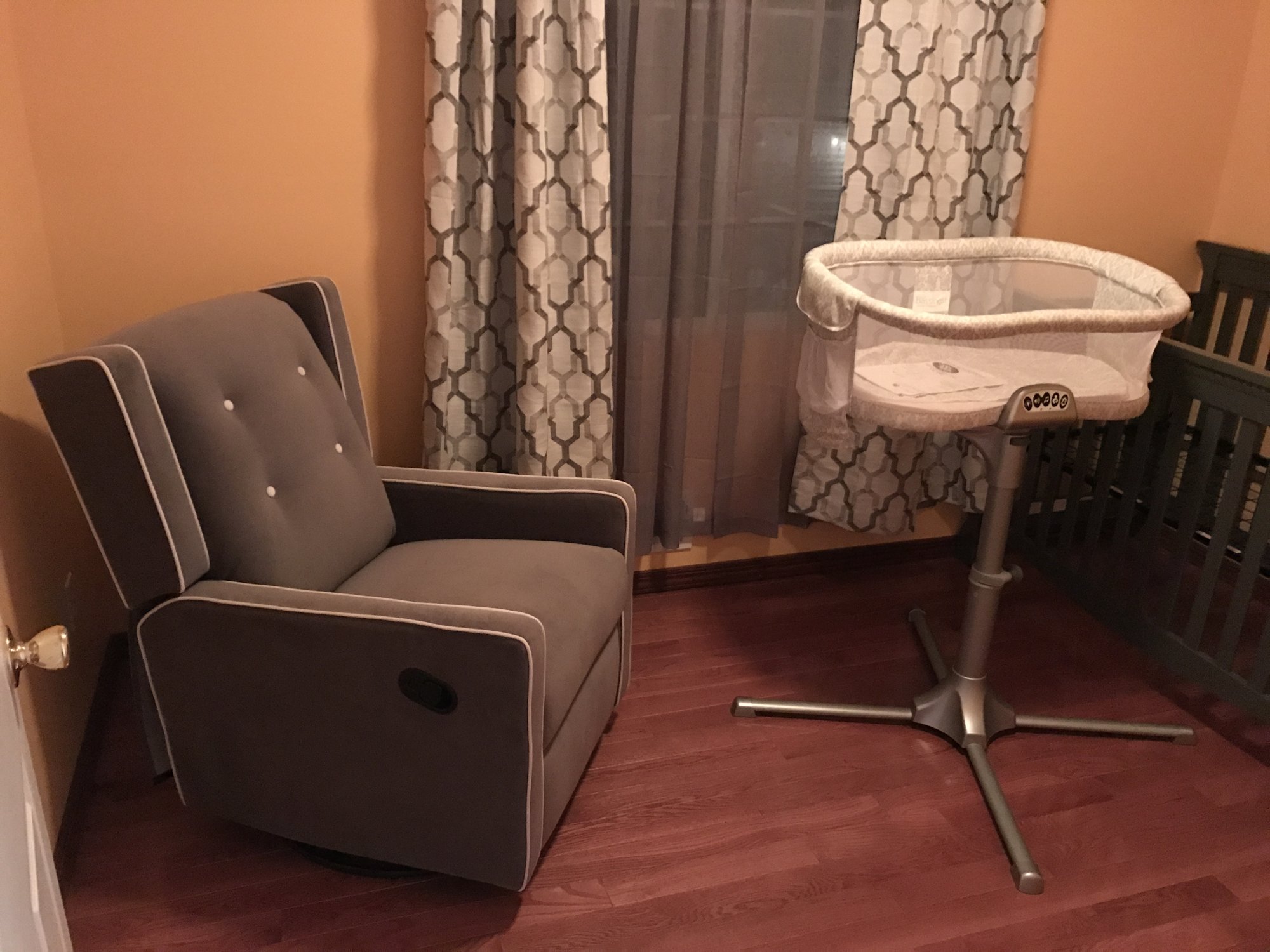 @Knottie1432834683 Love the nursery, looks so cozy! I got the exact same rocker/recliner too! It's so comfy, I love it. Hope you like it too (the bassinet is going into our bedroom)