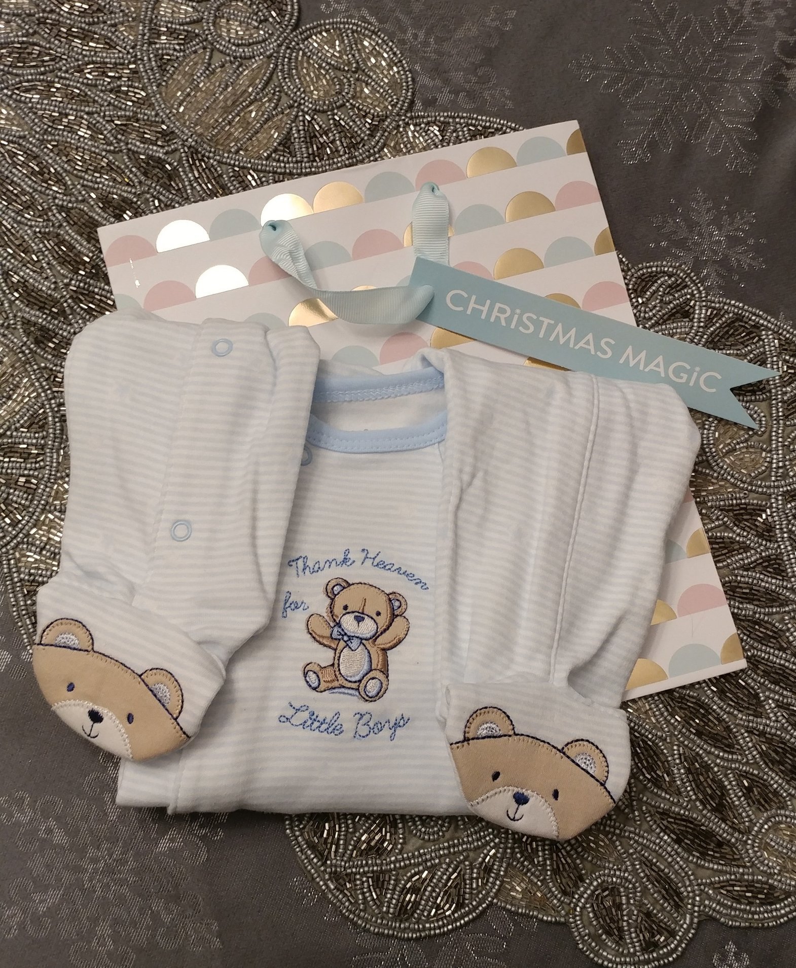 We did our "gender reveal party" last night - actually it was a surprise as my family was coming over to do xmas gift exchange. I wrapped this sleeper in this bag and had my mom open it along with the other gifts.