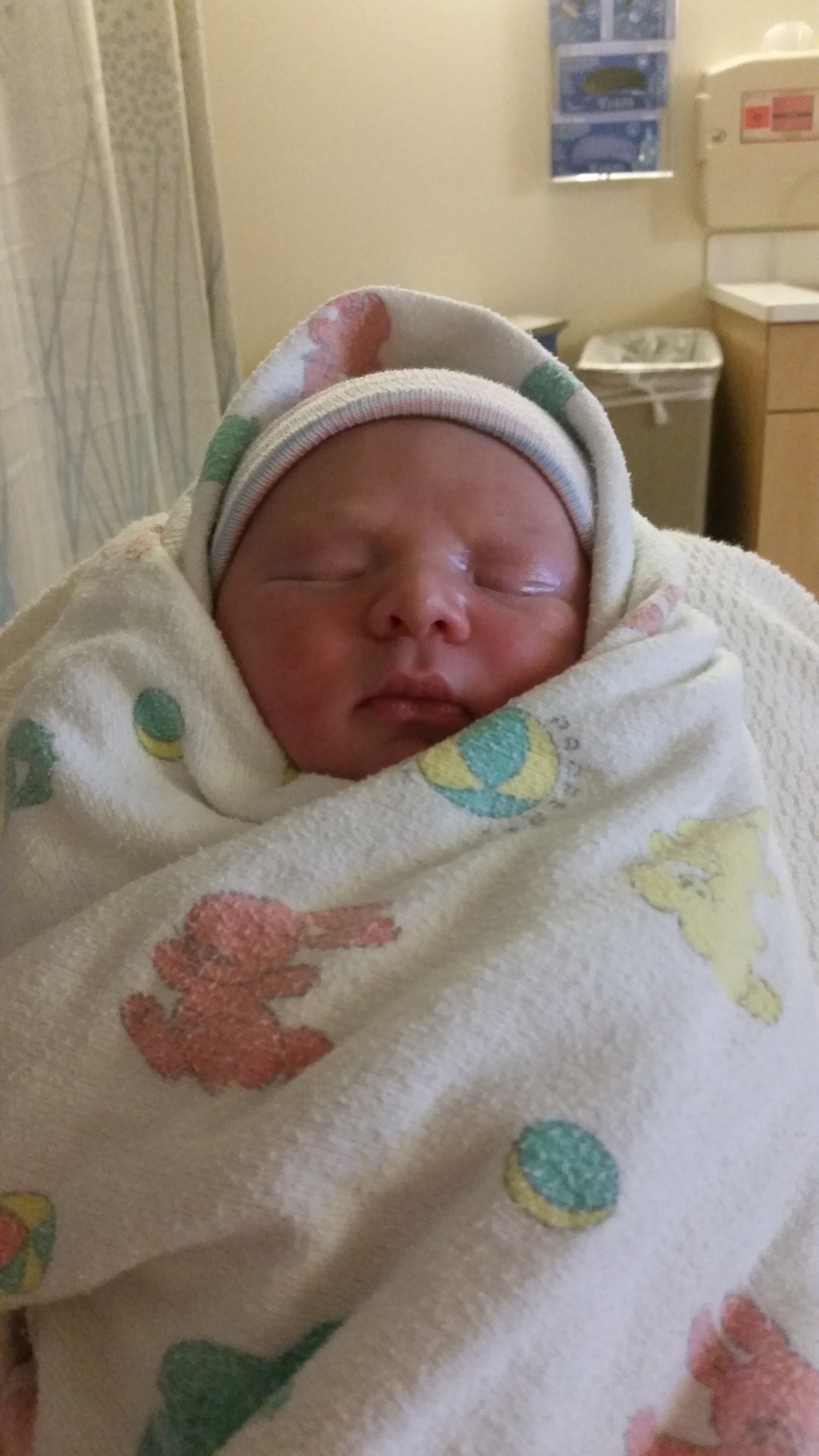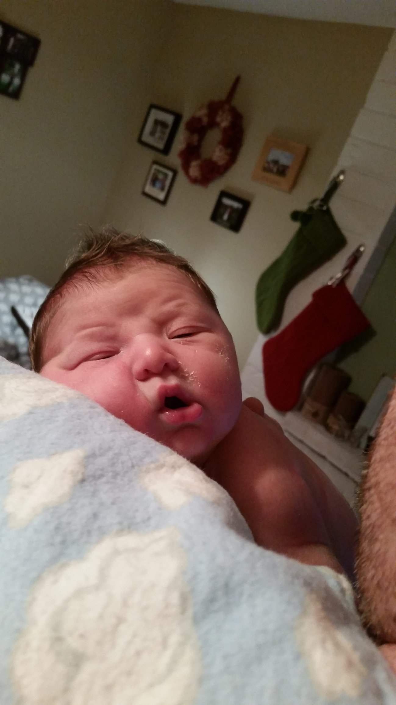 On 12/28 I went in for an induction at 41 weeks. I had been having back labor symptoms for several days and was having non consistent contractions before we got the the hospital. When the Midwife checked when we got there I was 3cm and 50% effaced. She decided that I may benifit from a cervical ripener and gave me half a dose of mesoproal at 5:30pm. At 10 they checked and I was having more than 12 contractions in an hour so they couldn't give me anymore. At around 2 am they check and I was 4.5cm and fully effaced. We had been moving around the room with Dh helping me sway during contractions and giving counter pressure on my back. At some point I got in the shower for the pain relief from water for  a while. Around 330 am they let me be off the monitor and gave me some benedryl to see if I could sleep a bit. I had to wiggle through the contractions and breathe a lot but did get a little rest. At 450am my nurse came to hook me back up to the monitor and as soon as she got by my side my water broke. I decide the contractions were just too close together and I couldn't relax and was fighting them so I asked for an epidural. Woke Dh up and he held me while they did the epidural. Around 6 or so they checked and I was 5cm. I slept for a while and by 950am I was fully dilated. They had me labor down for an hour but I fell asleep and so when I woke up around 1140 they got me ready to push. Leif Gregory was born at 1:17pm. He weighed in at 8lbs 9.2oz and 21 inches. He didn't latch well at first but picked it up well later. I had a second degree tare but everything else went well. The nurse and the Midwife were shocked at how close together my contractions were and said they were glad I had the epi because otherwise I wouldn't have had the energy to push him out.