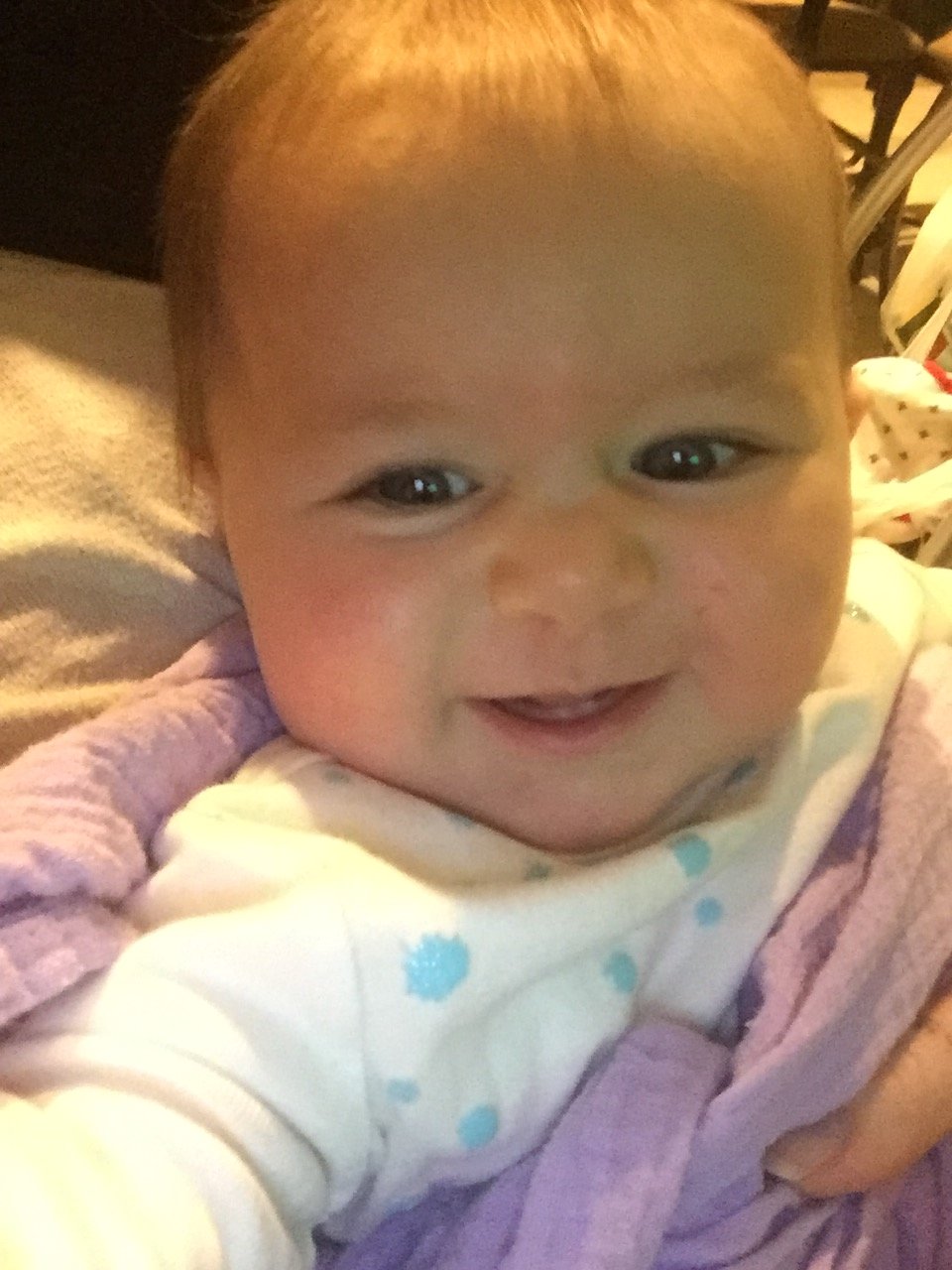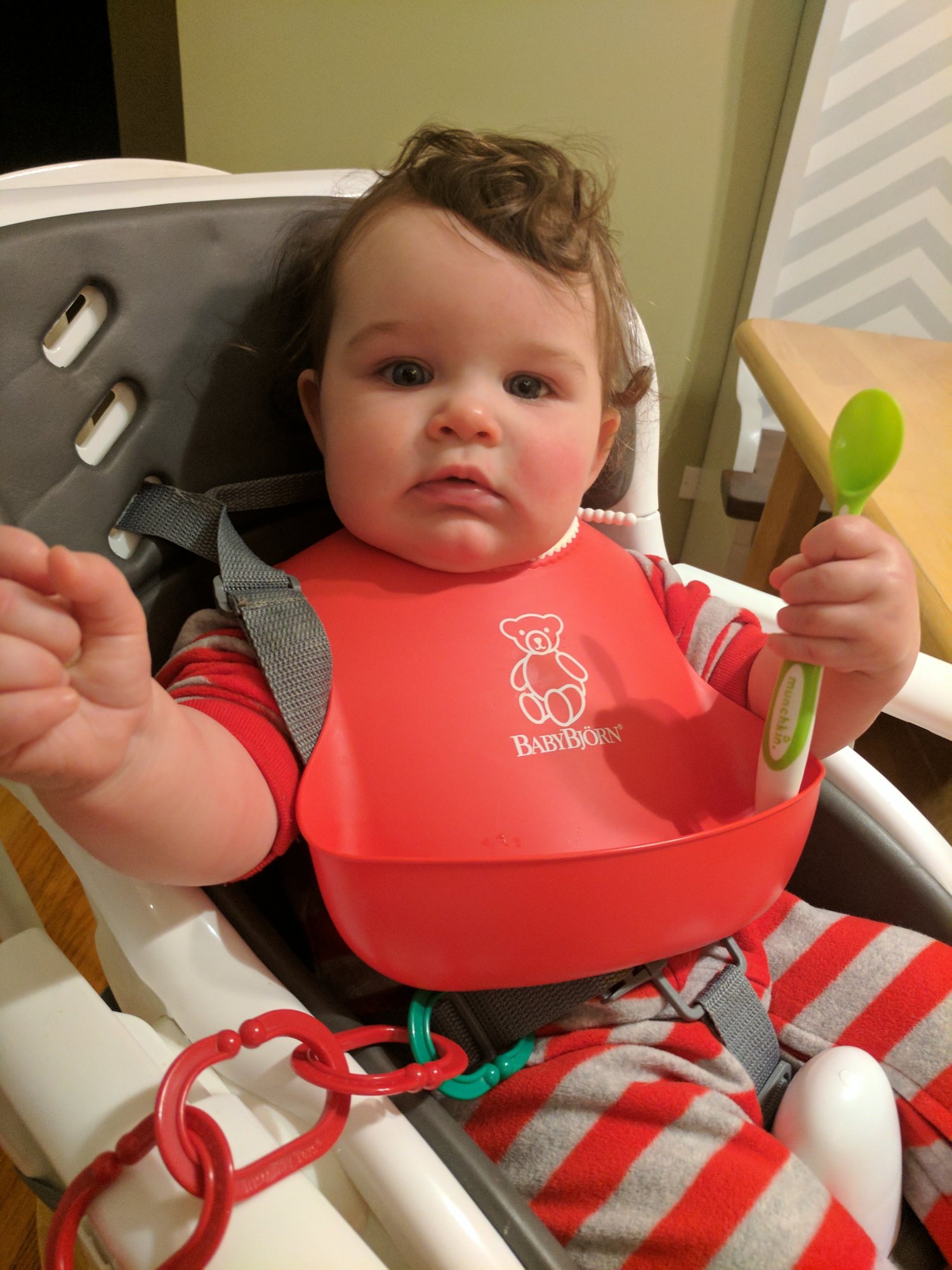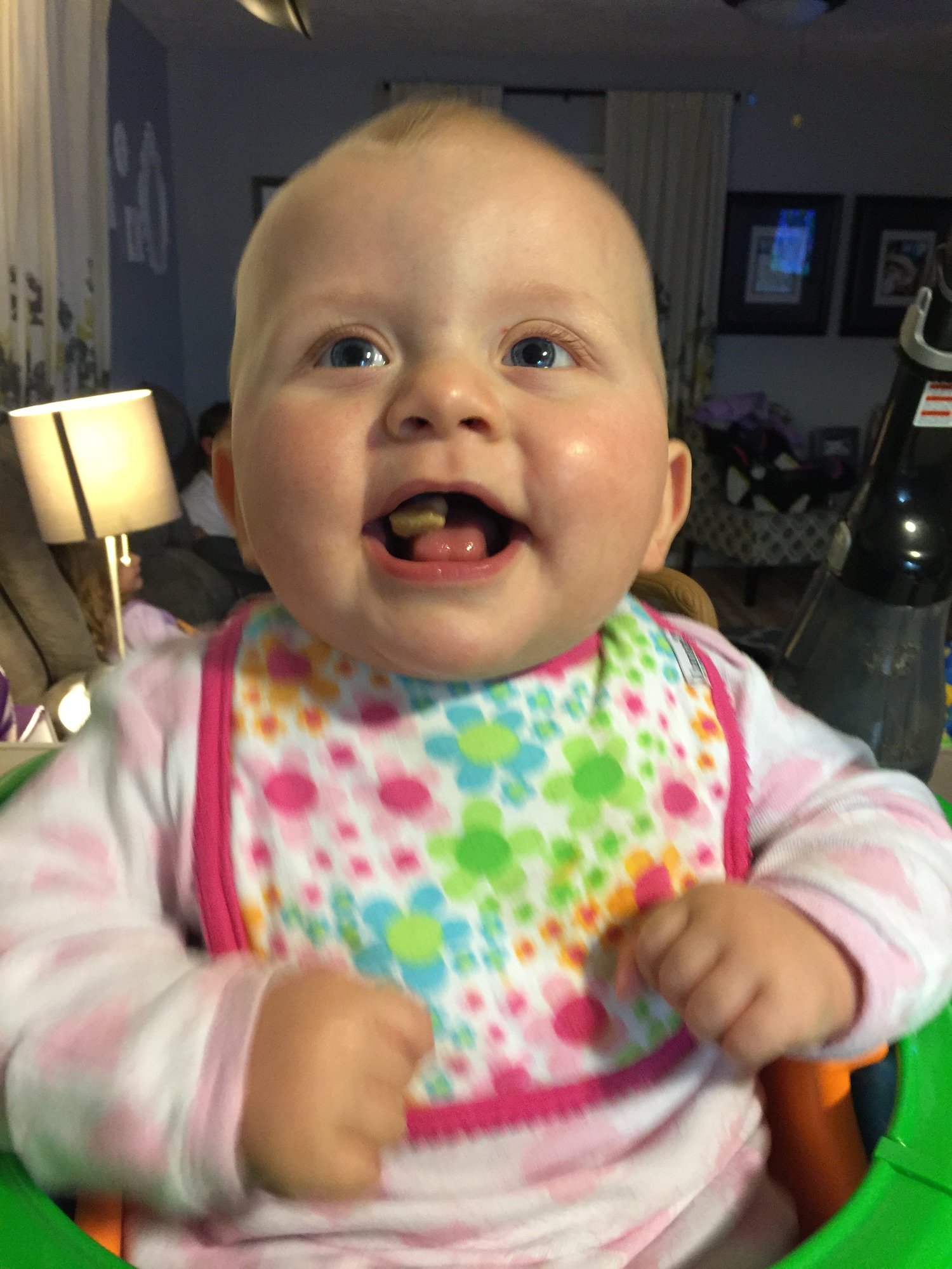 Two smiling ladies! Erin is 8 months on the 5th, time is flying by. We tried cut bell peppers and cooked carrots yesterday! Working our way to more complex foods. DH gets worried that we are going too fast, he must learn to calm down. lol