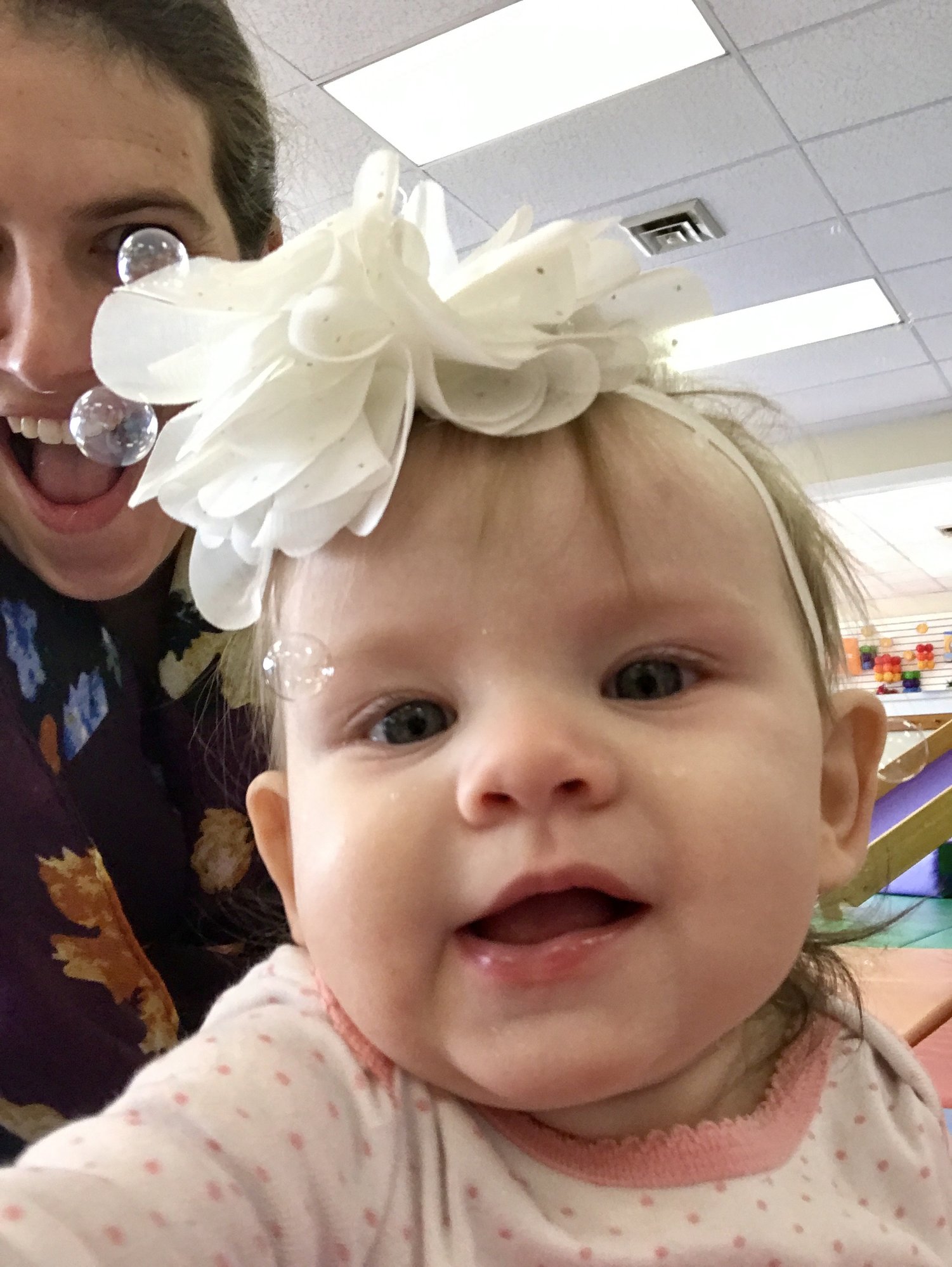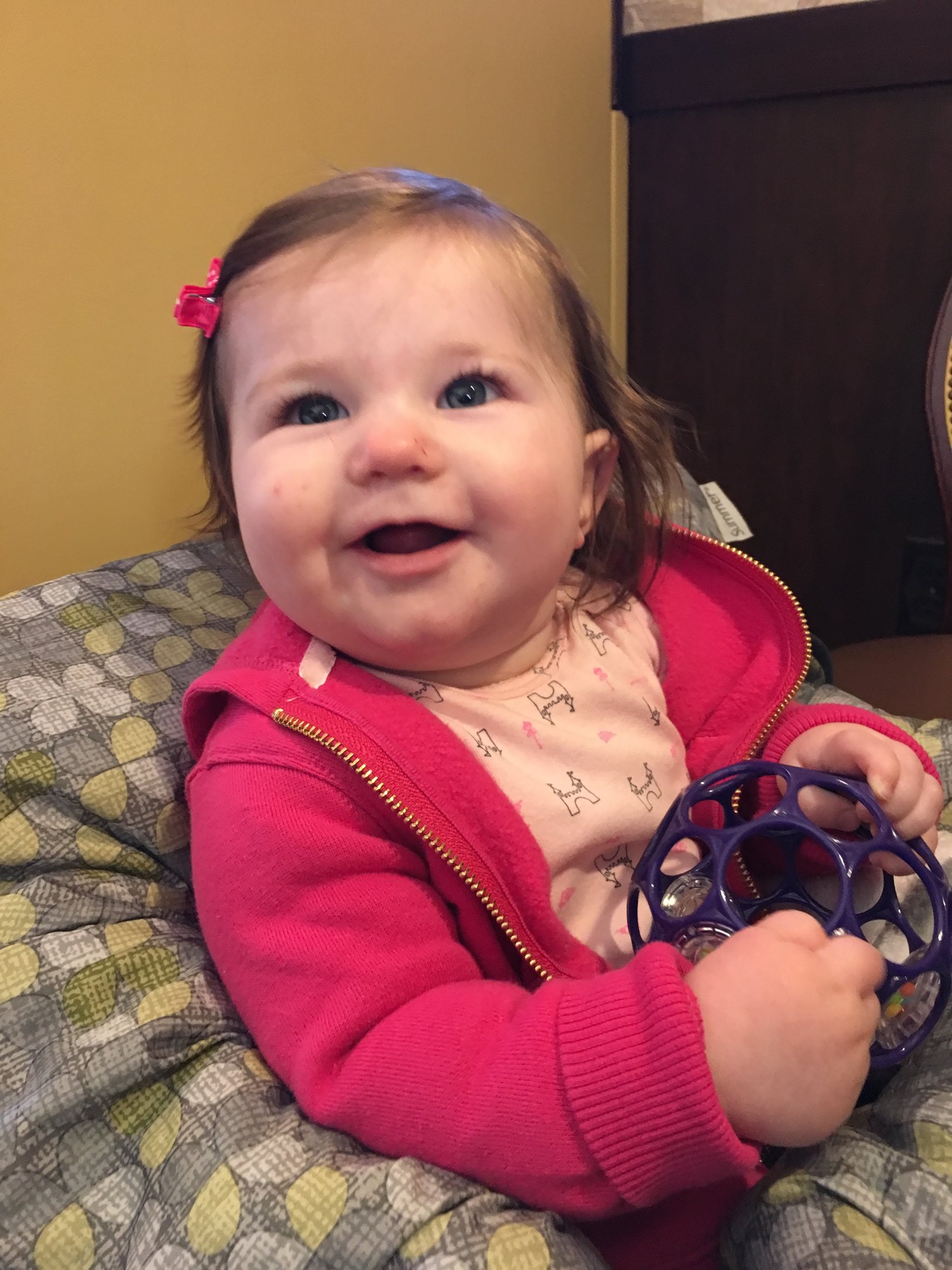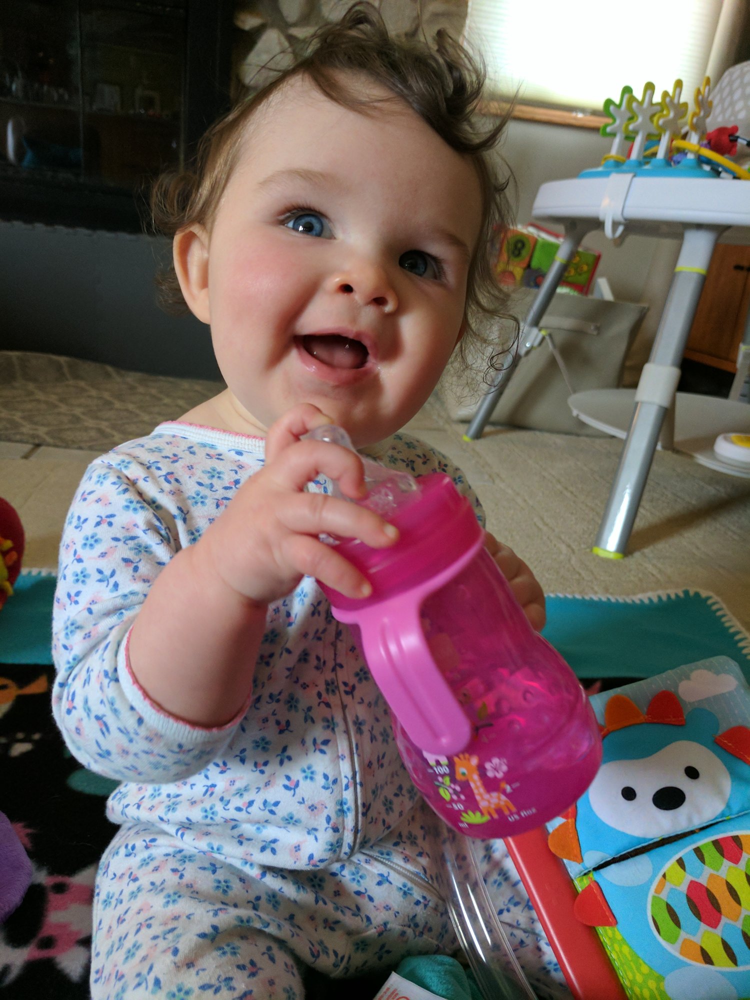 Lily sprouted her first 2 teeth this week and we couldn't be more excited. Her eyes are still very blue so we think the chances of her getting my green/hazel eyes is out. She says dad all day and hey but still no mommy.