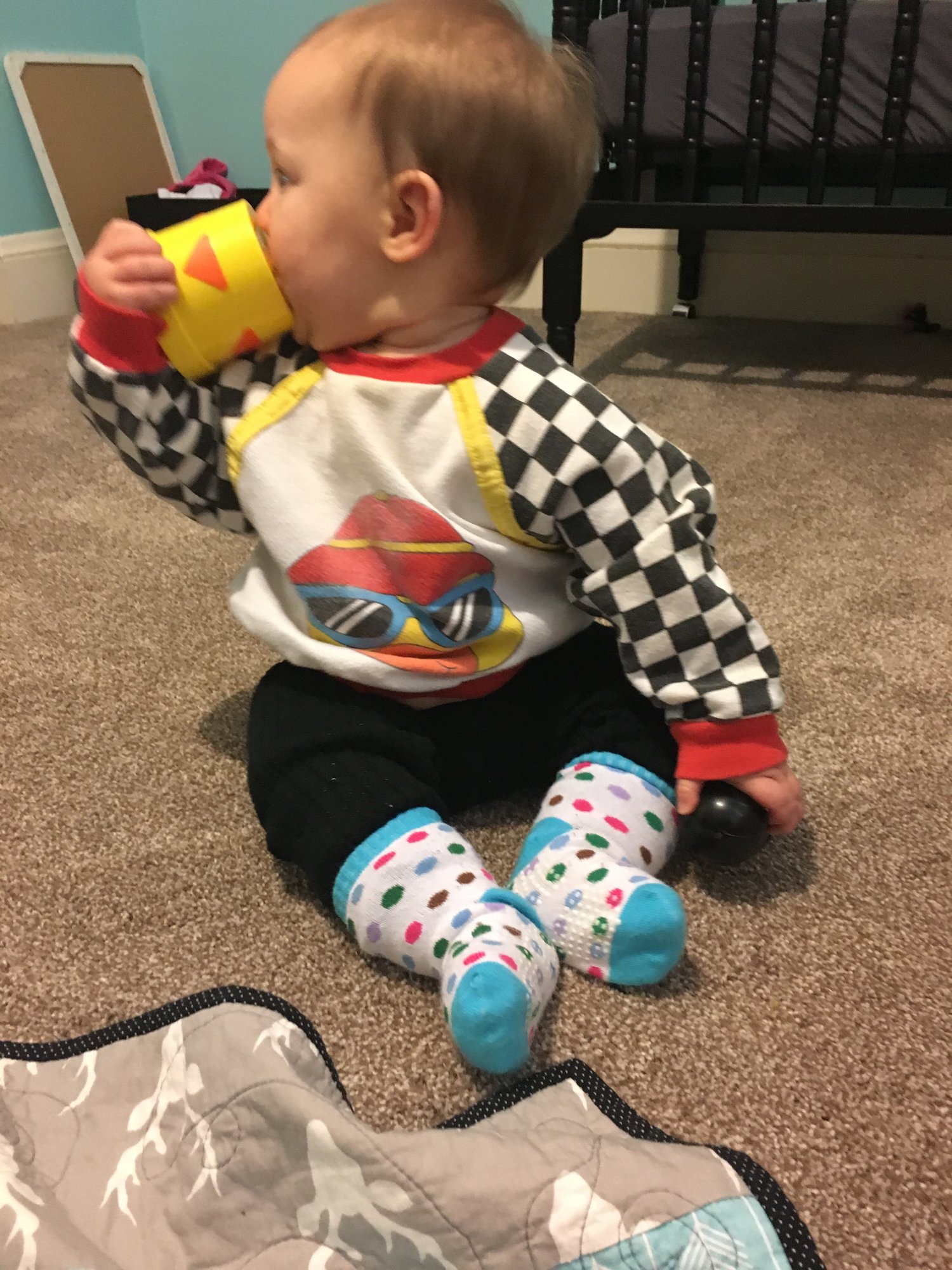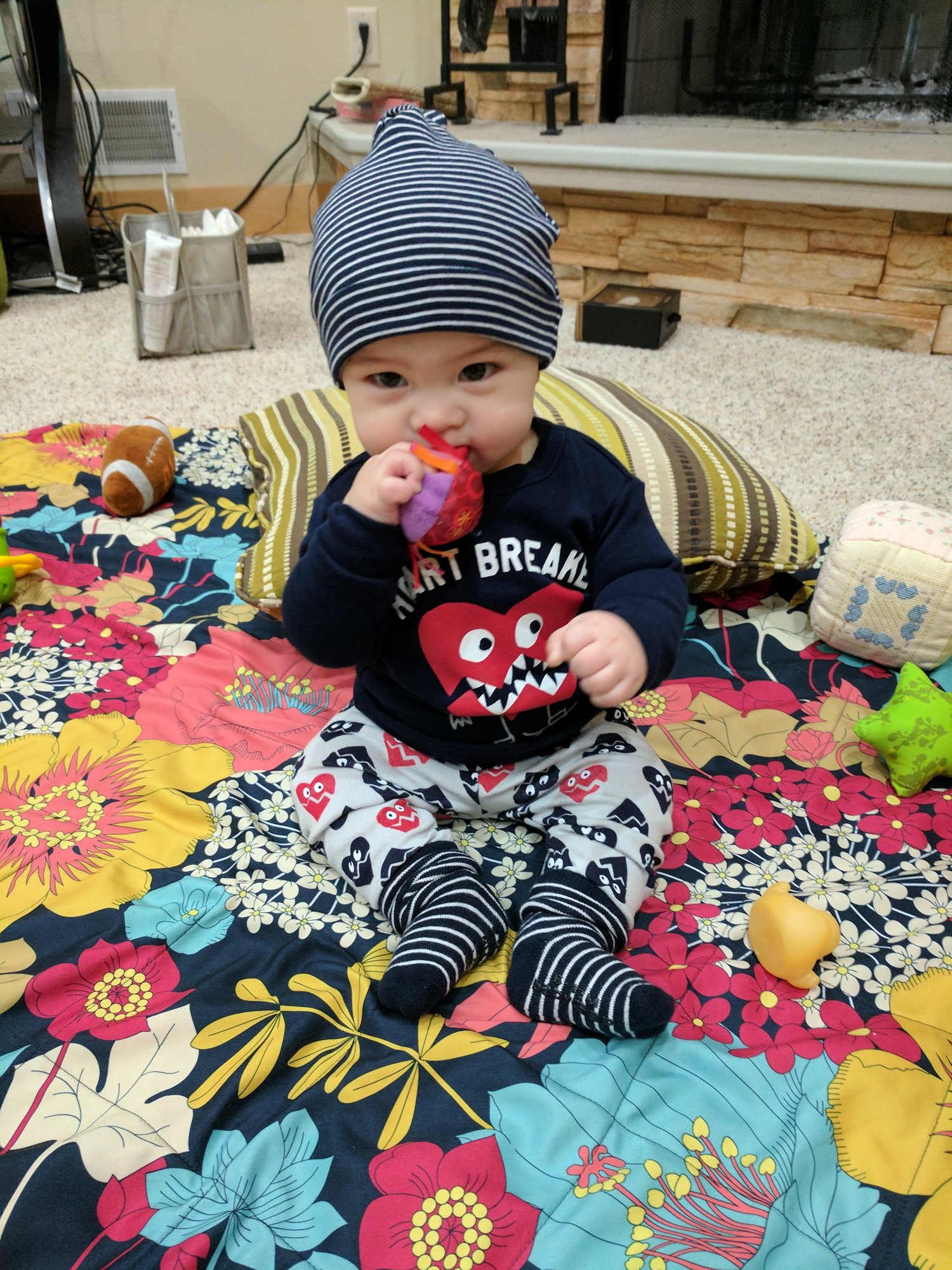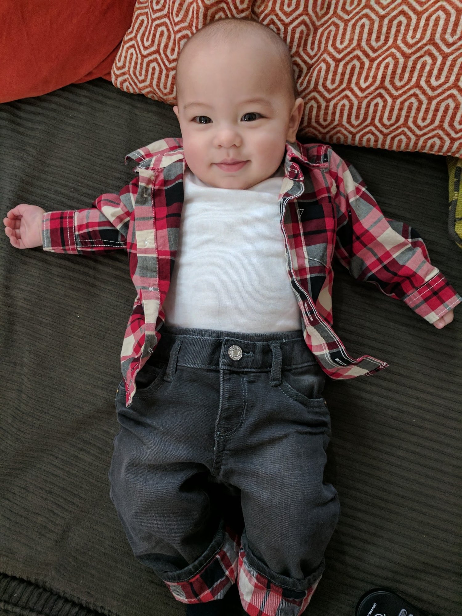 From last week, but my pictures from this week include him in terrible outfits because he felt it fit to leak through a diaper two days at Grandmas house while I was working and Grandma pulled out outfits from the 90s to put him in. Girls outfits mind you, I have 2 sisters