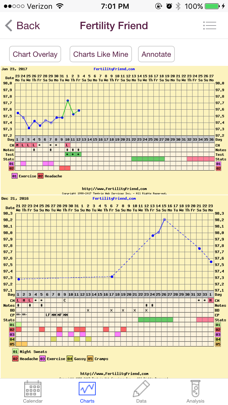 i didn't chart last month. I temped three times after the day I thought I O'd to make sure they were high. They were. Then I checked 9 days from when I thought I O'd to see if it would drop like normal. It did and I started to spot like normal. That's the bottom chart. Then the top chart is from when I thought AF started. My cover lines have been anywhere from 97.7 to 97.9. So this has been much lower.