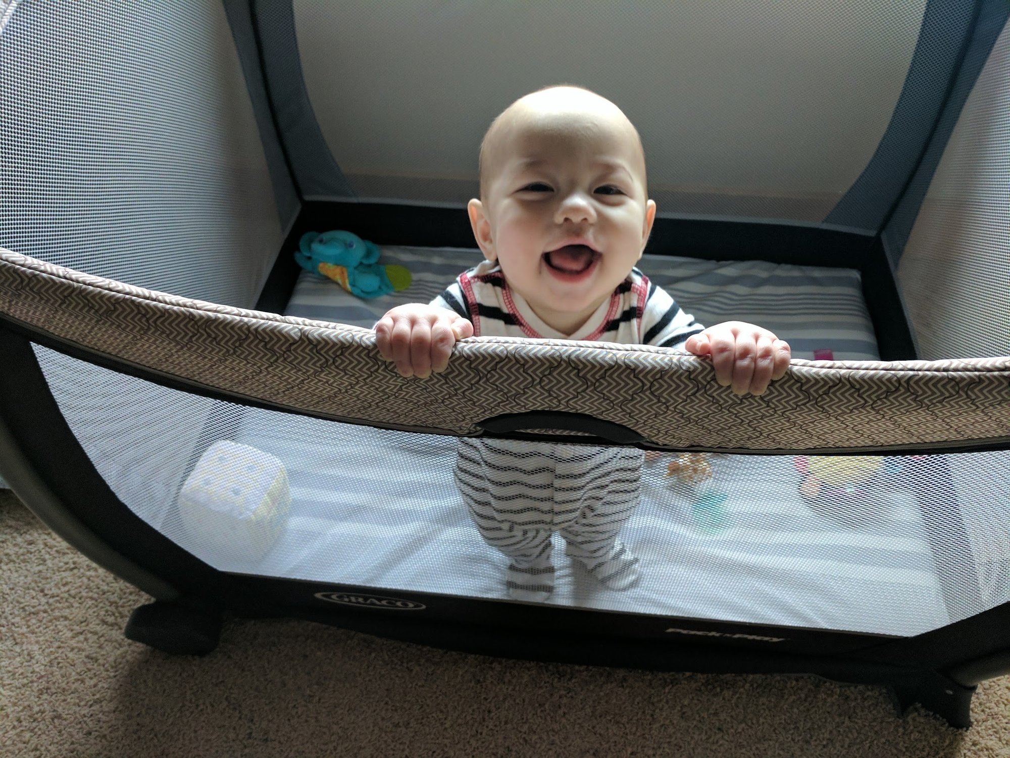 Jack has decided sleeping at night is over rated. He has no interest in crawling or pulling up, but talks up a storm!