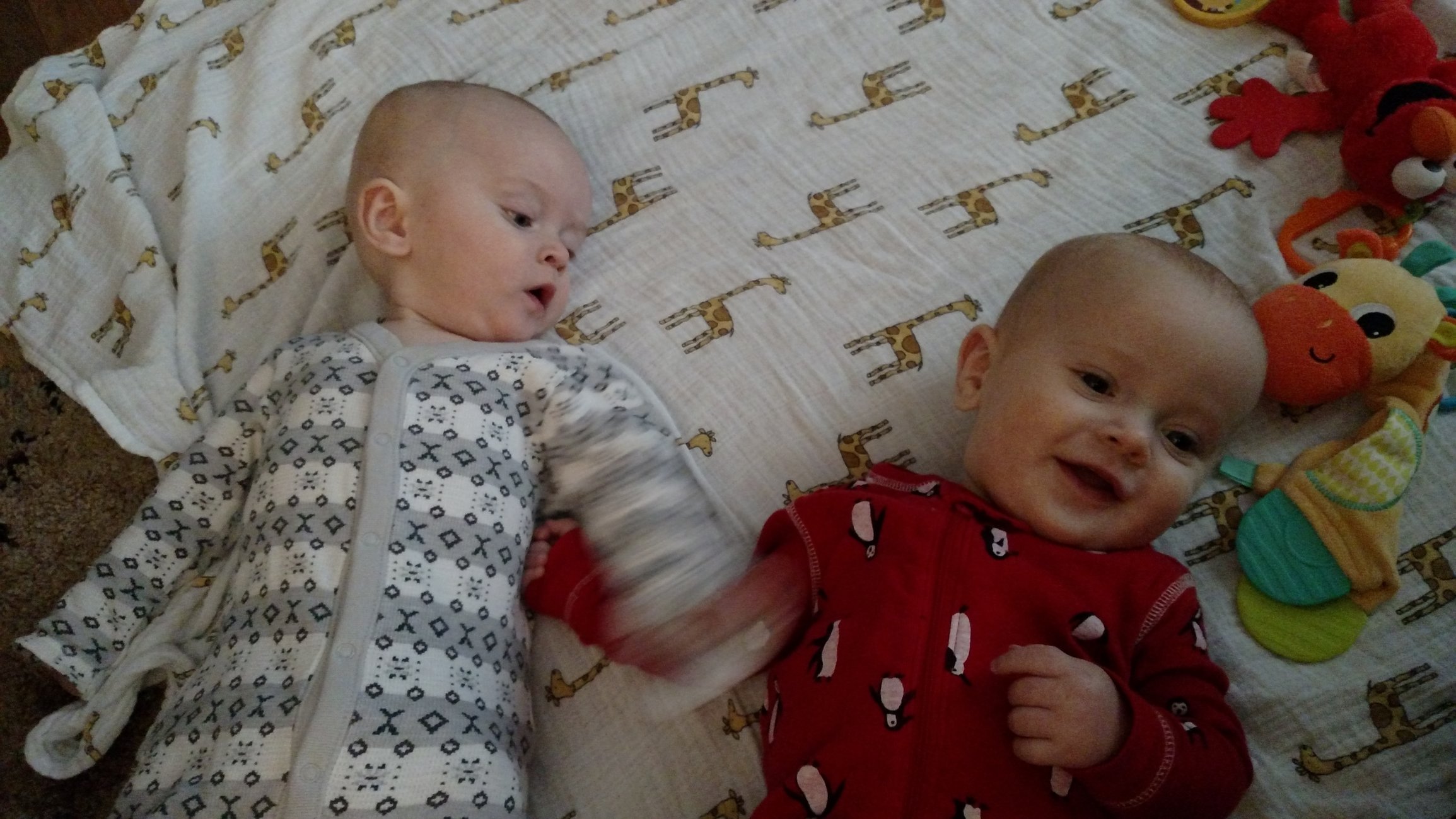 Henry and Oliver can both sit up, and Oliver can scoot around pretty well, but neither shows any desire to crawl. They're both eating a bit more solid food now after we scaled back a month ago due to tummy troubles. Oliver even complained last night until I gave him a broccoli floret at dinner time.