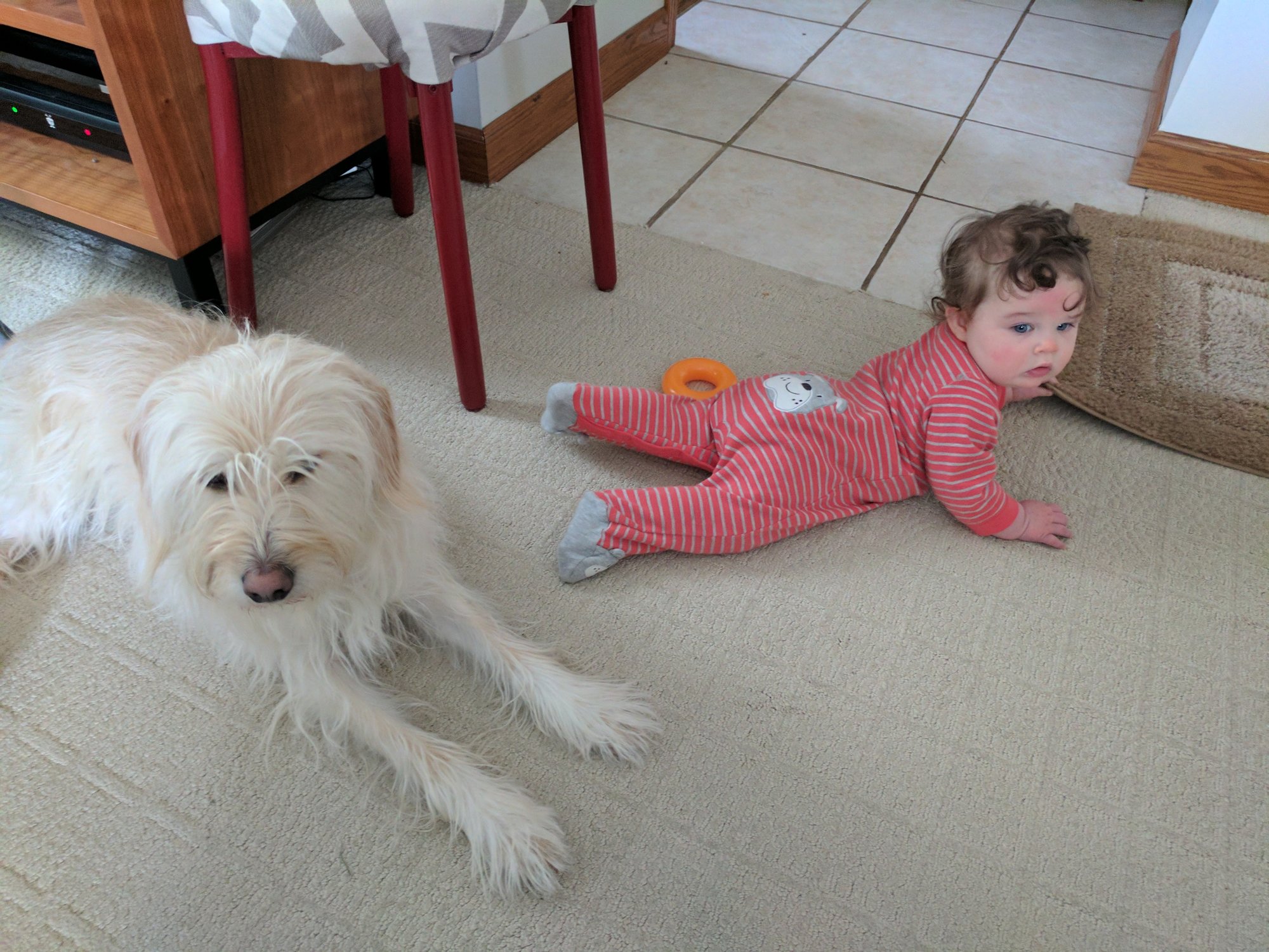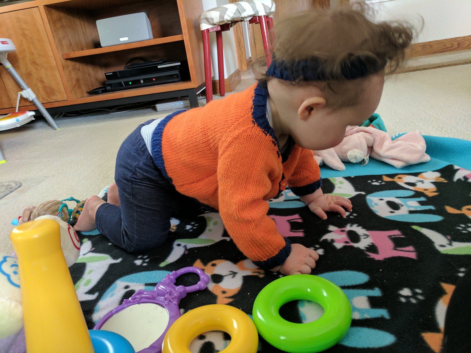 Nadia scoots backwards, and a little bit forward on her bottom, only now starting to try to forward crawl traditionally, but I think she dislikes our hardwood floors. She loves to stand and sit, and be outside.