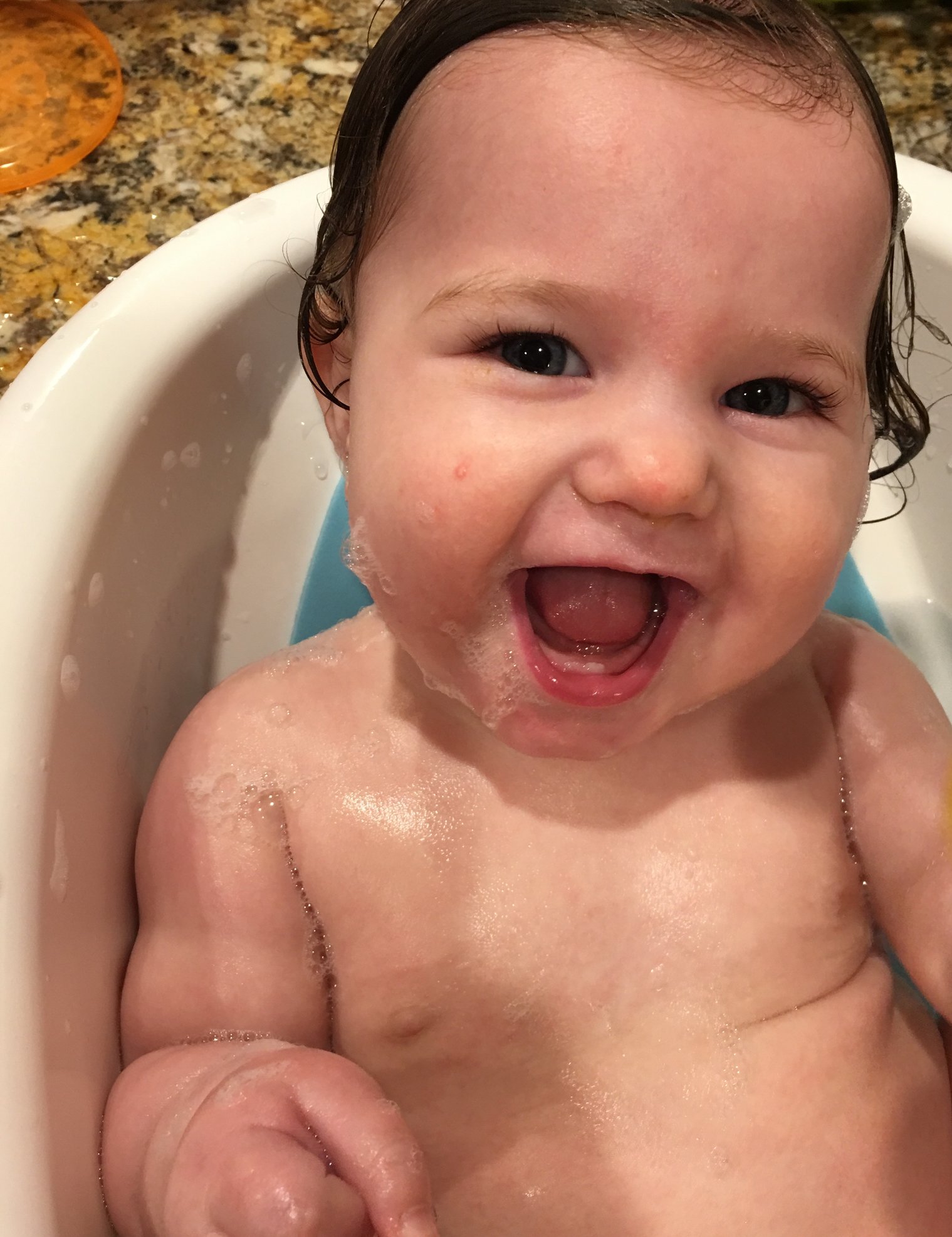 Savannah is really starting to love food, trying to crawl (but only going backwards- she got from the rug to where she is in the pic), and sitting like a champ. She has started trying to pull herself up if she's holding onto my hands and we recently discovered that she loves oranges! She is slowly getting closer to STTN too which has been an awesome change!