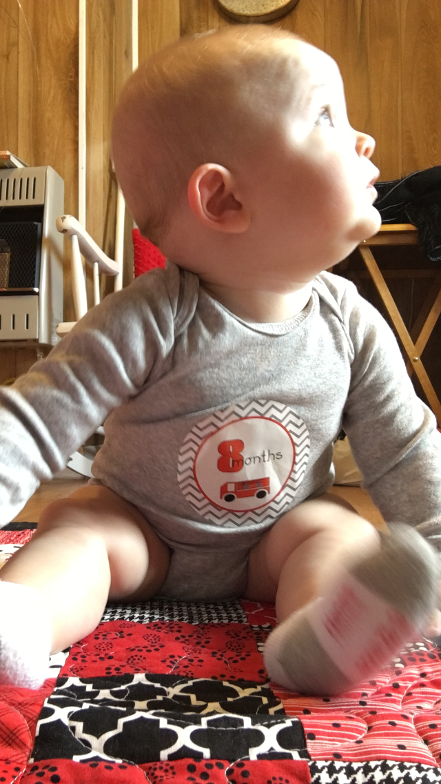 Cameron will be 8 months on Friday. He has really started to love his toys recently. He mastered sitting a couple weeks ago and is now starting to beg for food when he sees us eat.