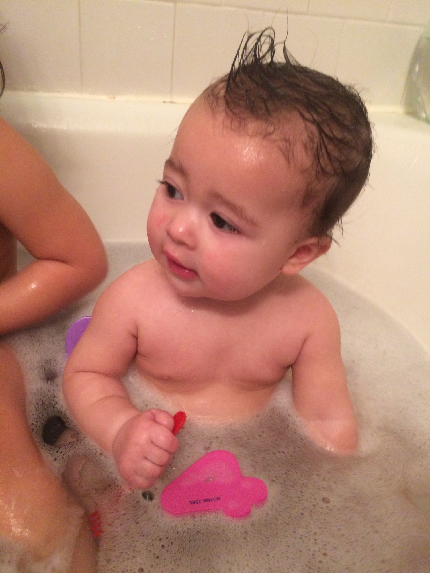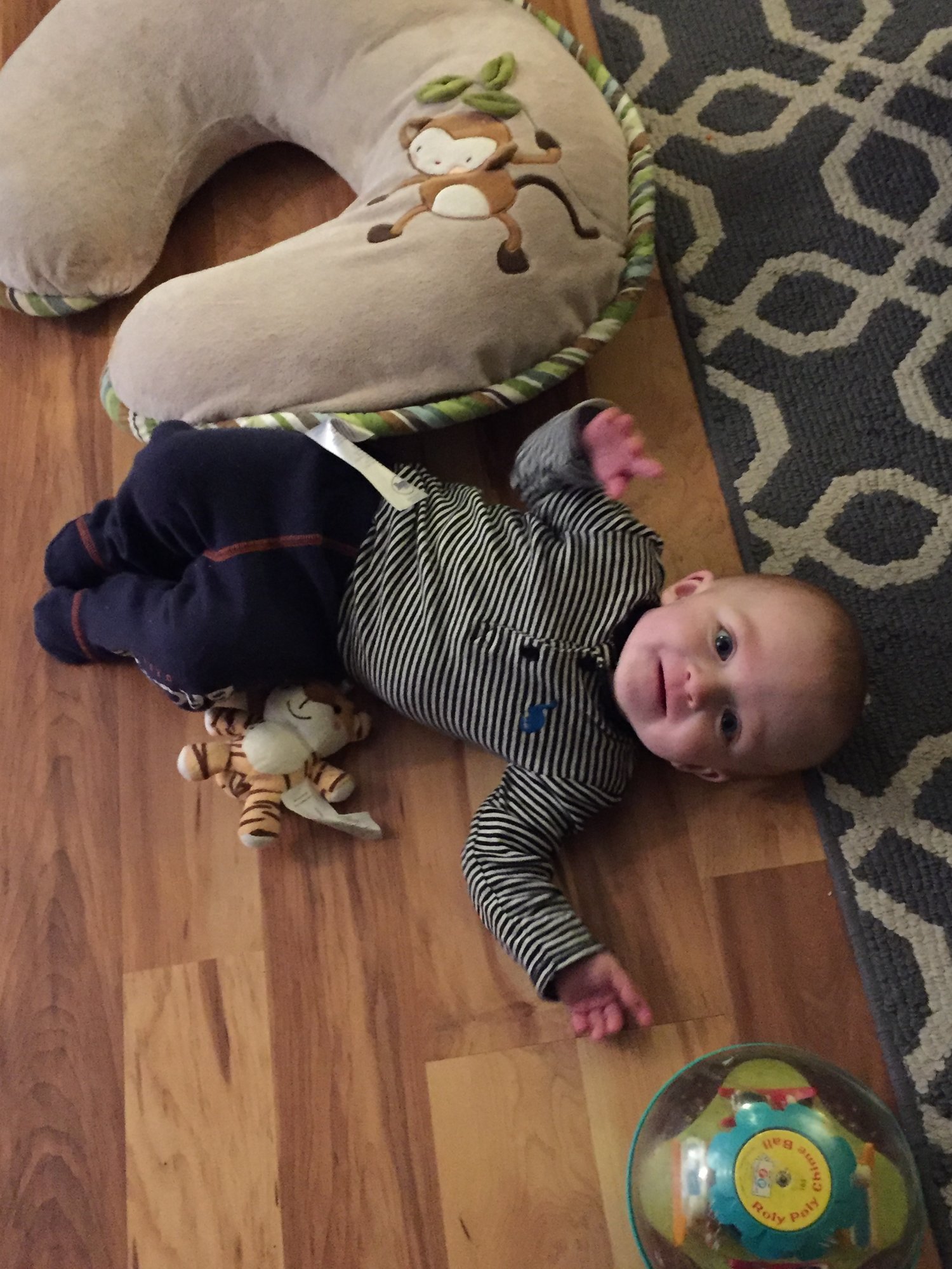 Damien is enjoying his visit with Abuelita and Grandad in VA. He is getting closer and closer to crawling and still loves to stand. He prefers to sit up these days rather than lay down. Still loving his purées, just tried turkey for the first time and liked it a lot. Yesterday we spent time hanging out in the yard, watching cars drive by, the wind blow leaves around, and pet the cat.