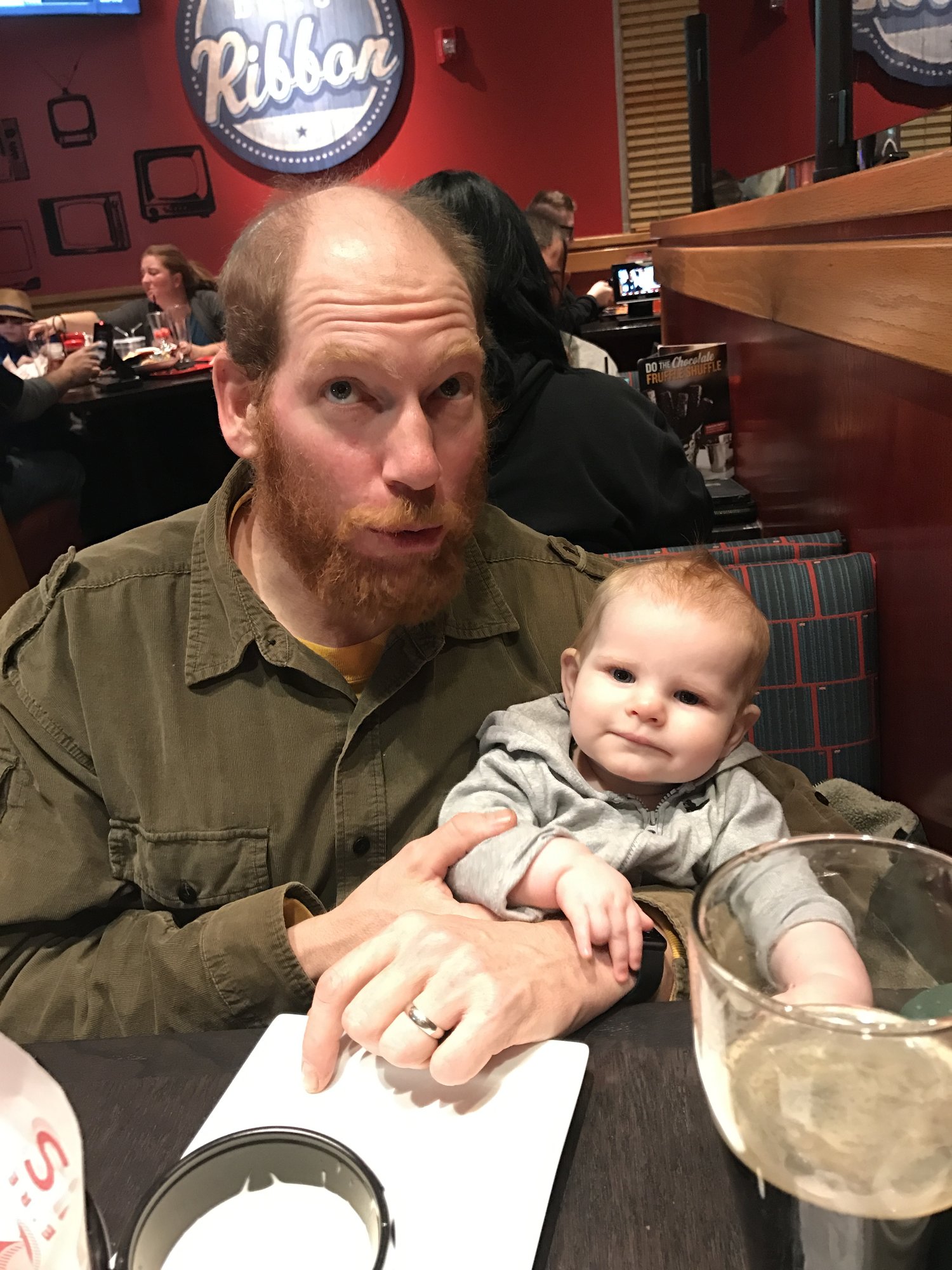 Cora will be 8 months on Monday and has finally started to gain weight back after being sick for so long, thanks to some formula supplementing. She is now interested in trying to move around on her belly, and can push herself backwards and in circles. She is starting to sleep through the night too, and is just full of giggles. Here she is with her dad as we made our way to my dad's for the Super Bowl.