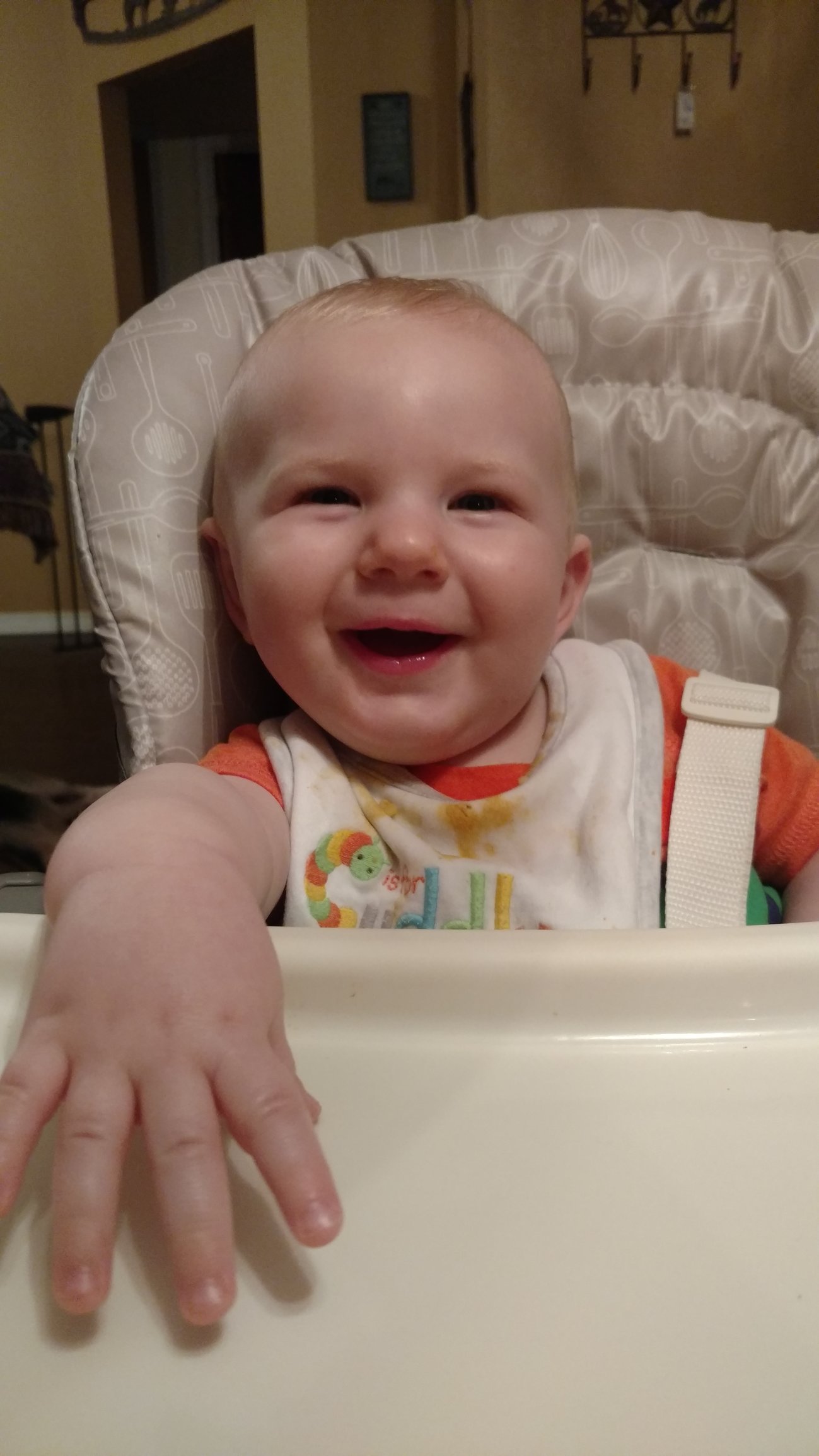 Levi is barely 7 months. He is sitting up, crawling and starting to pull up. He still prefers purees to anything but does hold on to and will sometimes try to taste finger food. He drinks from his sippy cup (with straw) pretty good. He had one tooth and at least one or two more coming soon.