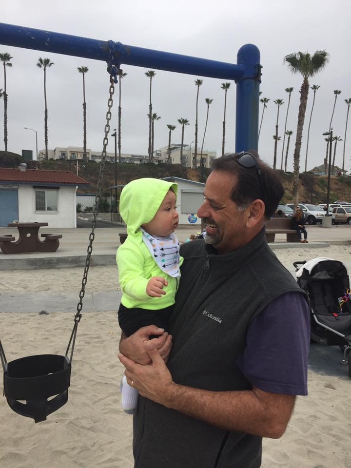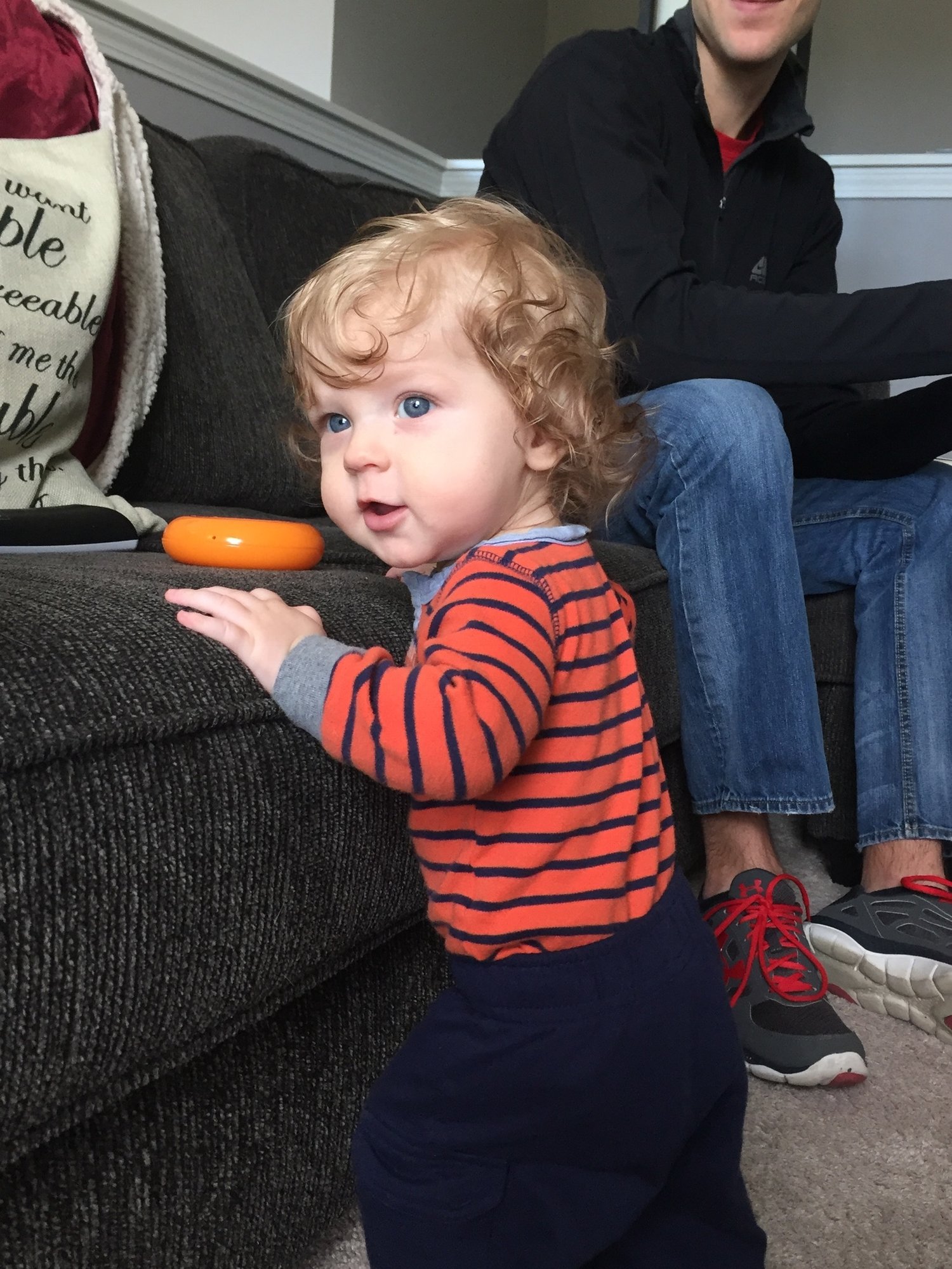 34 weeks old as of yesterday. Loves pulling himself up on his toys. Getting much faster at crawling. Still trying to convince my husband that Ethan needs a haircut. Here are some pics of when he spent the day with my dad and stepmom (this was the first time they watched him alone).