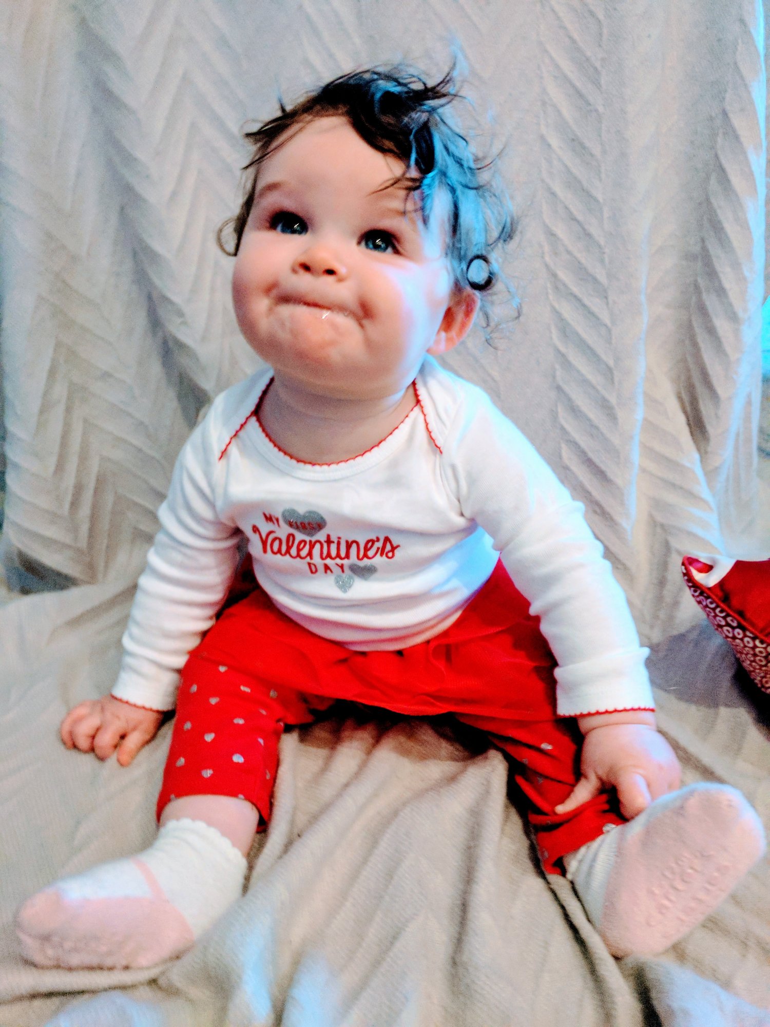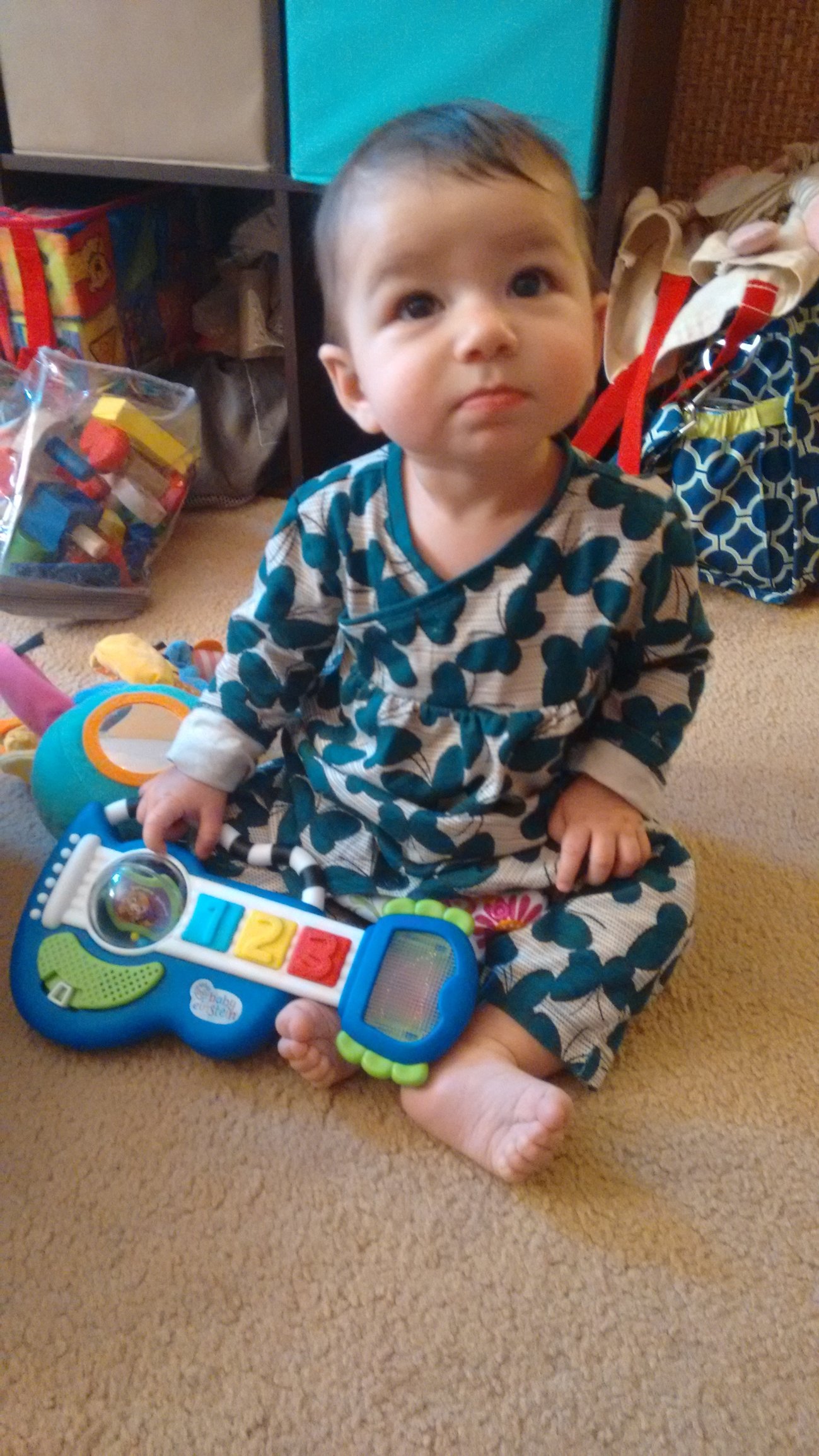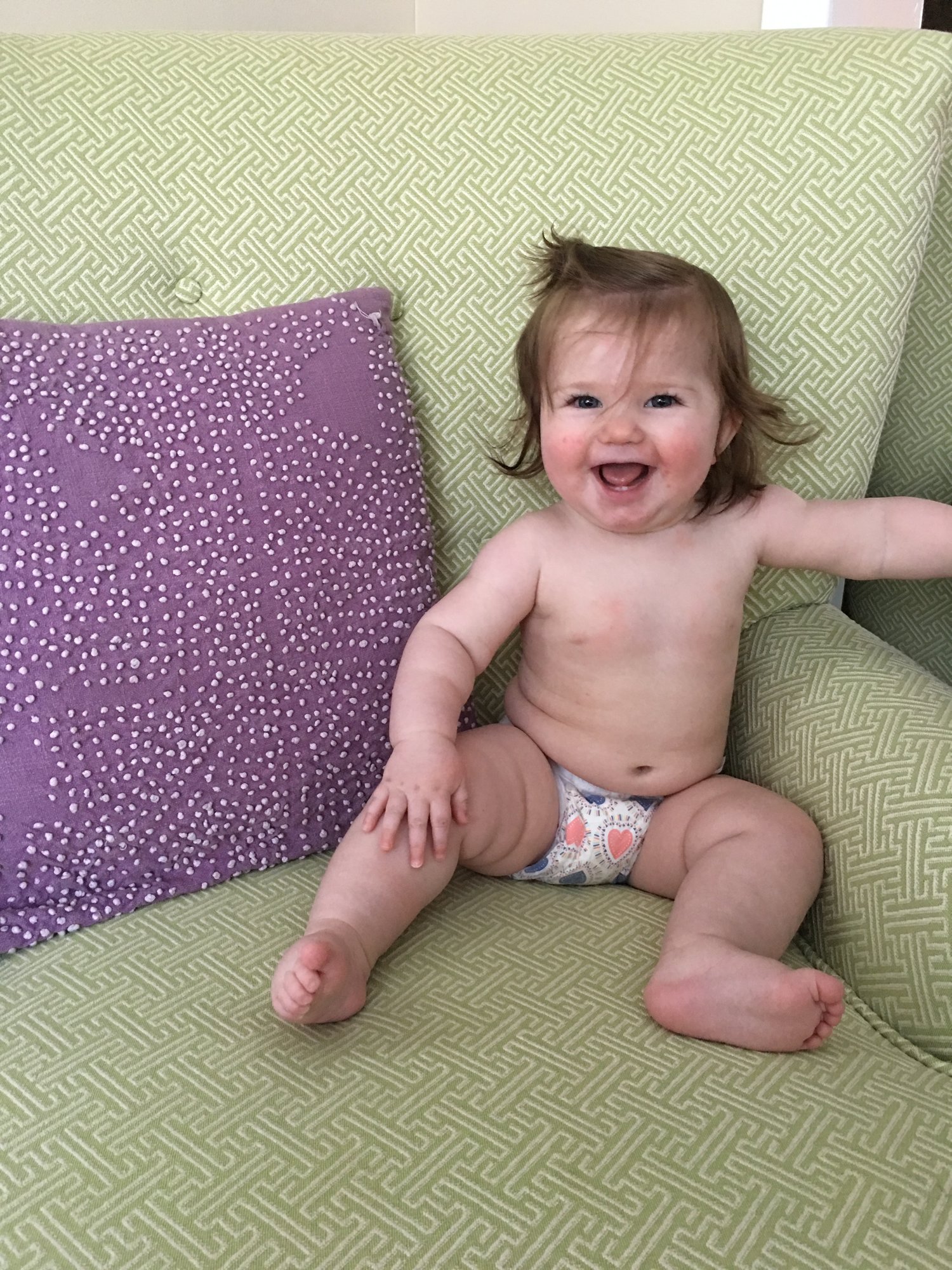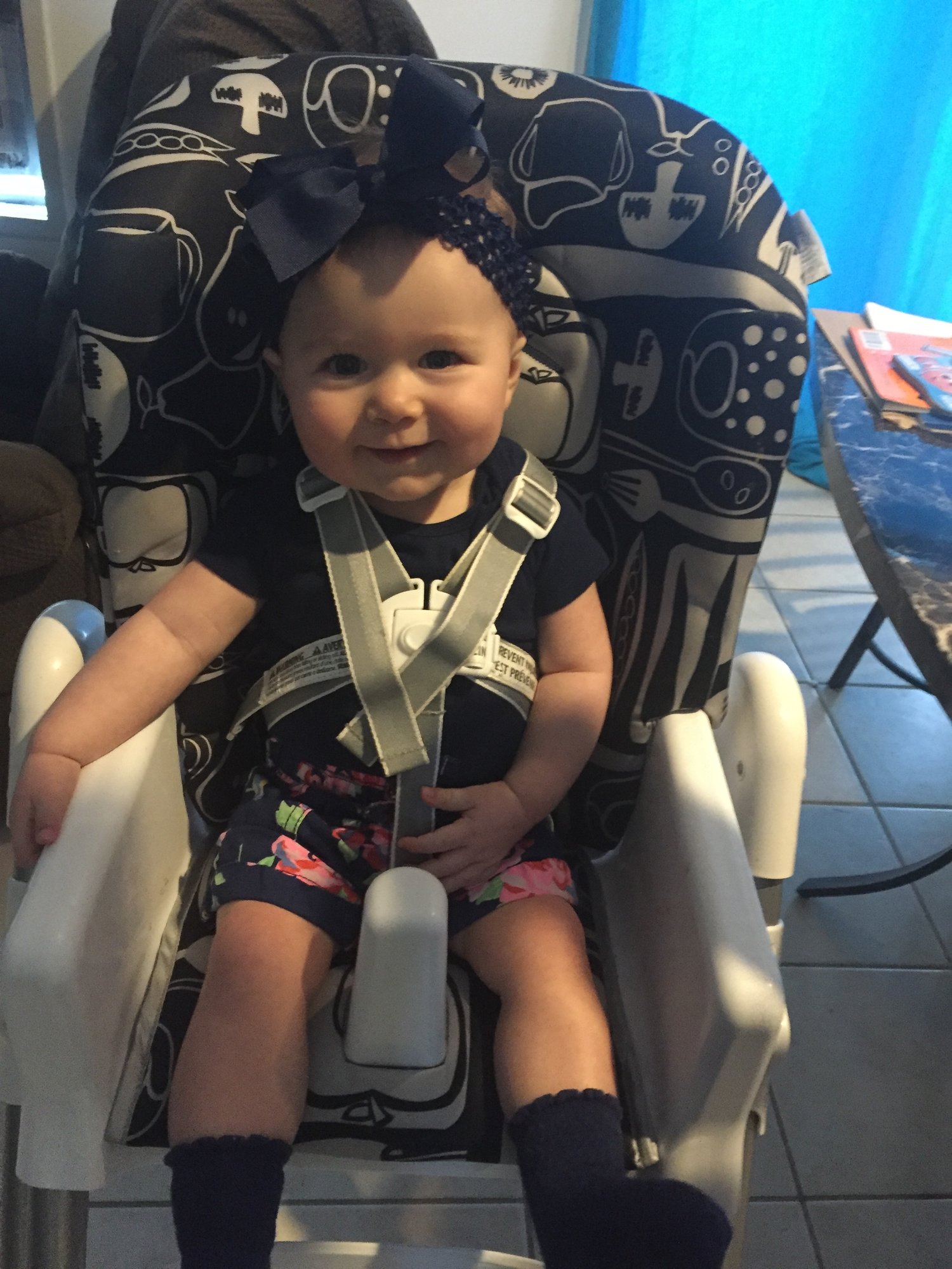 8 months old last Sunday. Where has the time gone? She is pulling herself up and taking slow steps along the couch. Pro at crawling and absolutely loves eating food with us.