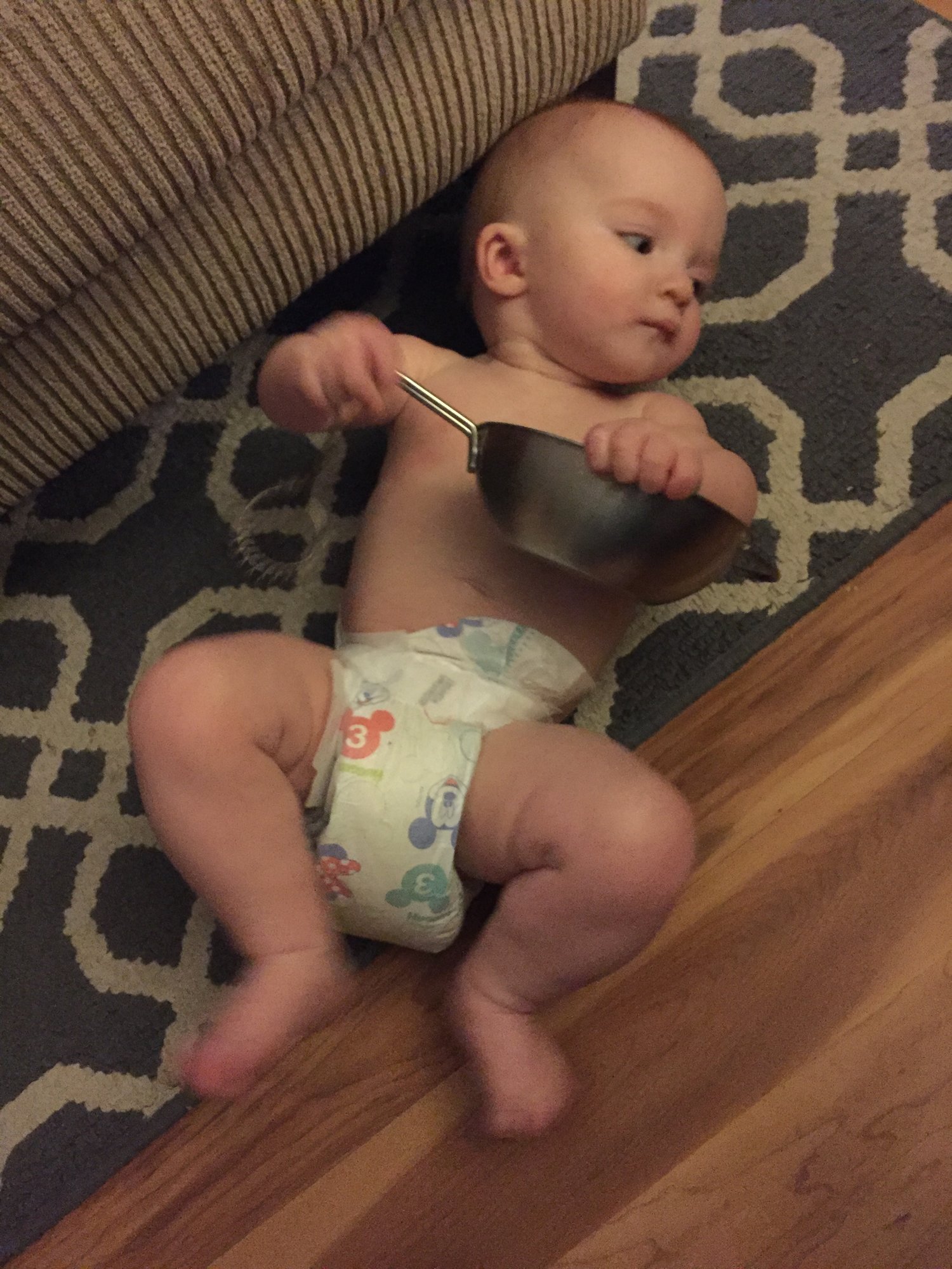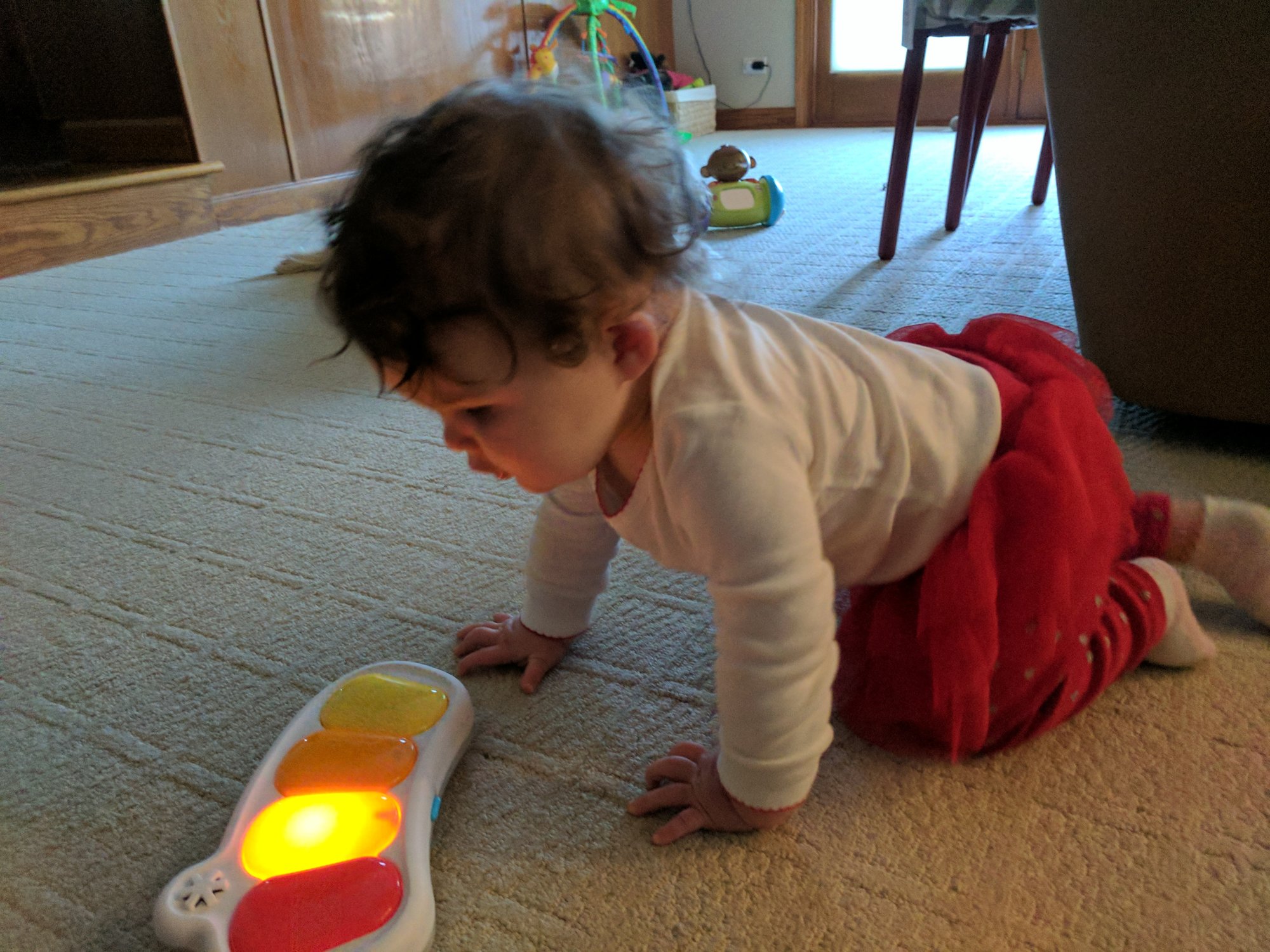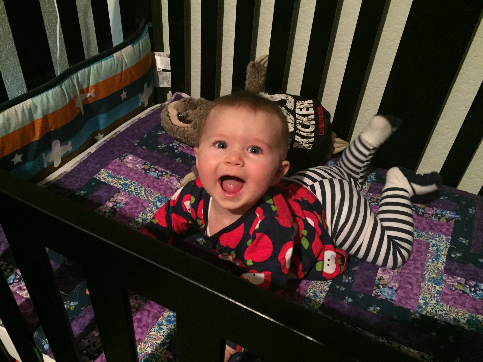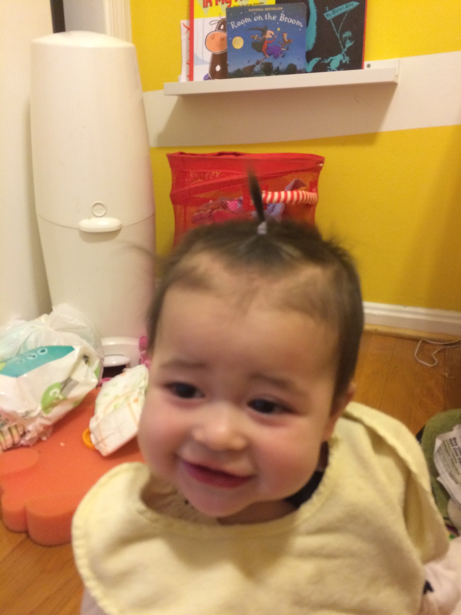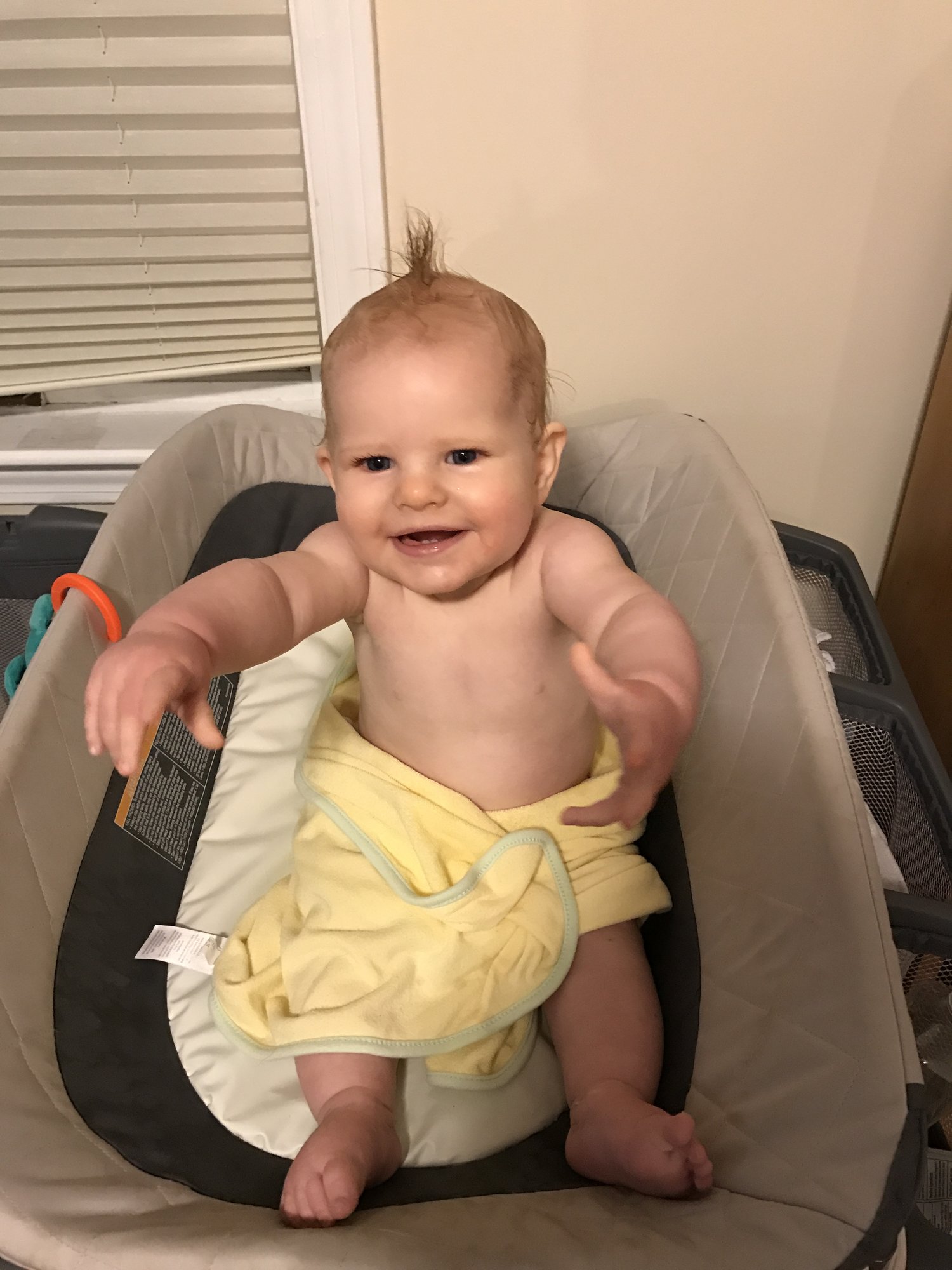 8 months old last Sunday. Where has the time gone? She is pulling herself up and taking slow steps along the couch. Pro at crawling and absolutely loves eating food with us.