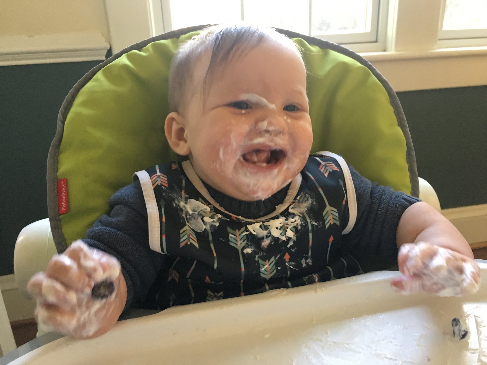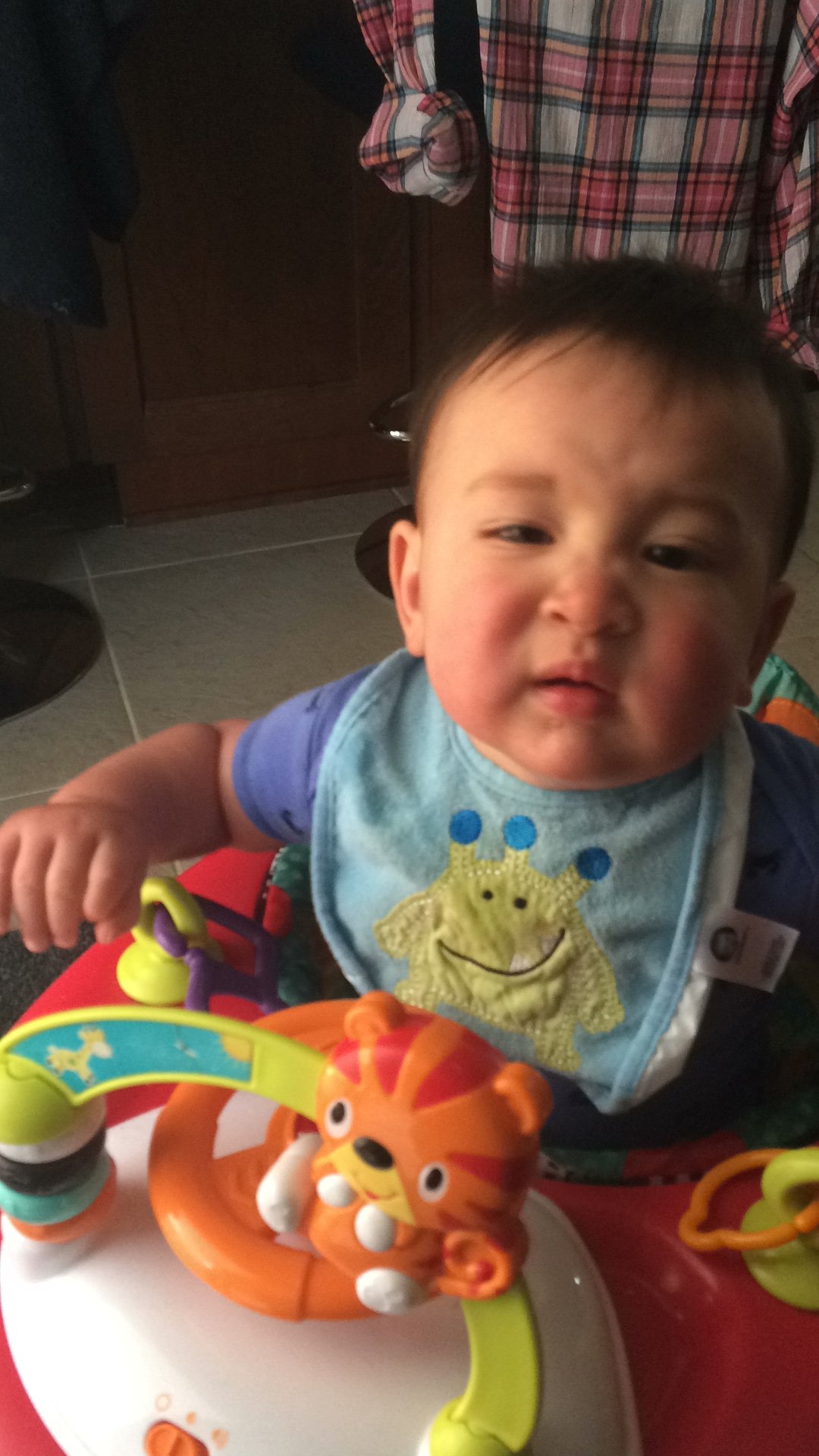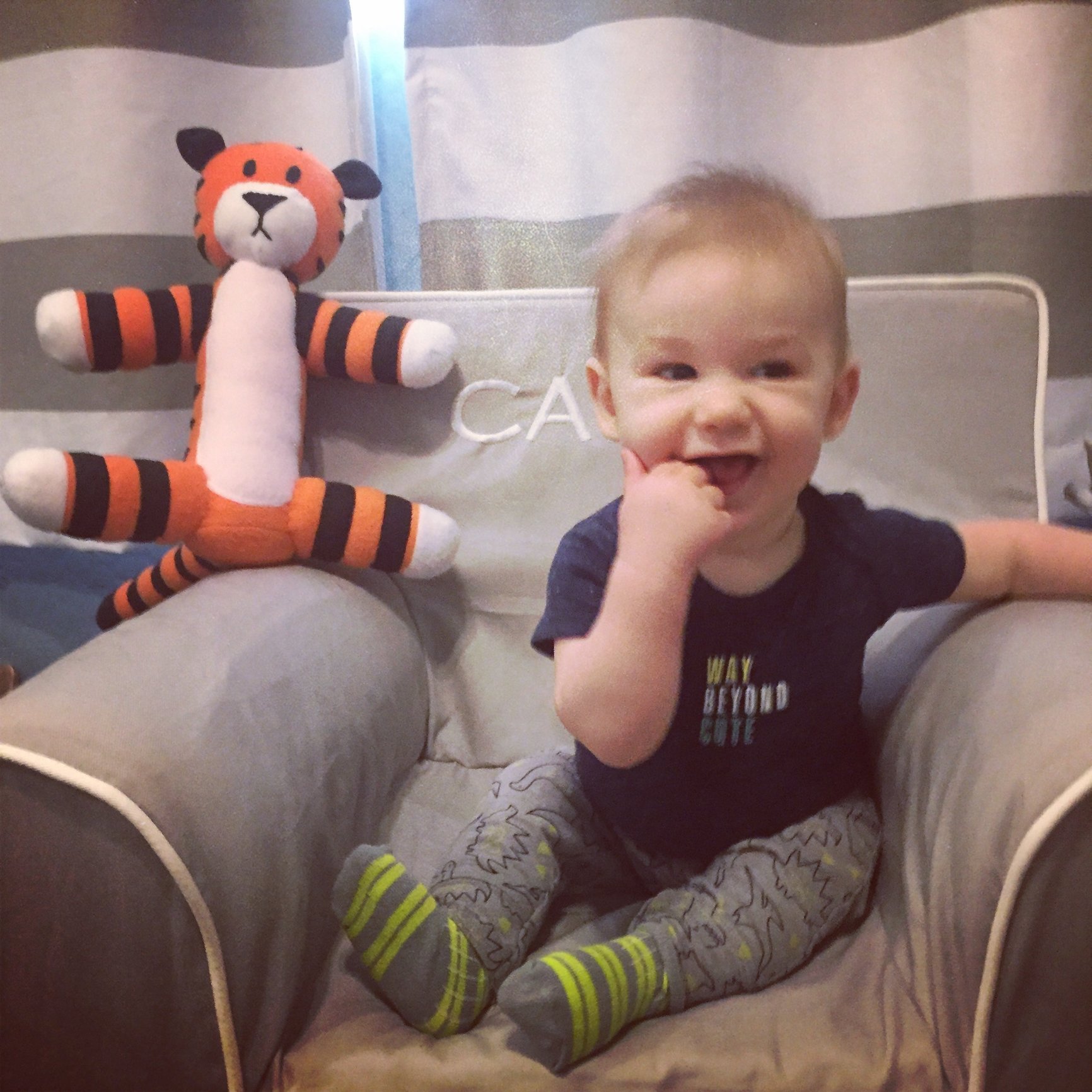 Calvin is 8 months and a week. Saying 'mama' and babbling up a storm. Crawling so fast and trying to pull himself up. Feeding himself some small bites. I absolutely love this age!