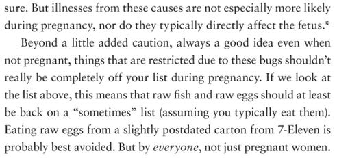 I agree, but also have some sympathy for the worried women. My first pregnancy, I was a stickler for the dietary rules. I thought it was about safety, but in hindsight it was one of the only things I could control amid all these big, scary changes and unknowns.