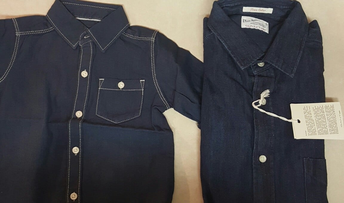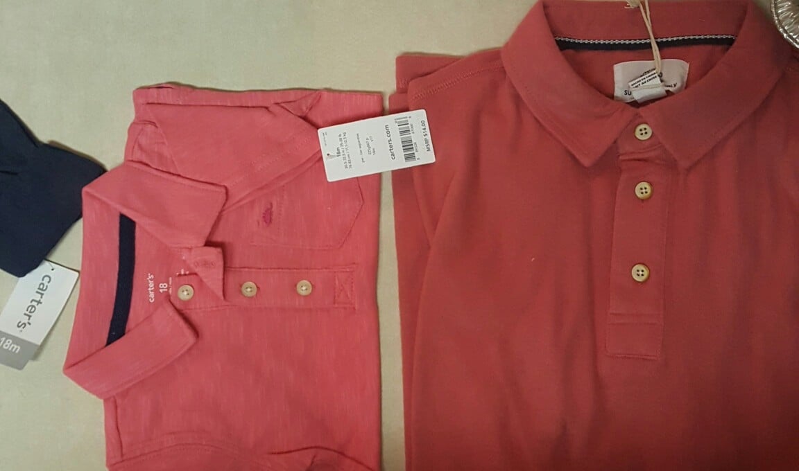 Option 1: long sleeve denim shirts. DS's has white stitching while DH's doesn't. The fabrics aren't really the same but the color generally is.