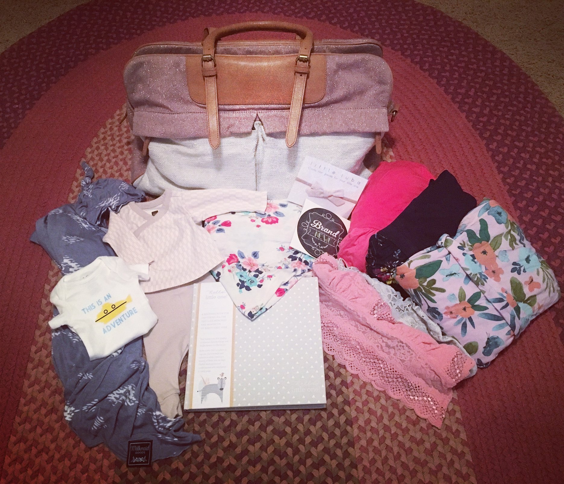 Pictured: Swaddle/ hat from Milkmaid goods for baby hospital photos, Adventure onesie as going home option #2, Tea Collection tan outfit as going home option #1, Milkmaid Goods nursing cover (IDK?), baby book for footprints, brand new sticker for photo, headband in case baby is a girl , 2 of those Target nightgowns (or in my case, going home dress), Milkmaid Goods robe, and 2 pretty/ comfy bras for labor or after or w/e.
