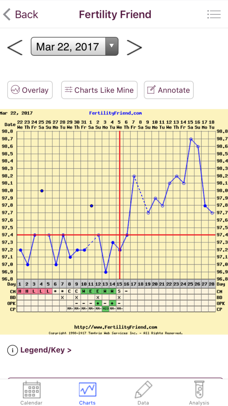 ugh and I can't get my chart to attach... I spotted CD 26 and tested with cheapies from CD35-40 all BFN. I've been waiting for AF but then got Ewcm and a positive opk CD47 and 48. So confused.