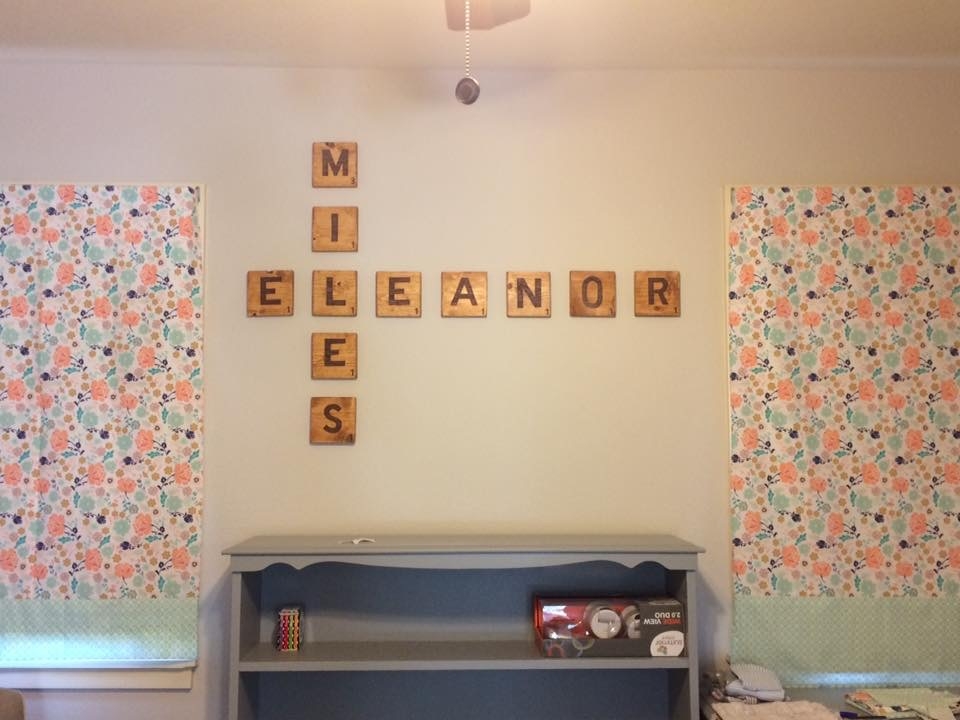 While he was napping earlier, I hung up our scrabble letters in the nursery and I absolutely love how they turned out. I still have to let down the hem on the left curtain, so ignore the unbalance between the two windows.