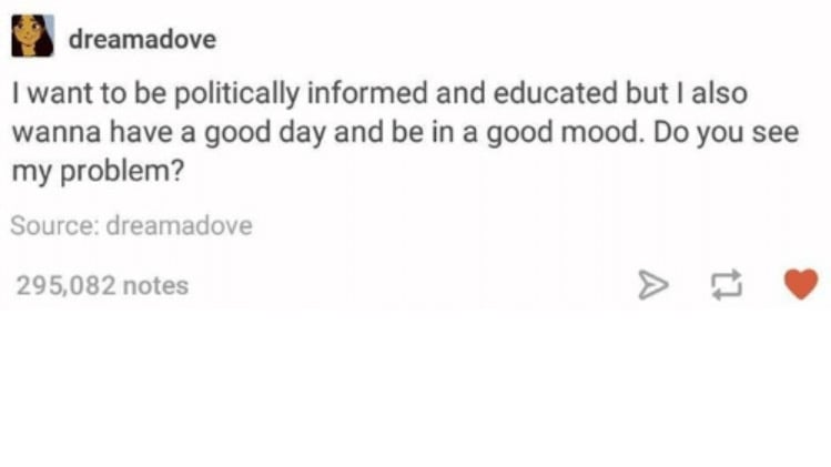 I tend to ignore the political talk also, not really a fan. It makes people treat other people so ugly. My most firm stance this last election was wow how the hell did we let this happen??
