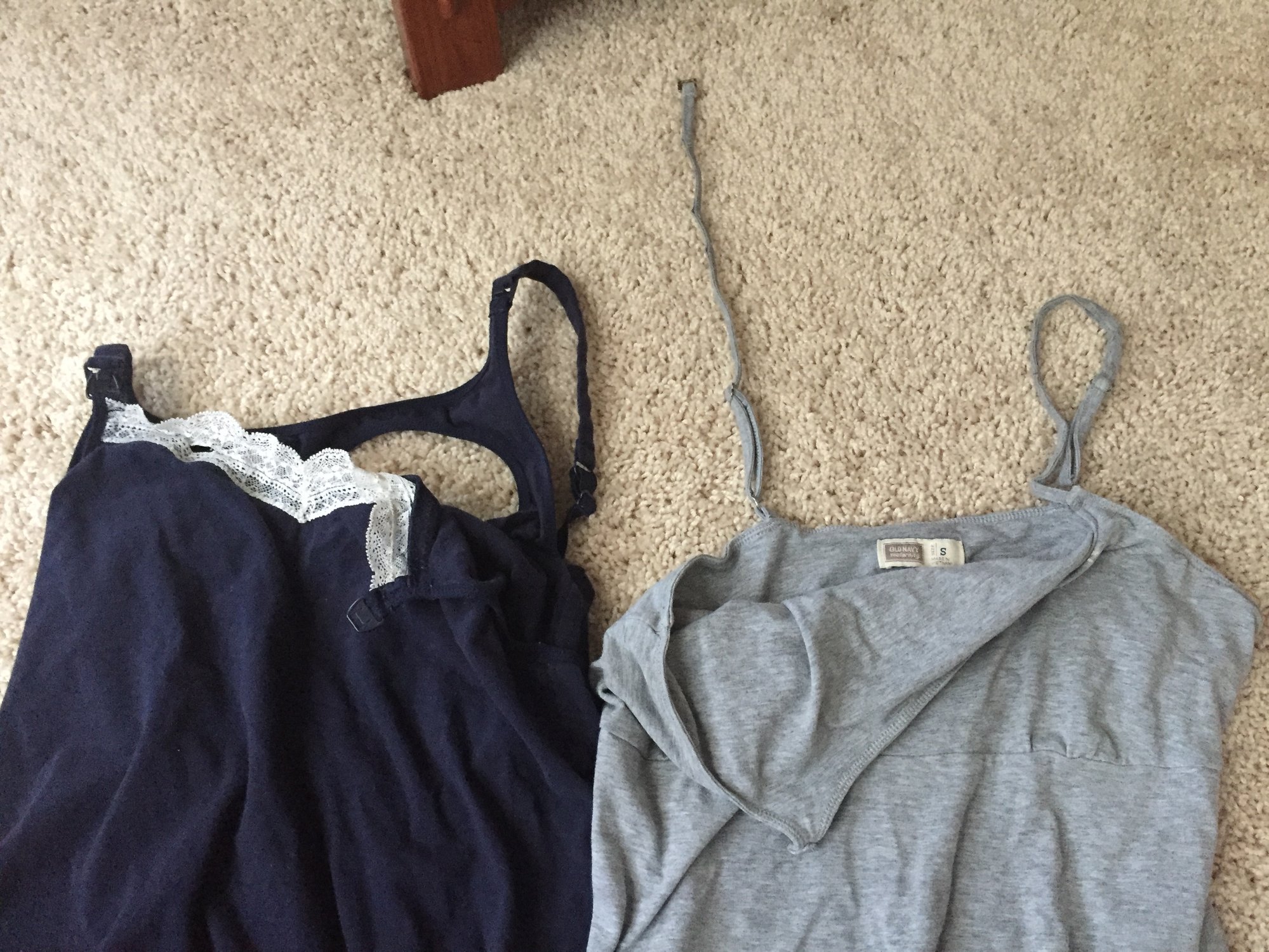 if you're going to use a cami that is a nursing cami (I personally don't see the reasoning in spending more money because it's labeled nursing) be mindful that some are like the blue one and you have to fish your boob through the hole after also doing the same thing from your nursing bra. A pain in the butt sometimes. And then some are like the grey which particularly suck because the strap comes all the way off and is hard to find again especially if you're layering like in the photo posted above.