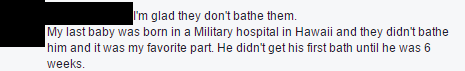 @SouthernMama15 @Nxy is that referring to a sponge bath? I know they're not supposed to receive a full/submerged bath until the umbilical stump falls off, but I can't imagine not bathing my child for 6 weeks! No bath is definitely a thing in the natural birth community; they love to leave the vernix on.