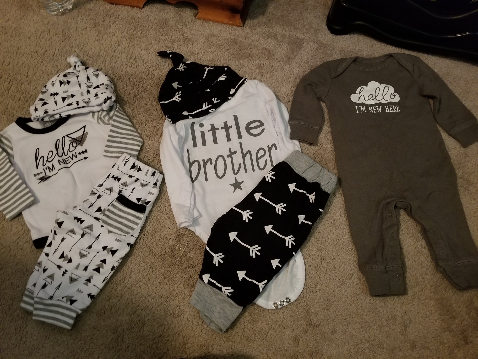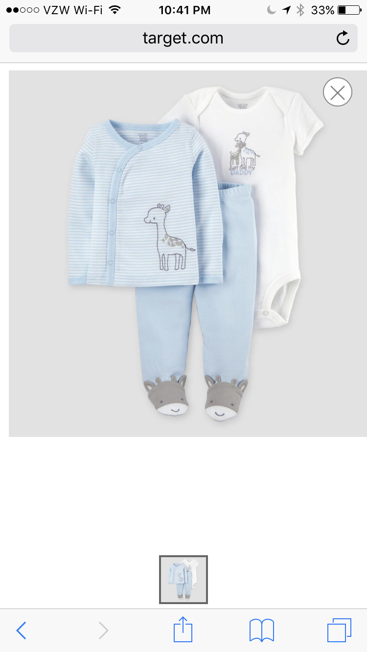 • All the outfits are absolutely adorable!! I still don't have a coming home outfit. I think we have decided to go out and buy an outfit for each gender and return the one that we don't use after baby is born. I honestly haven't even looked for one. It will more than likely be something with little woodland creatures on it. OB is predicting a larger baby so that's another factor. Newborn or 0-3 months?? I've had 2 big baby's and one average weight. I'll probably end up with 4 outfits due to needing to get the right size. Which means I also can not wash them. I don't know what to do?? Maybe baby can come home in a cute onesie and swaddle blanket??
