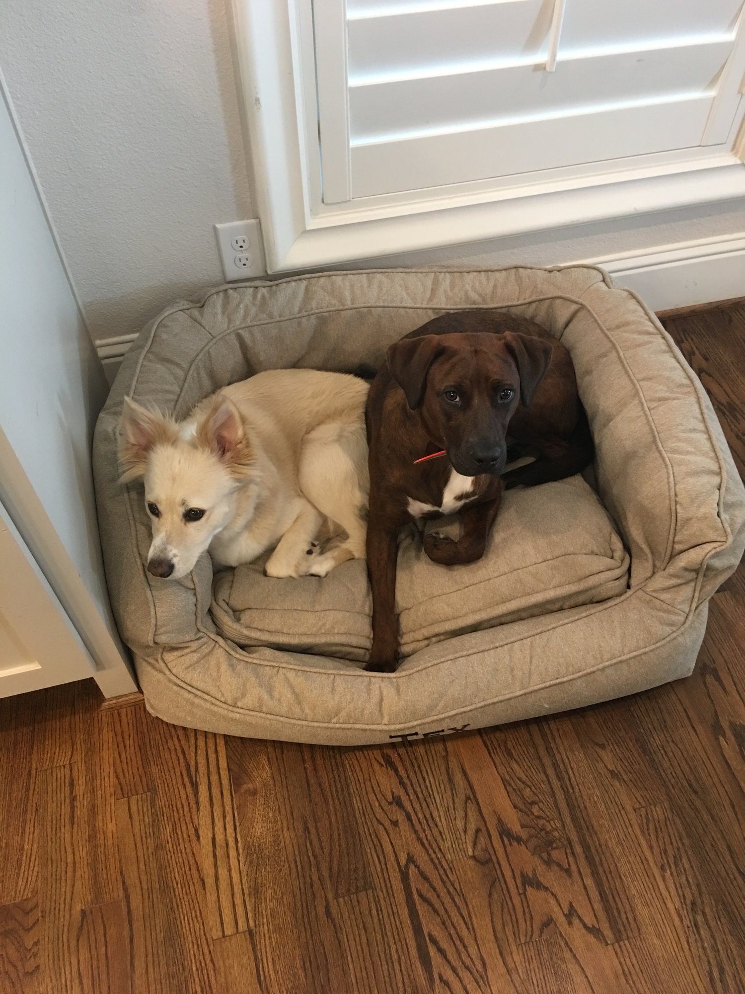 GTKY: Do you have any fur babies? (Pics encouraged!) Heck yes! Two rescue pups (one we got a year ago today!!). Tex(brown) and Maggie (white) - they have a love/hate relationship.