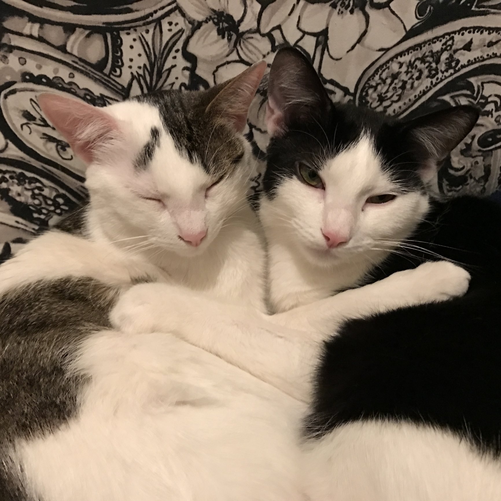 theyre the cutest. Only about a year old. I think they'll adjust just fine. The black and white one may be spooked by the loud crying but they are good kitty's.
