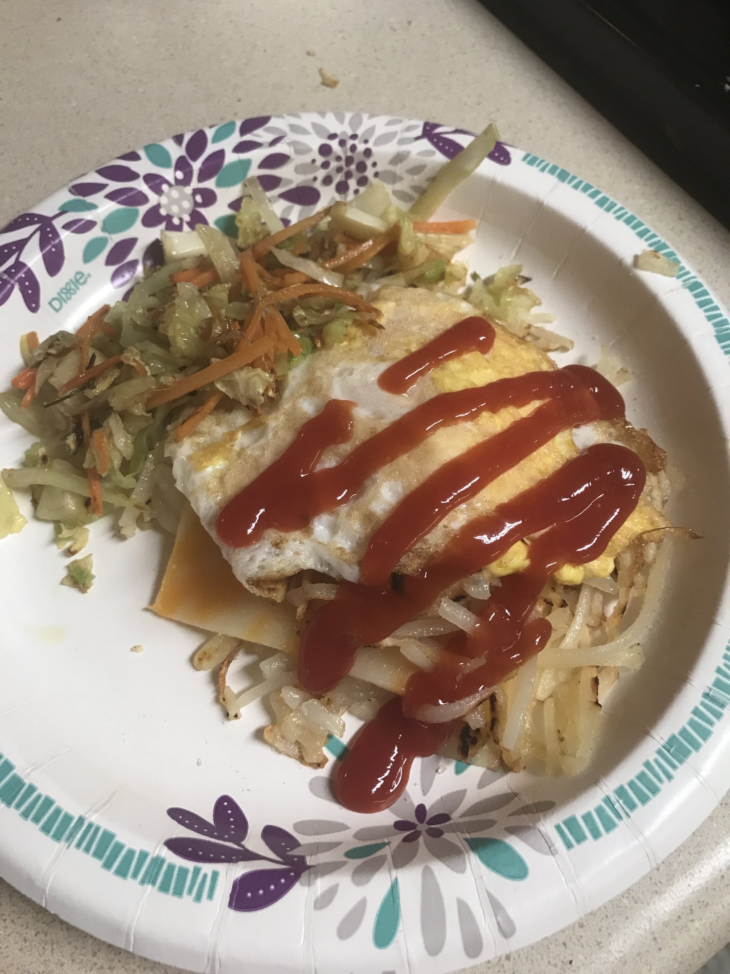 Does this lunch make make me look pregnant? I don't know why this hit the spot, but man did it ever. Lol hashbrowns, cheese, fried egg, sautéed cabbage with ketchup on top.