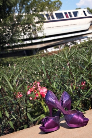 ~I knew I wanted purple shoes. I tried so many and fell in love with these. They were a size too big so the morning of the wedding we padded them to make them fit. I love that my photographer got the monorail in the background!