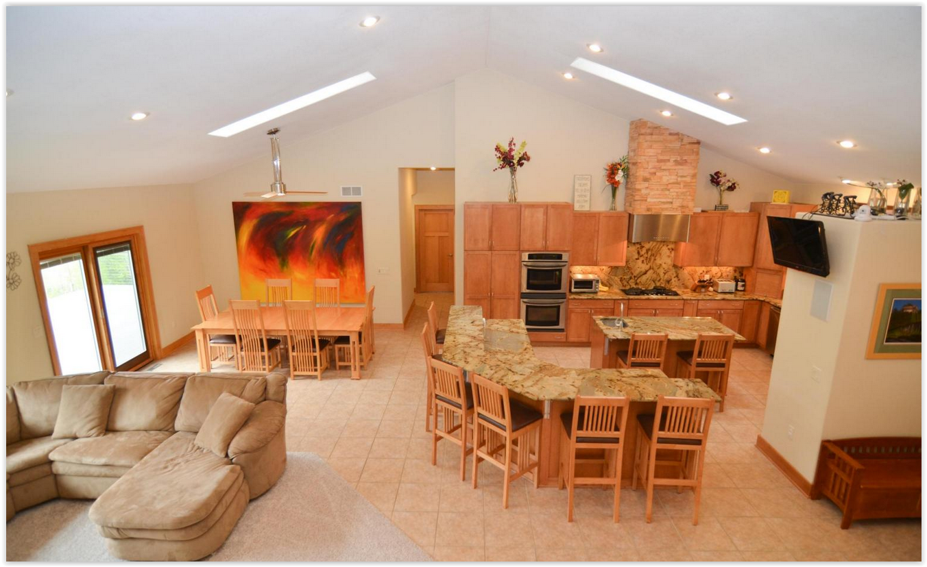 • The house DH and I bought last year is pretty close to our dream house- it's a 4 bedroom, 3 bathroom ranch with an open concept kitchen/living area and finished basement with a bar (DHs selling point)! Things I would like to add- a bigger mudroom from the garage, making the basement a walk -out and a better view. While we like our subdivision more acreage with a view would be great.