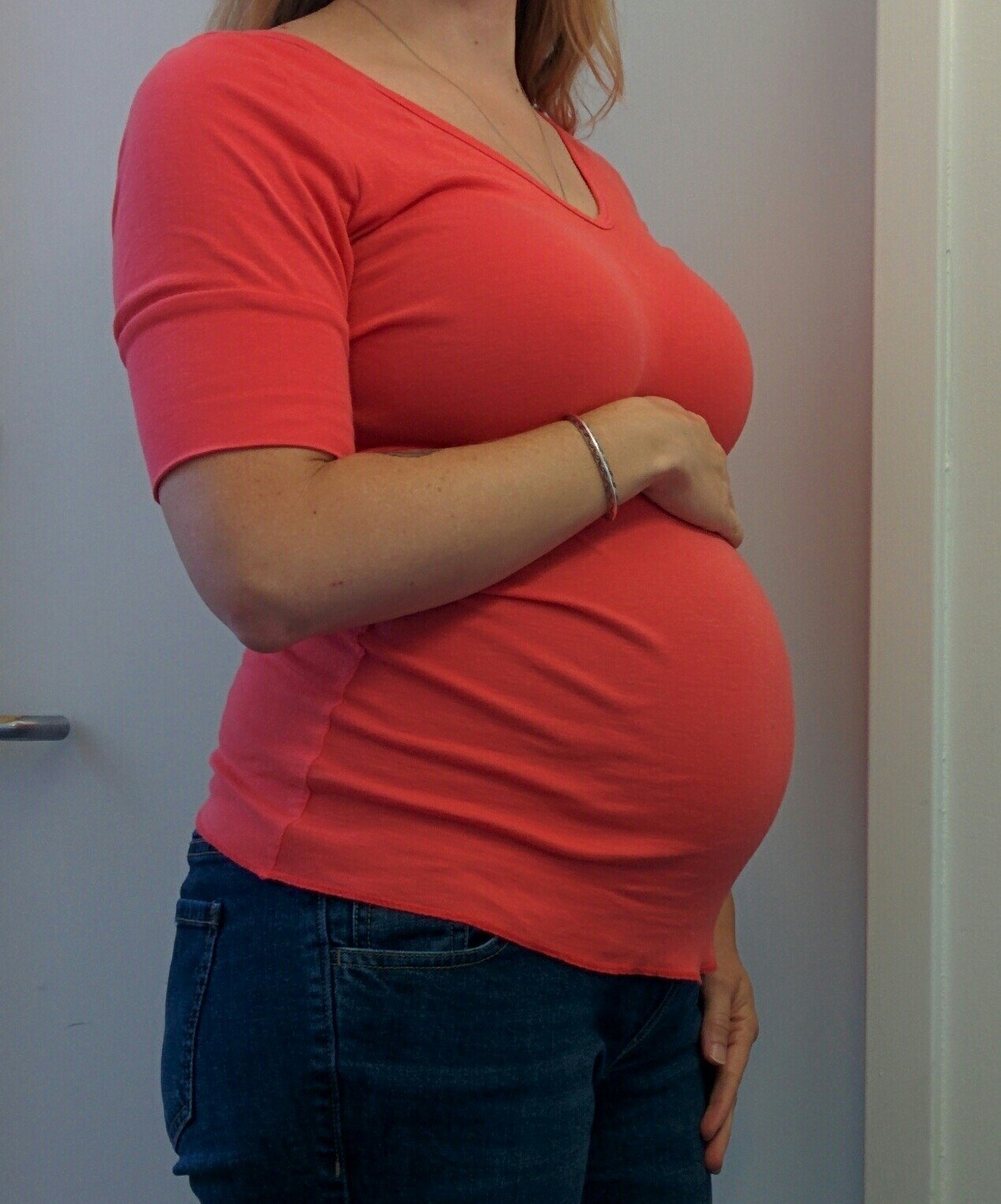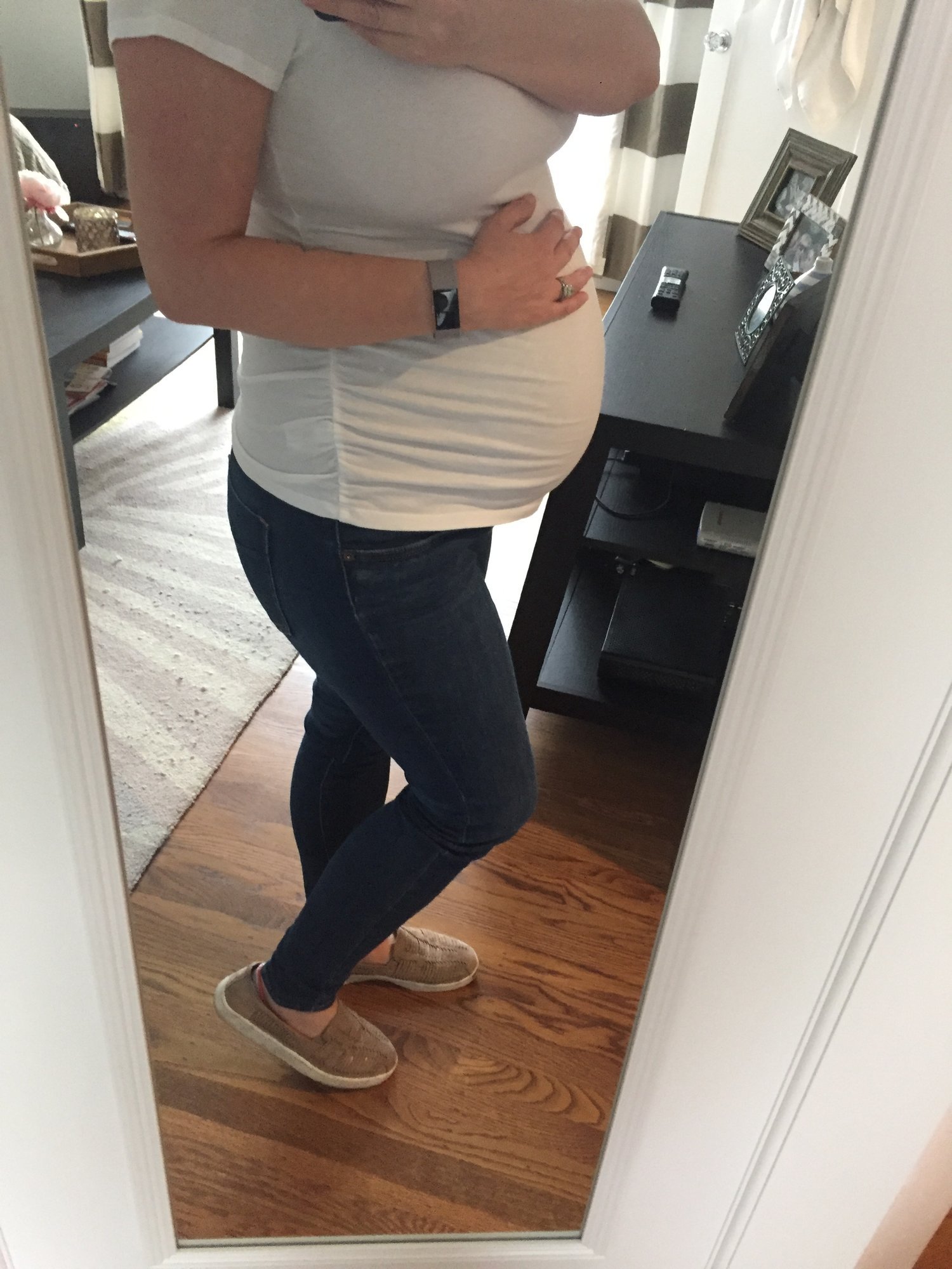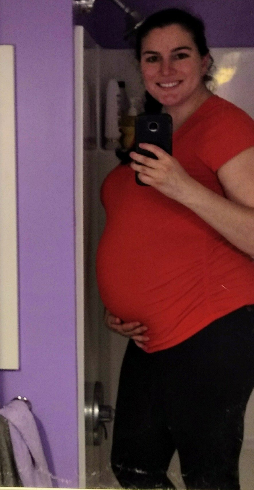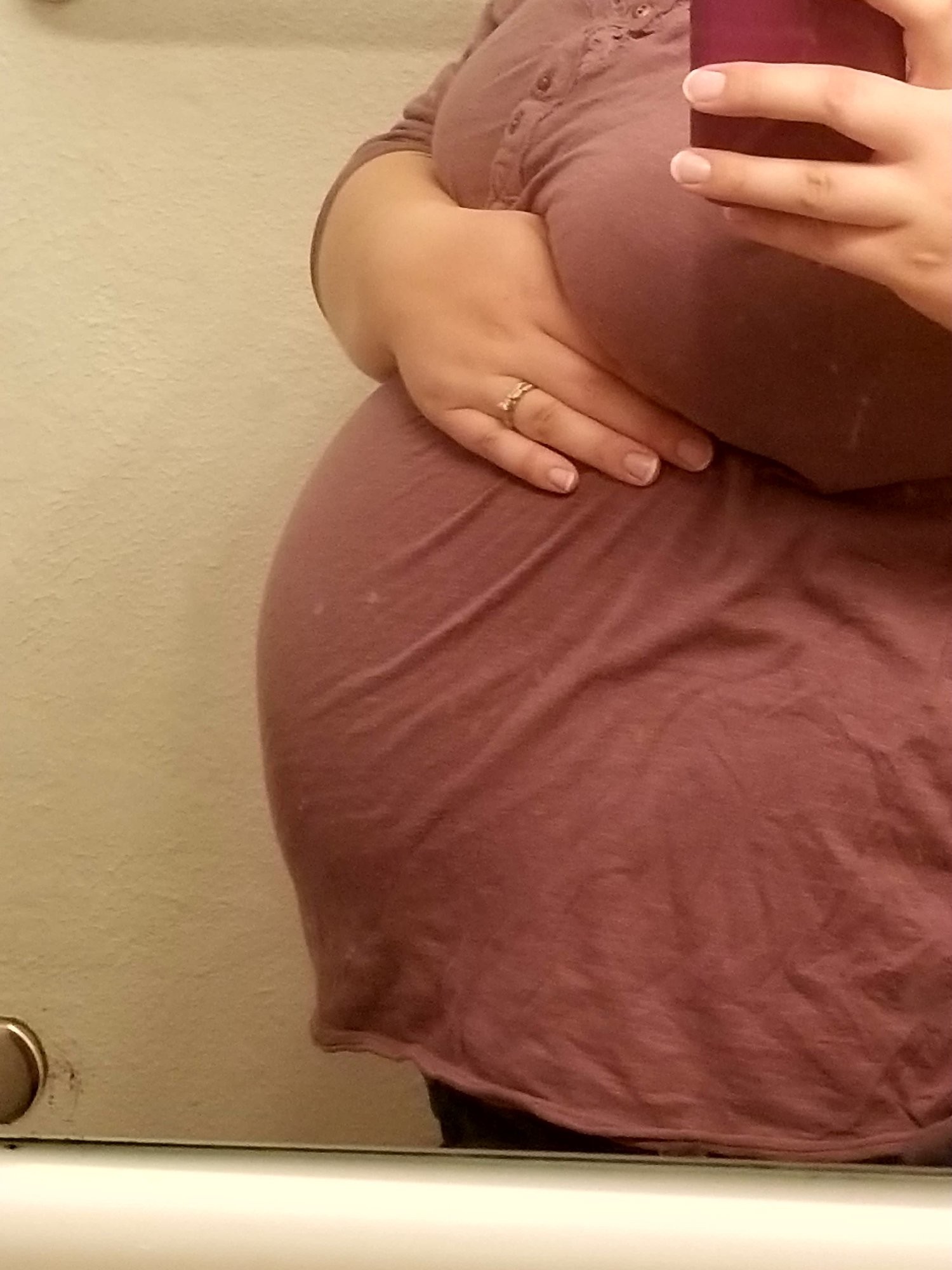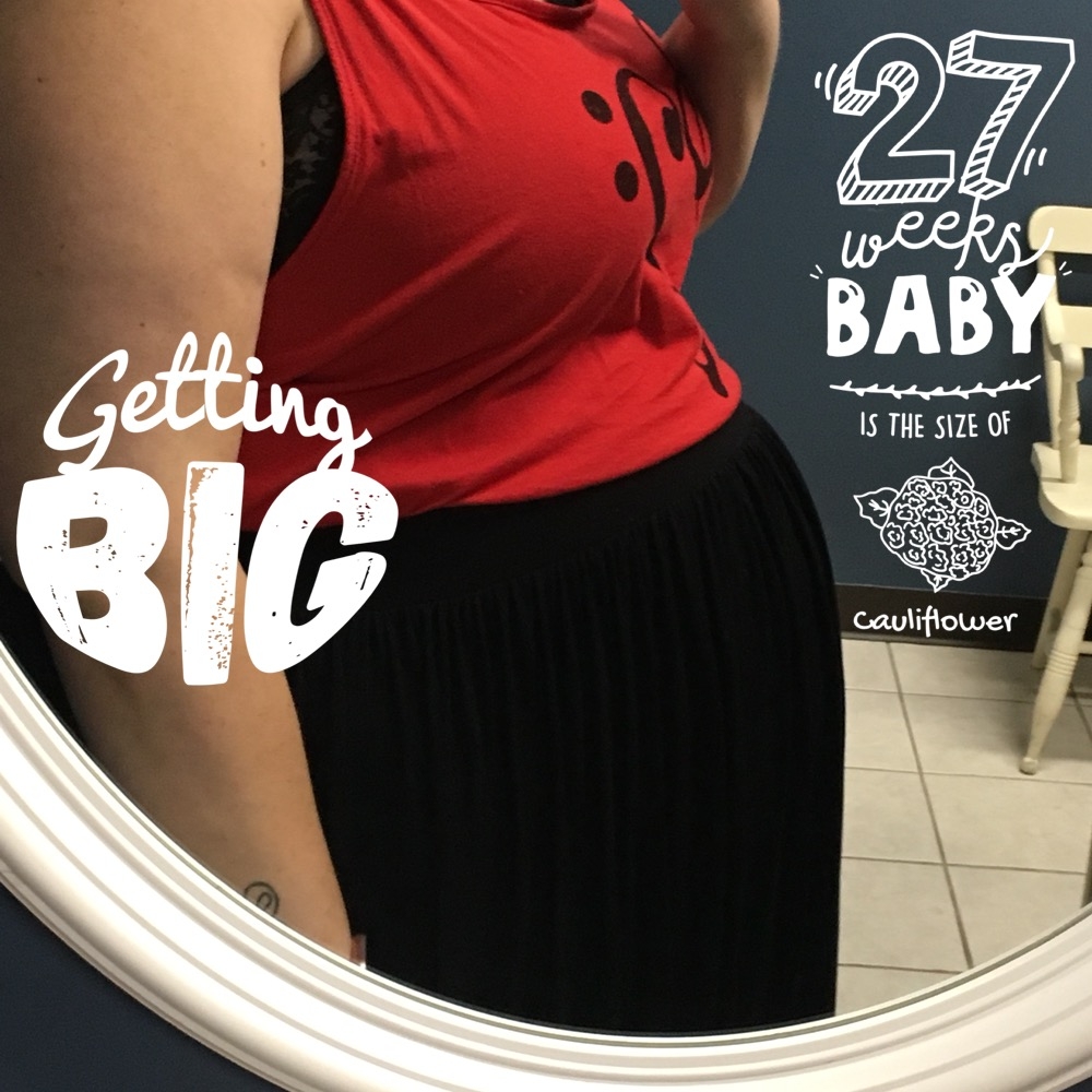 27 weeks 5 days... don't mind the food spots on my shirt, which has become a constant companion at every meal...even at 10am.