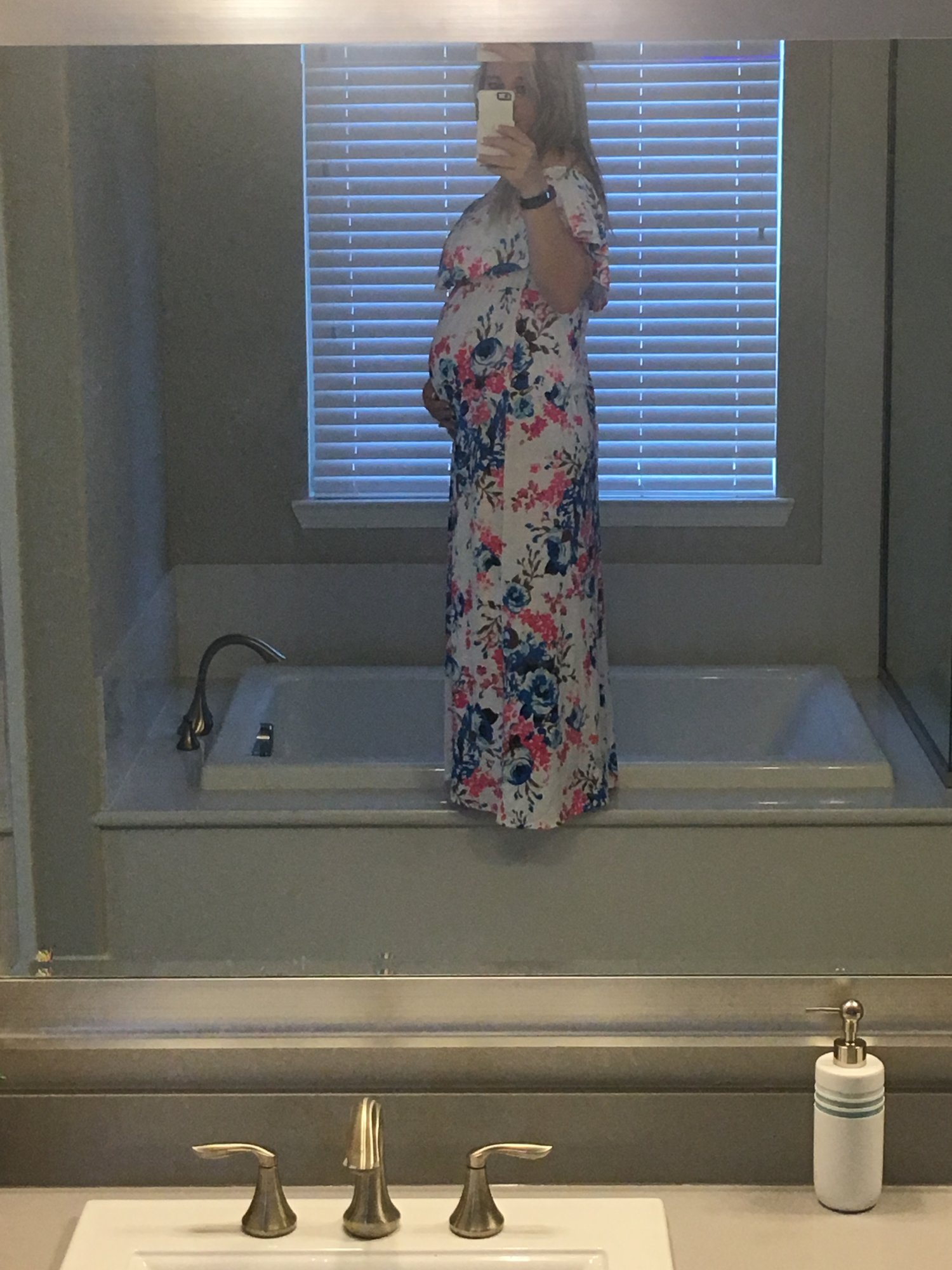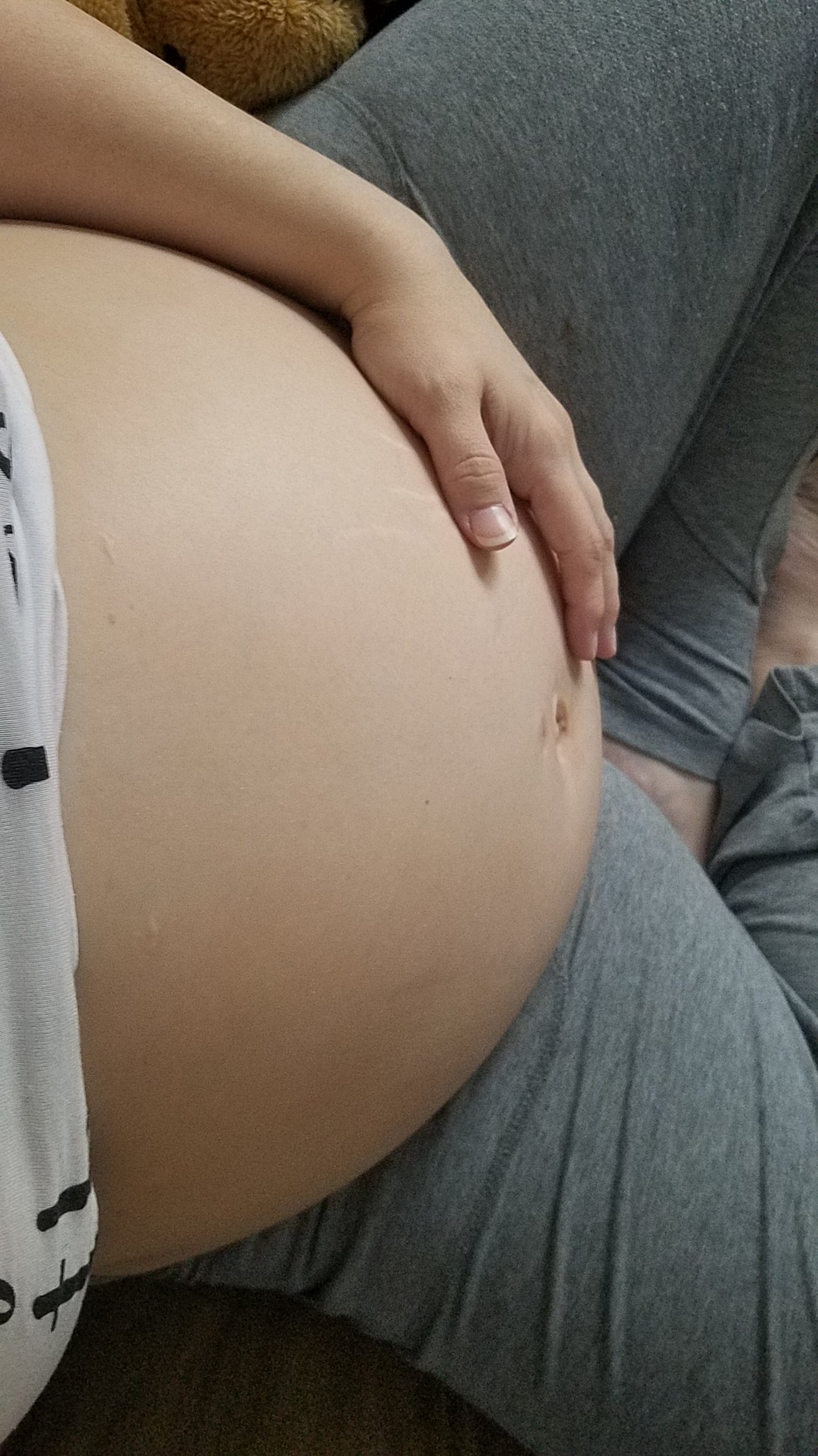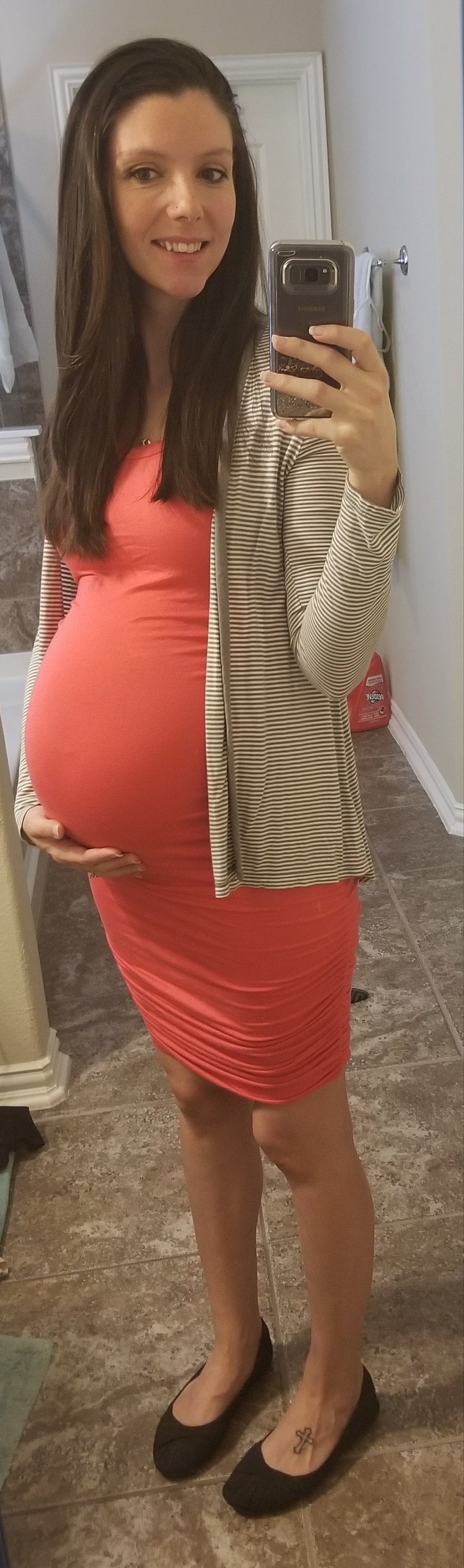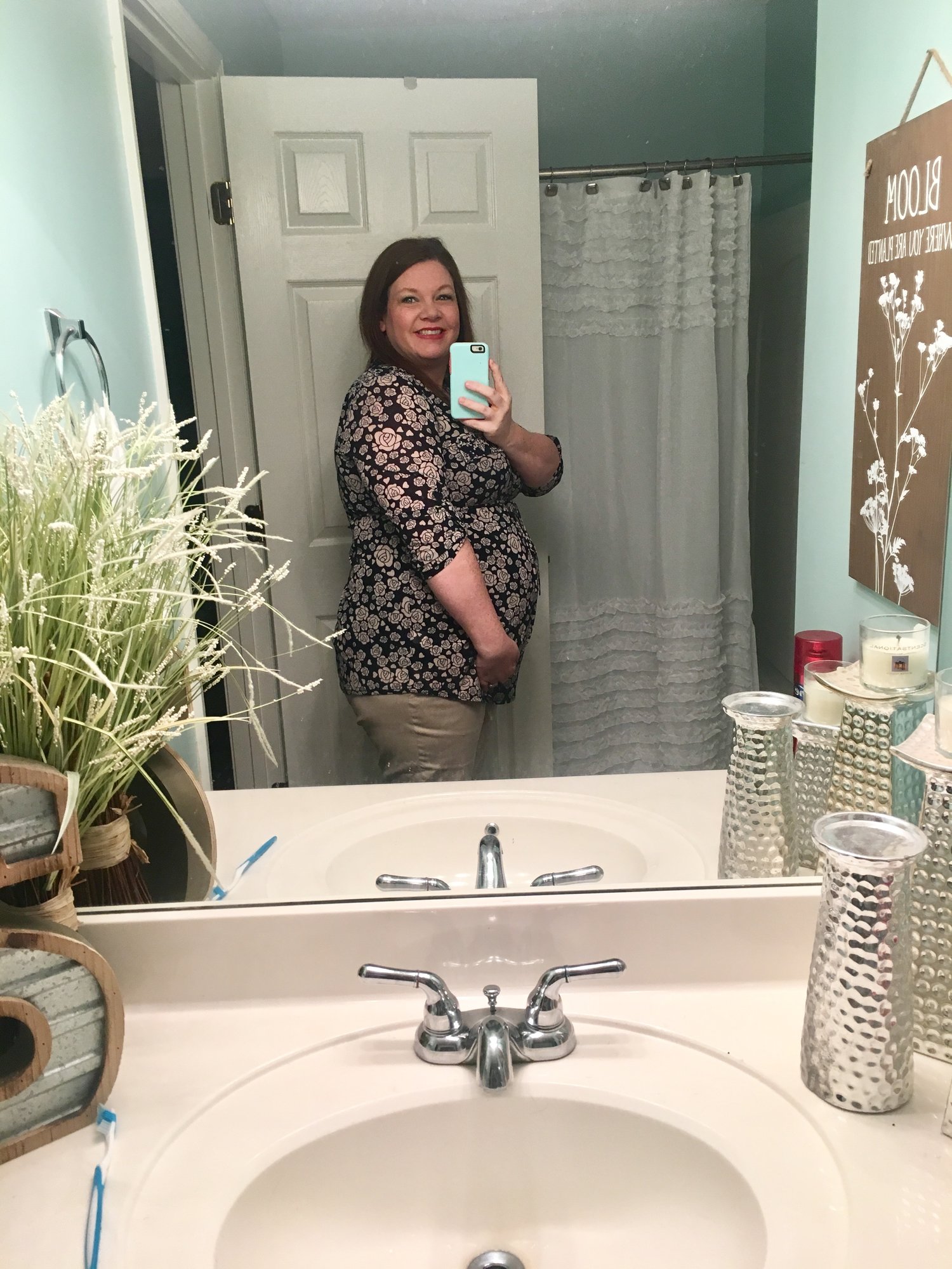 27 weeks 5 days... don't mind the food spots on my shirt, which has become a constant companion at every meal...even at 10am.