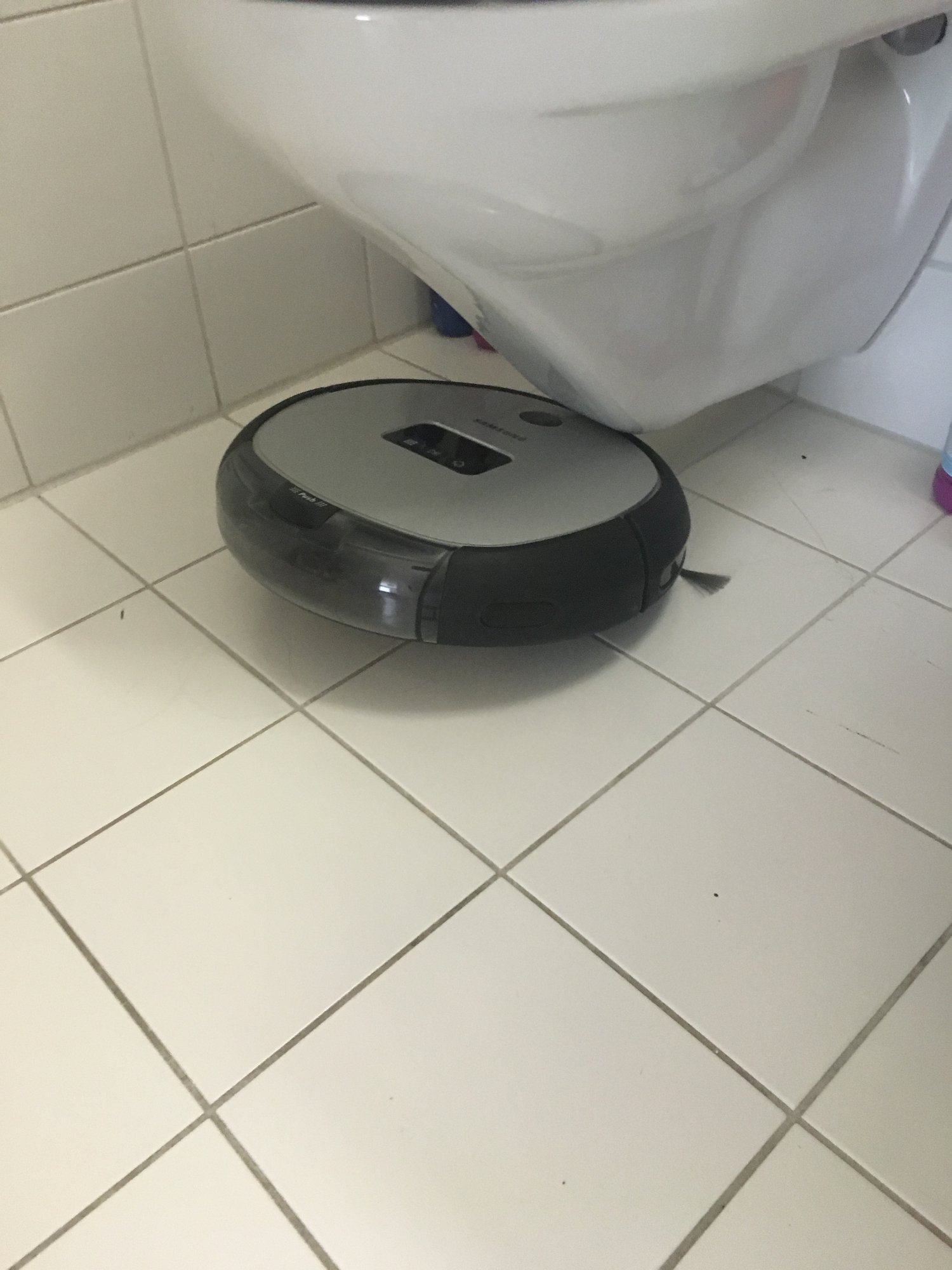 This is Gizmo stuck under the toilet. It's always hilarious when we come home and it's not on it's base- we wonder around the house going "Gizmo, where are you?" This is a regular spot he gets stuck. Yes, I know we are crazy!