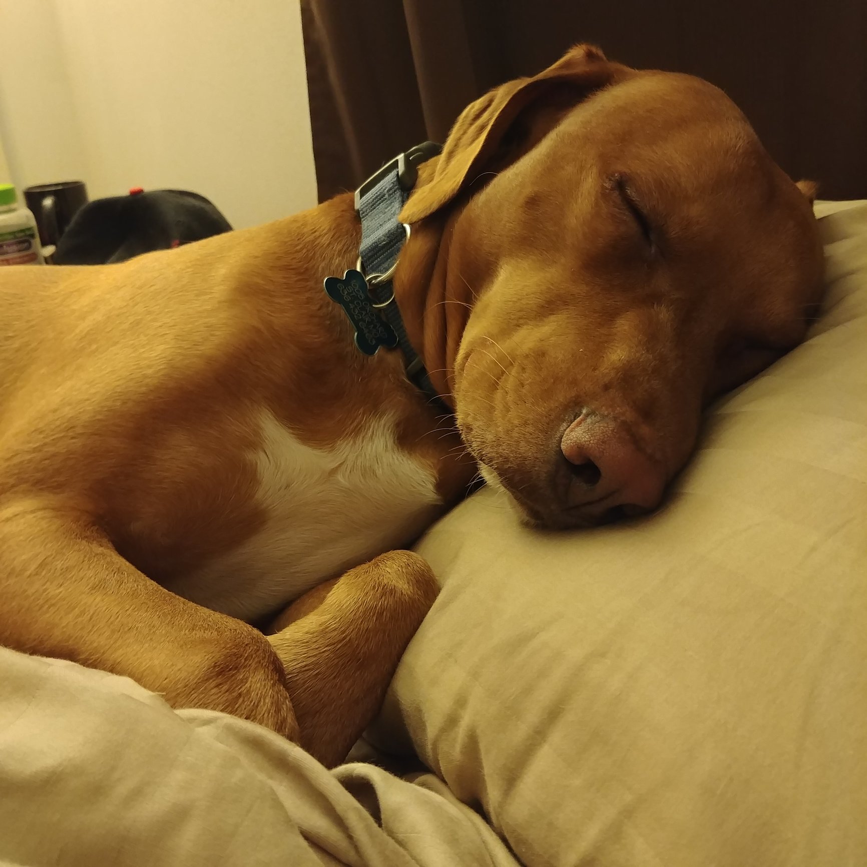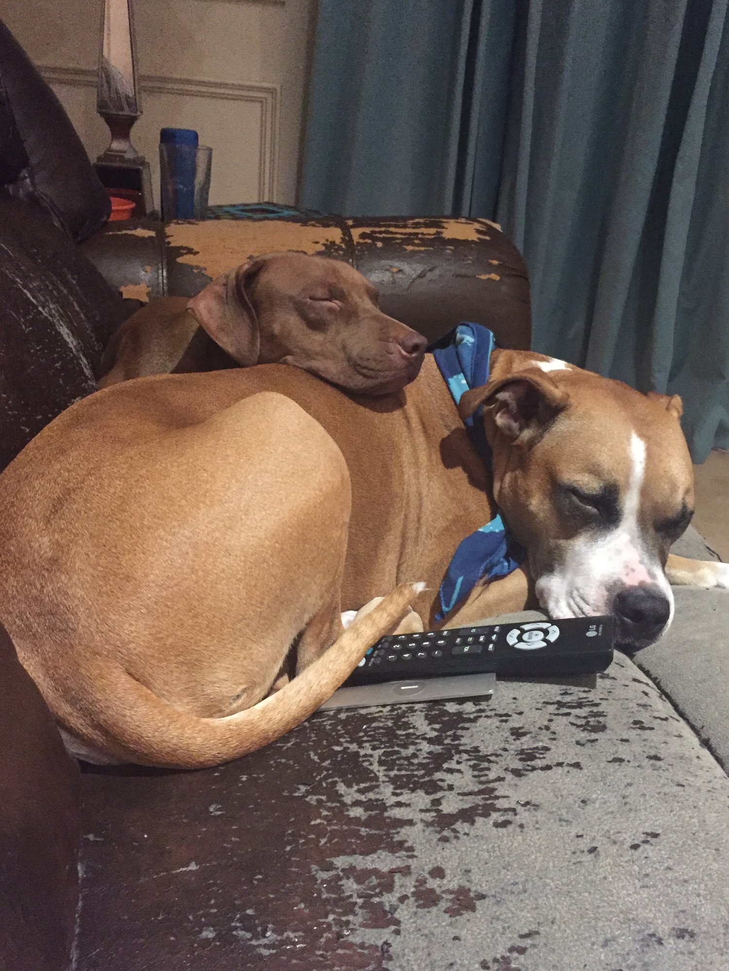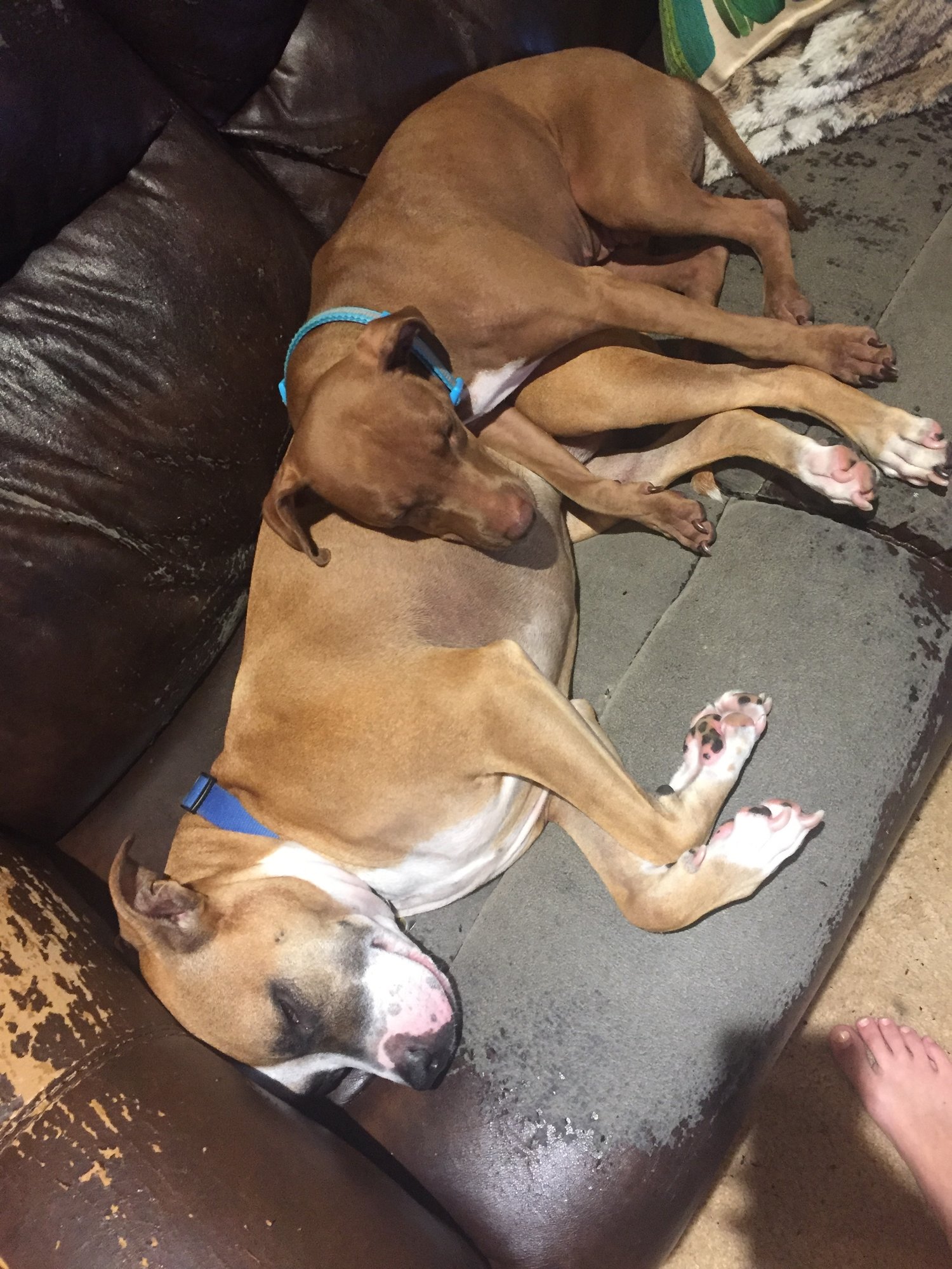 Zara the pit bull mix and Cruz the vizsla (?) mix. We adopted them both, Cruz just a few months ago. She hadn't ever been in a house before and was afraid of EVERYTHING. She attached herself to Zara like glue. They love each other sooooo much it's so adorable- they lay like this every night!
