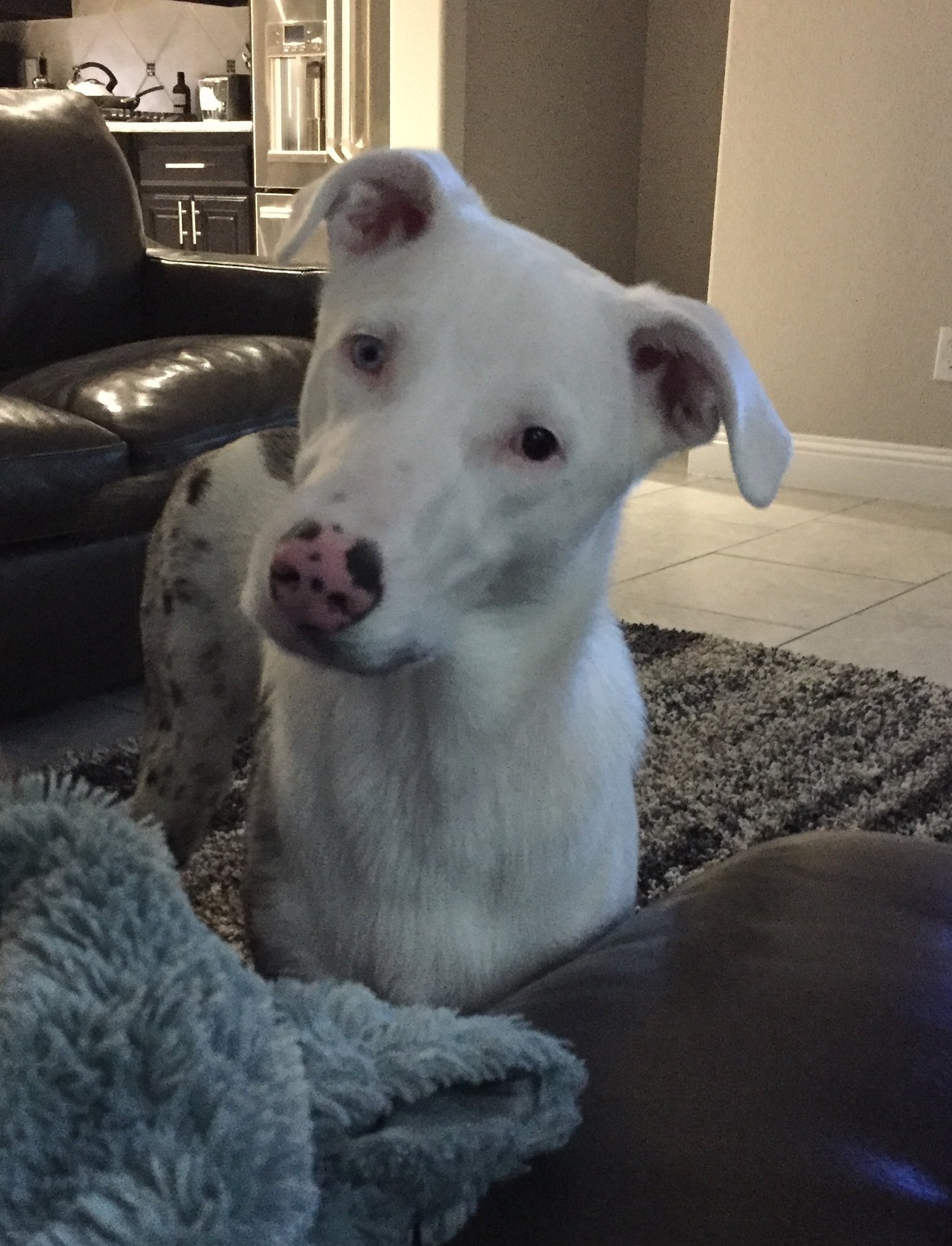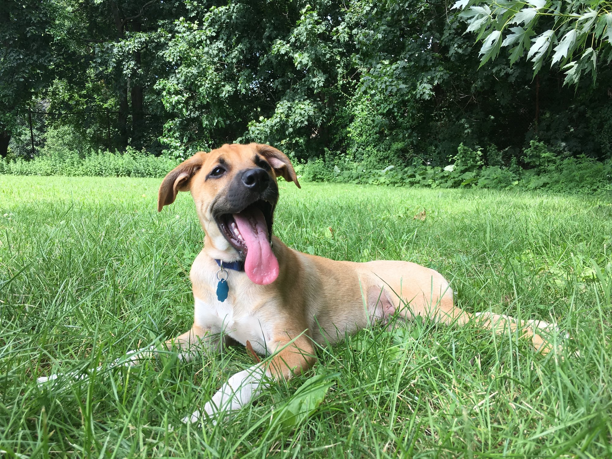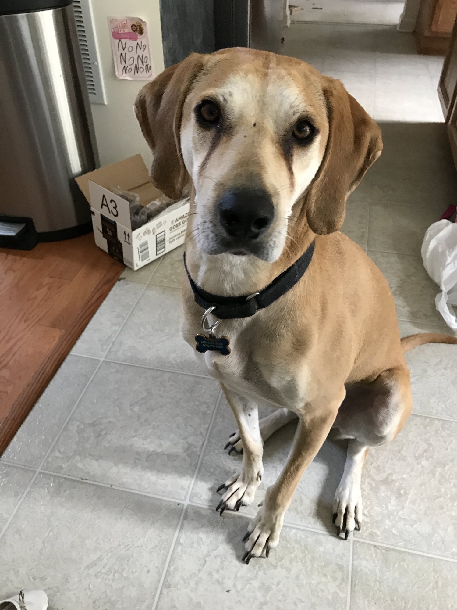 This is Jack. He's earned his nickname, Jackass. His favorite activities include going on adventures (we don't have a fenced yard), standing on the table to eat the girls leftovers, ripping open trash bags, and walking into a room with people in it just to crop dust. We adopted him about 3 years ago. He is so, so good with kids and I love the level of responsibility he has given my 6 year old.