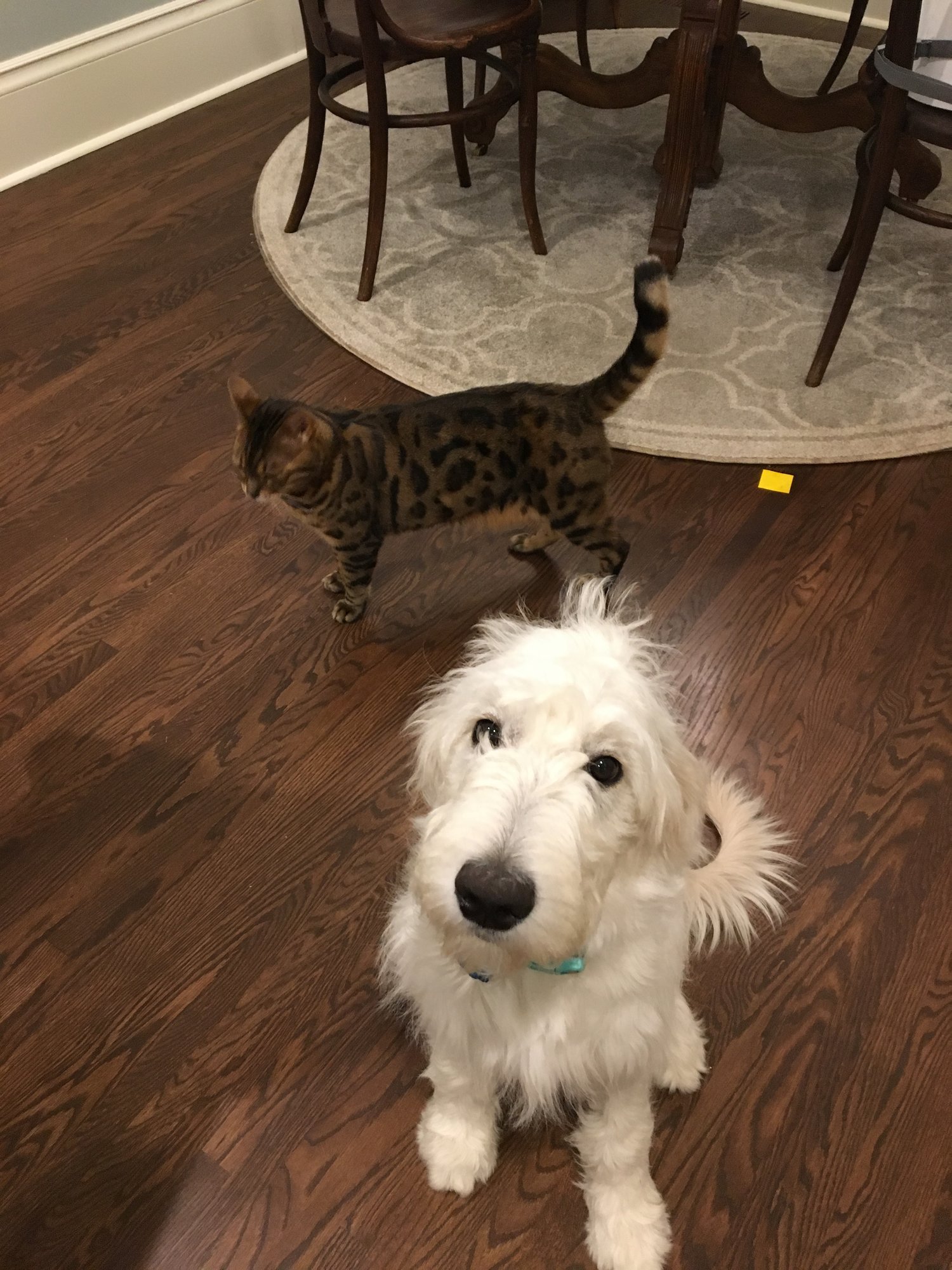 Here's my dingos. Cat Mercutio is a Bengal. I call him my super model because is so beautiful but does the dumbest stuff, lol. And Chloe is our latest addition, 5mo Golden Doodle. We lost two dogs last year and our house felt empty, so even though adding a puppy and a baby is insanity - we went for it!