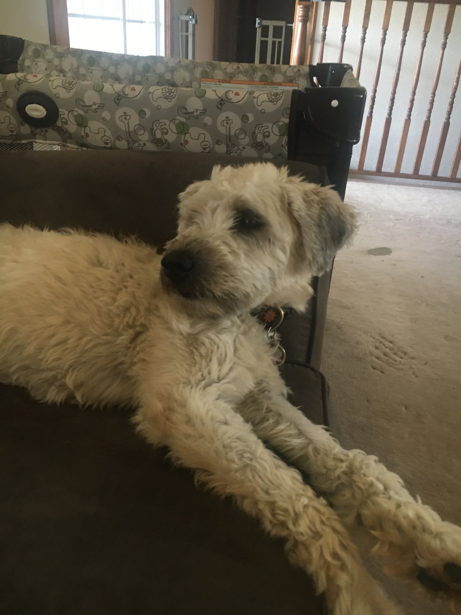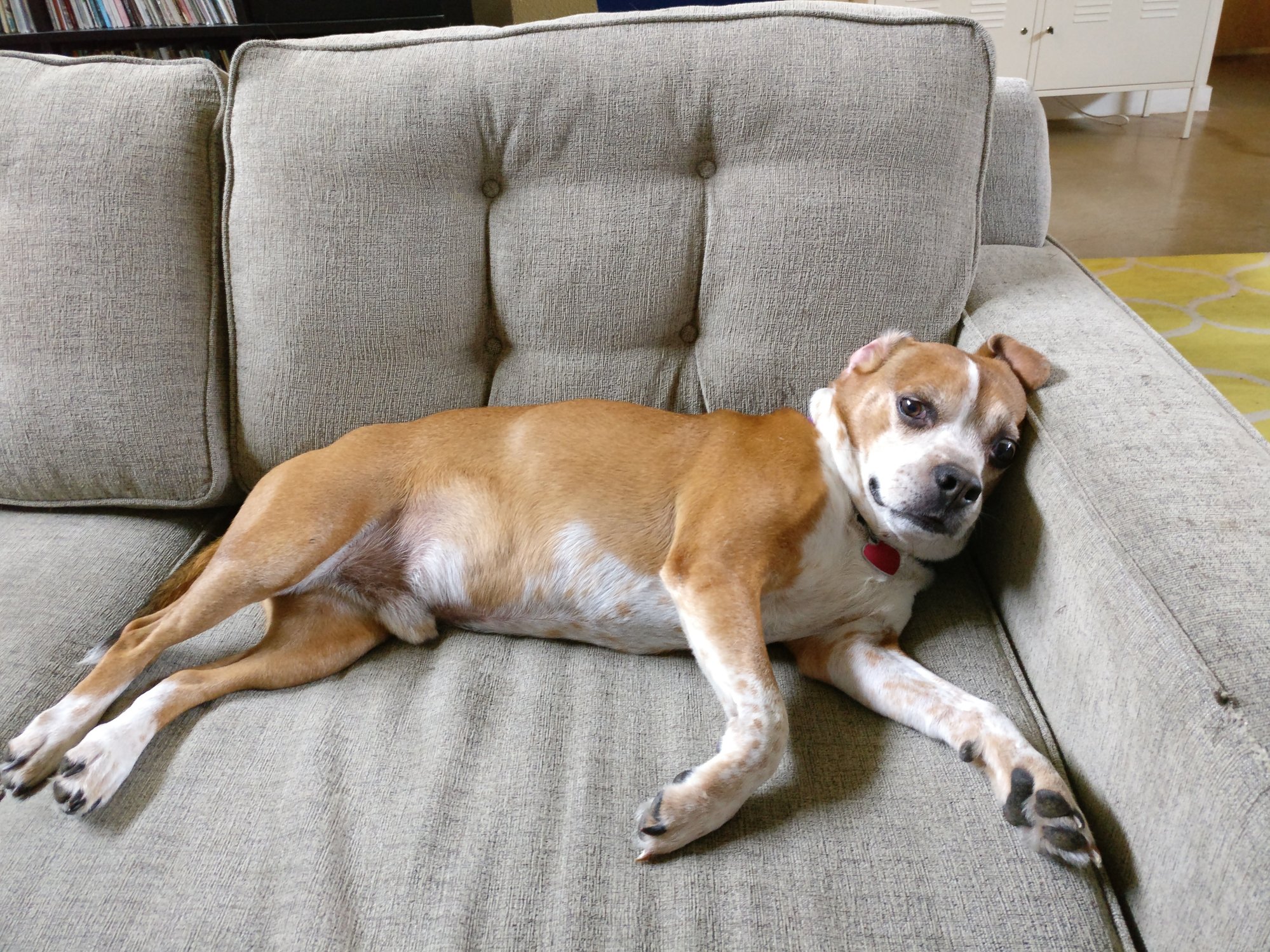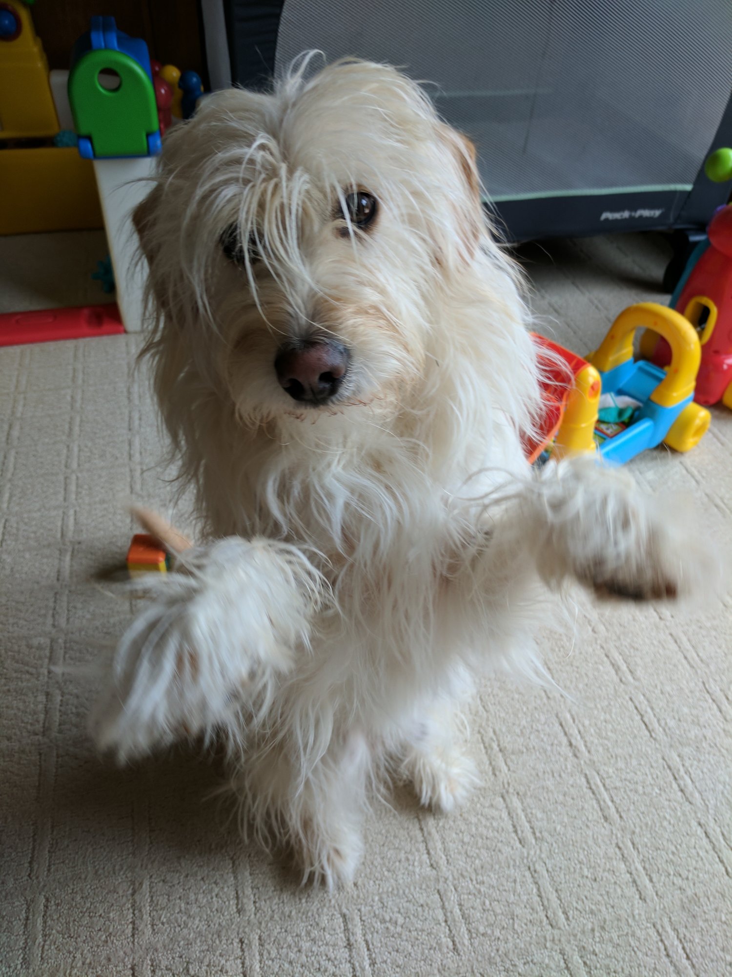 His favorite activities include going on adventures (we don't have a fenced yard), standing on the table to eat the girls leftovers, ripping open trash bags, and walking into a room with people in it just to crop dust.