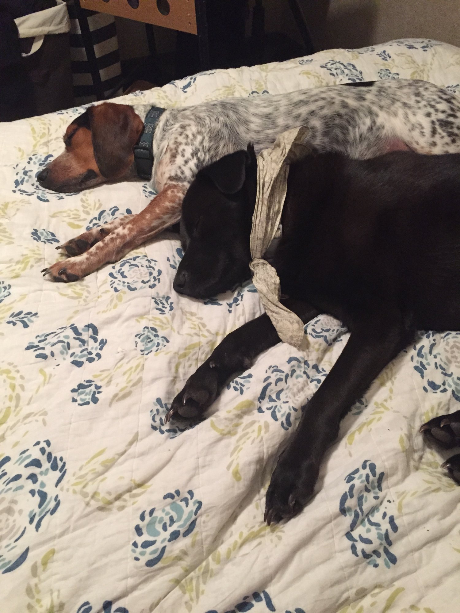 I love this! Im mobile so I hope this pic is normal sized. The spotted one is Annie and the black one is Kingsley. My two mutts. We are crazy dog parents. They sleep with their heads on our pillows at night.