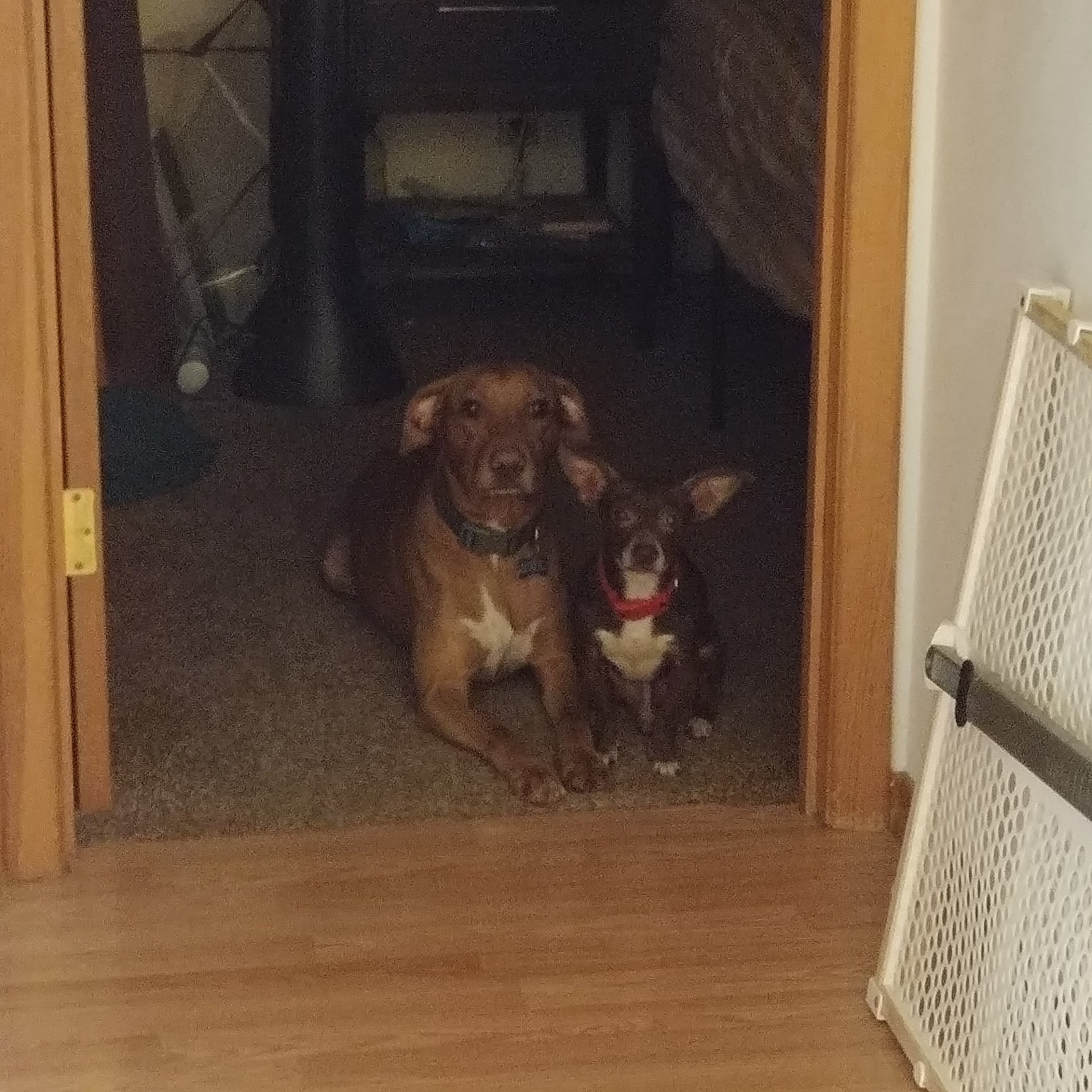 This is Marley who is a pit lab mix and Kokomo who is a chihuahua dachshund mix.