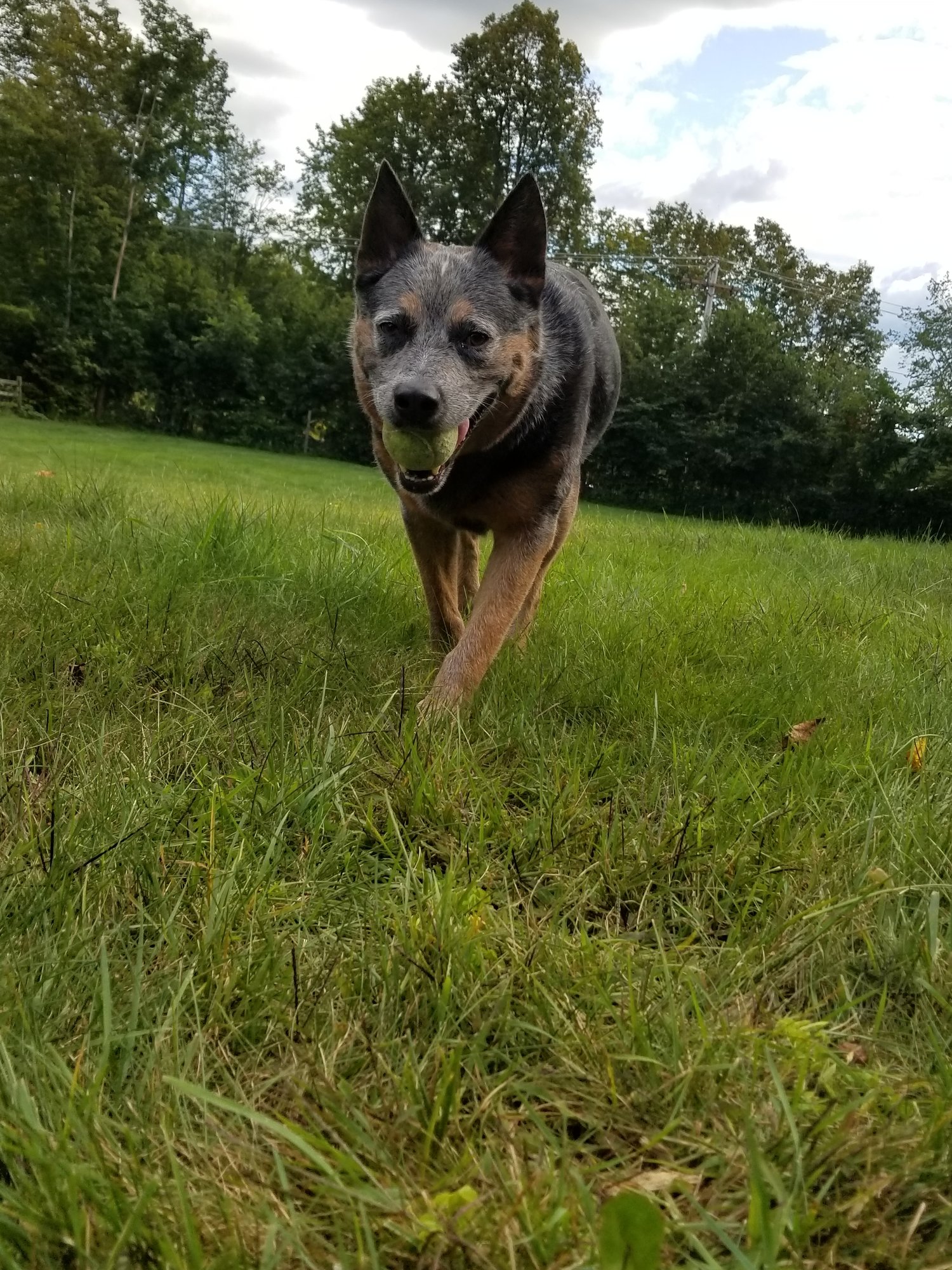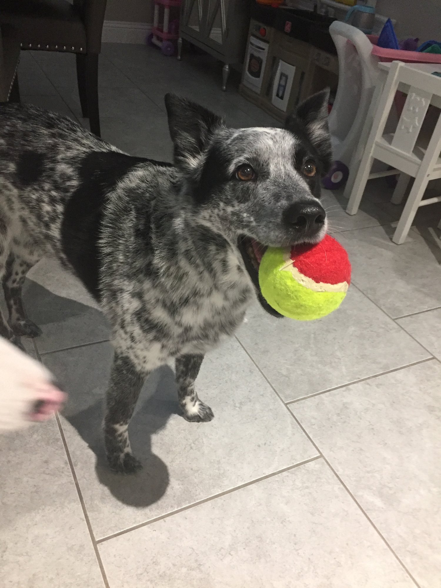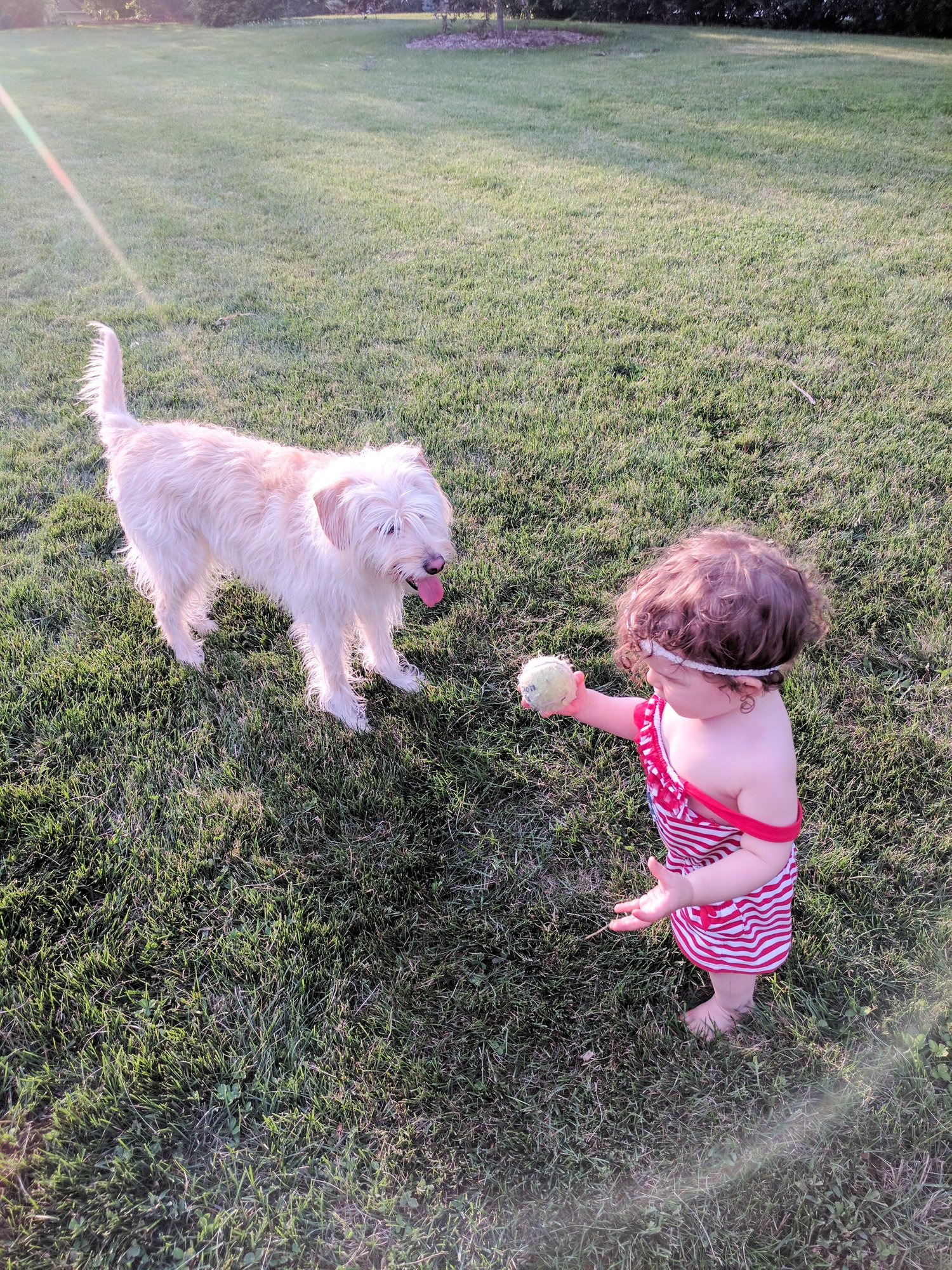 Here's my Luna playing ball with my daughter this summer and another photo of her wanting to hold hands. She is a 5 year old rescue pup and the sweetest smartest dog I know. We did a doggy DNA test on her since we wanted to know her breed(s) and it turns out she's mostly lab and Schnauzer and the rest boxer, German Shepard, and beagle. She badly ruptured a disc in her spine a few years ago and was paralyzed from it. Fortunately emergency spinal surgery was able to repair her and she's back to her spunky self.