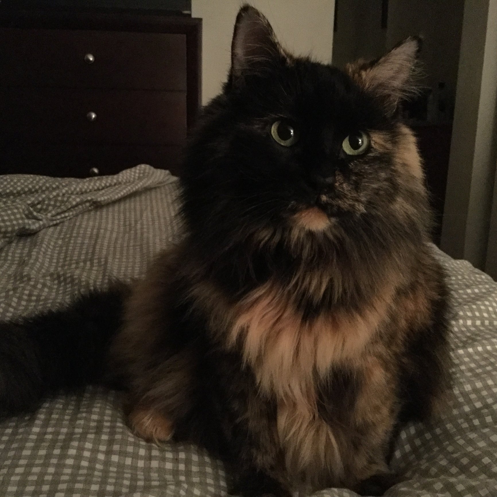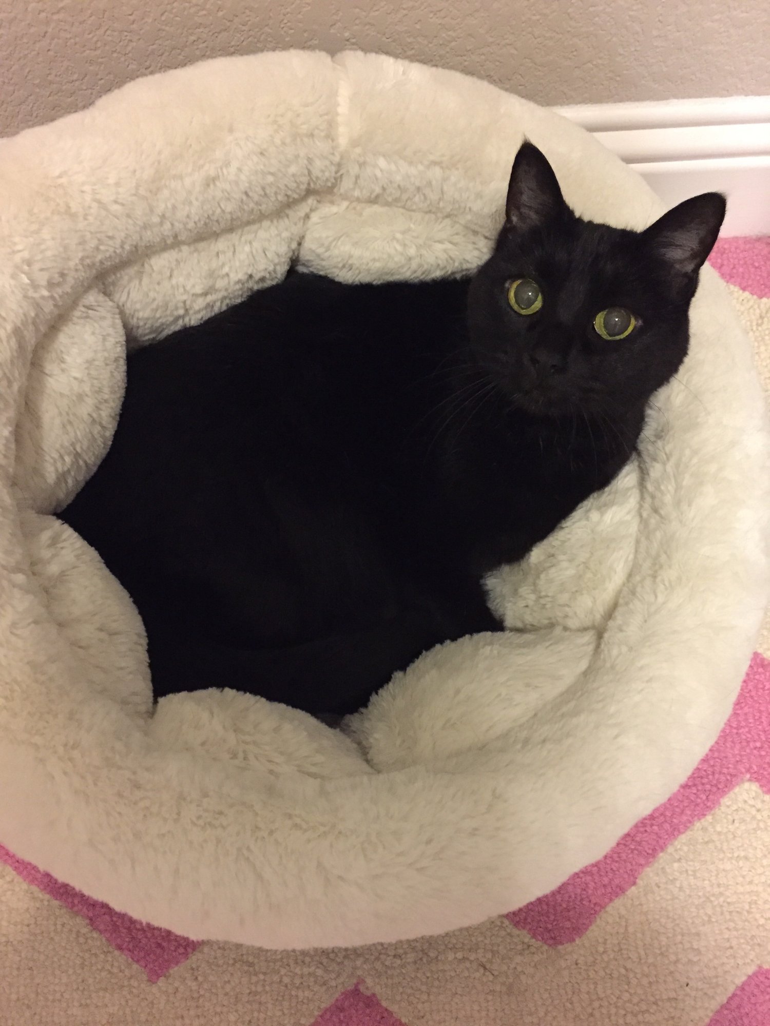 This is Cleo. I rescued her about 8 years ago when she was a feral kitten living on the streets. She is calm, aloof, sweet, cuddly, and hates Louie. She's not bad with the kids but she doesn't seek them out. I'm her favorite. Which makes sense because I had her before I had any other living being in the house.